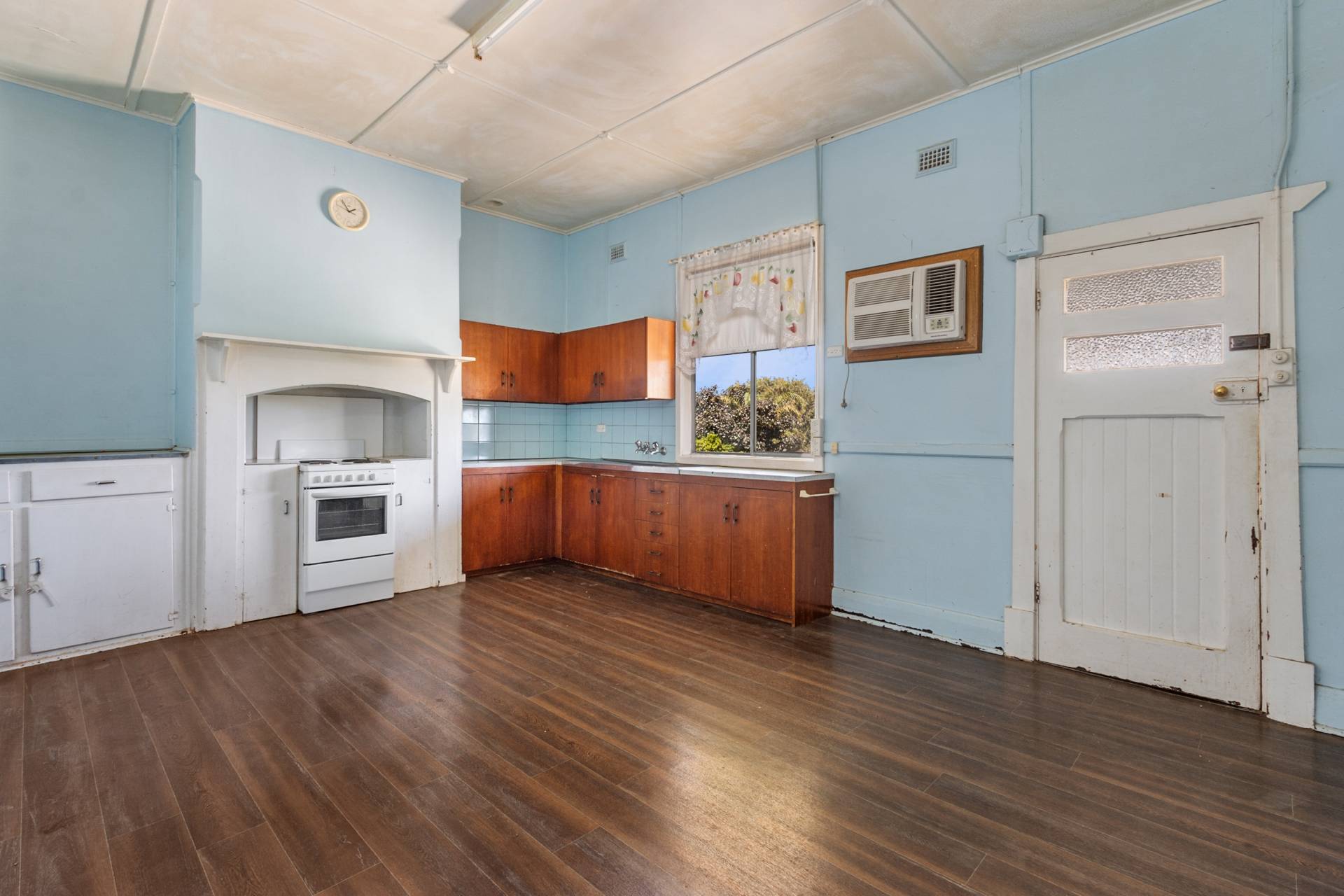 - Kitchen with electric cooking and wall air conditioner