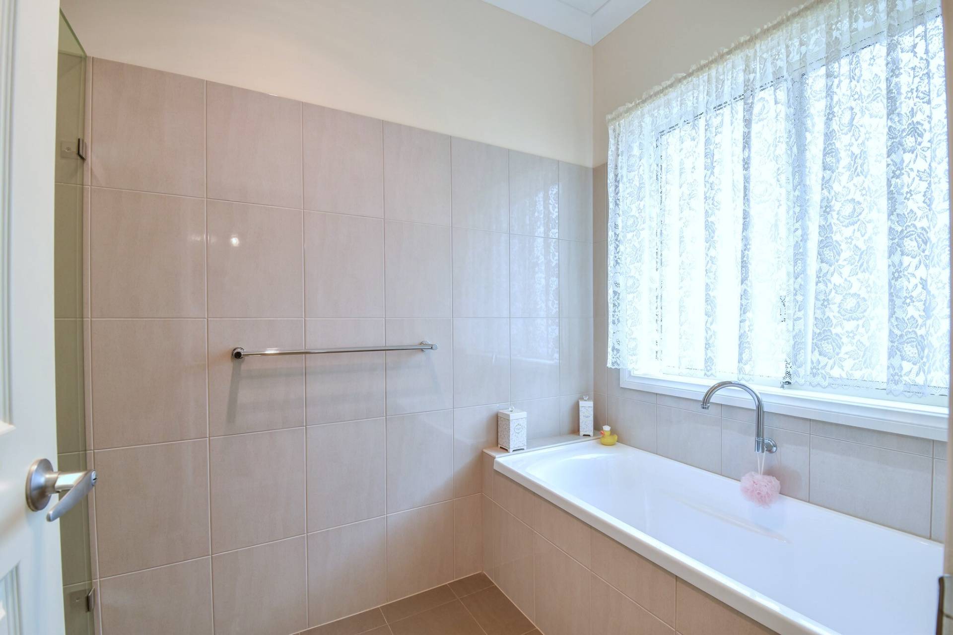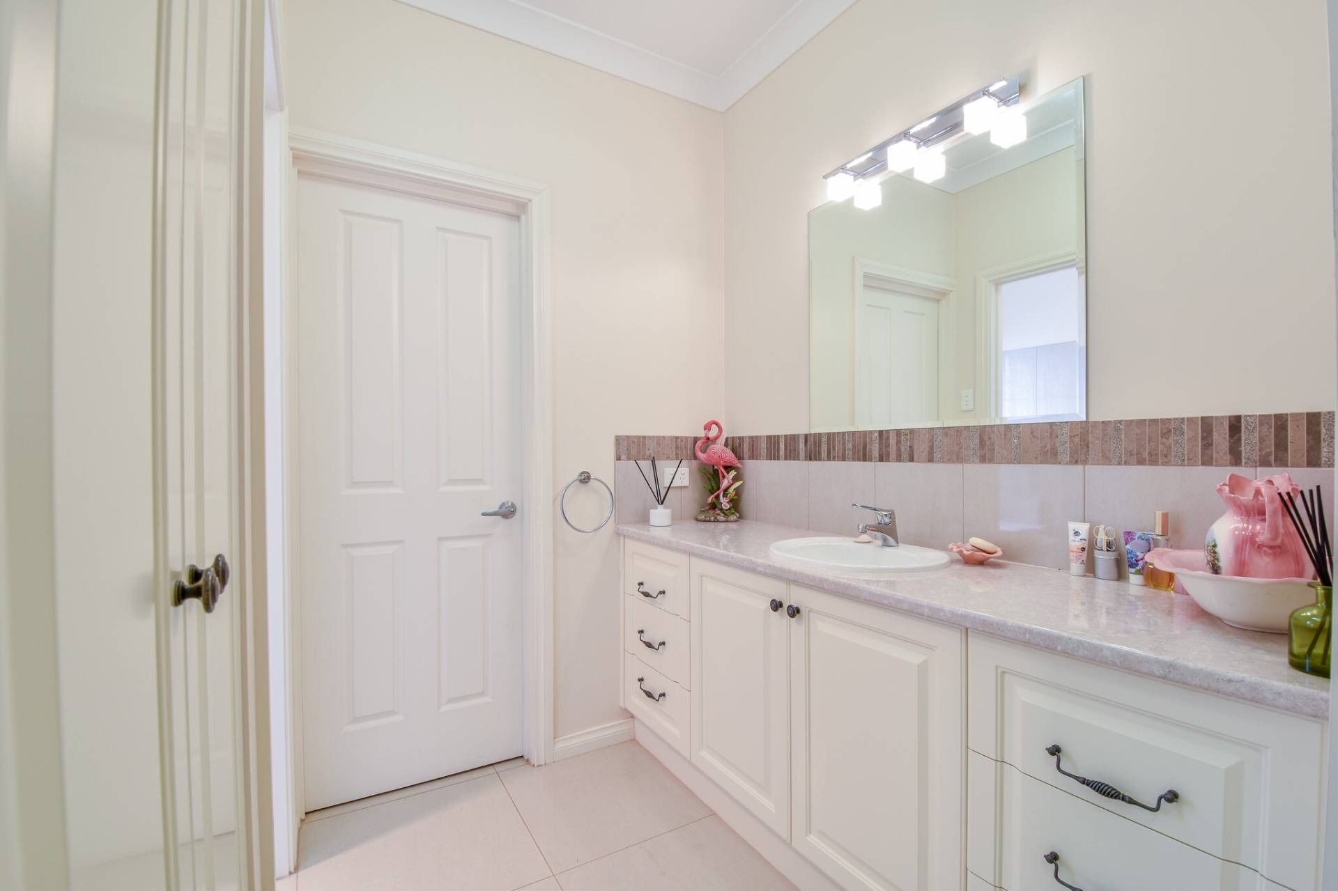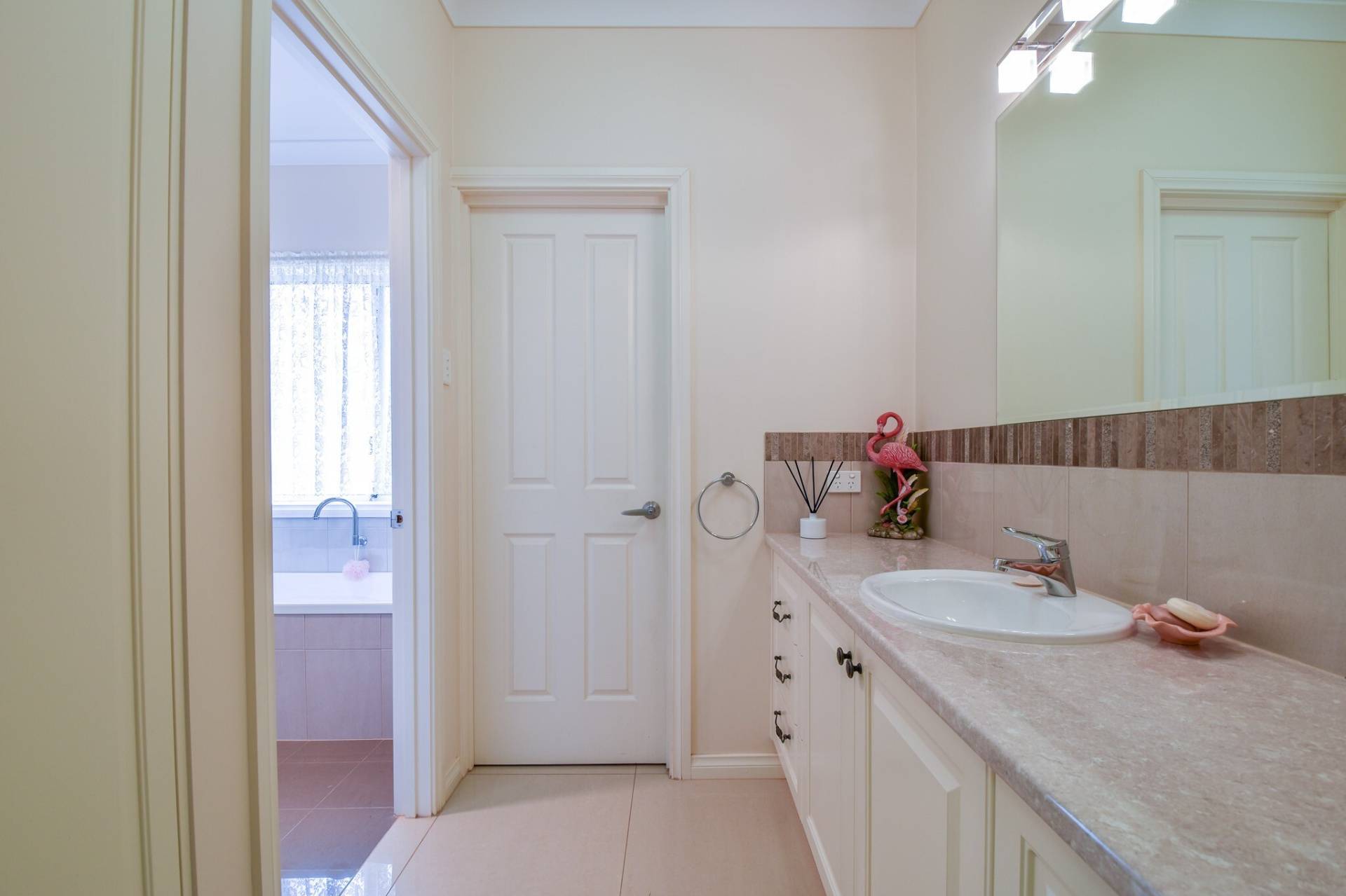 A three-way main bathroom enhances functionality, offering a separate vanity area, a wet room with shower and bath, and a separate toilet. The laundry is spacious and practical, with under-bench cupboards, a stainless steel wash trough, and extensive built-in storage.
