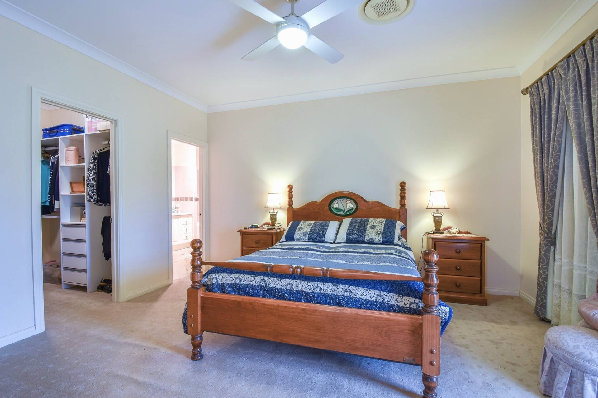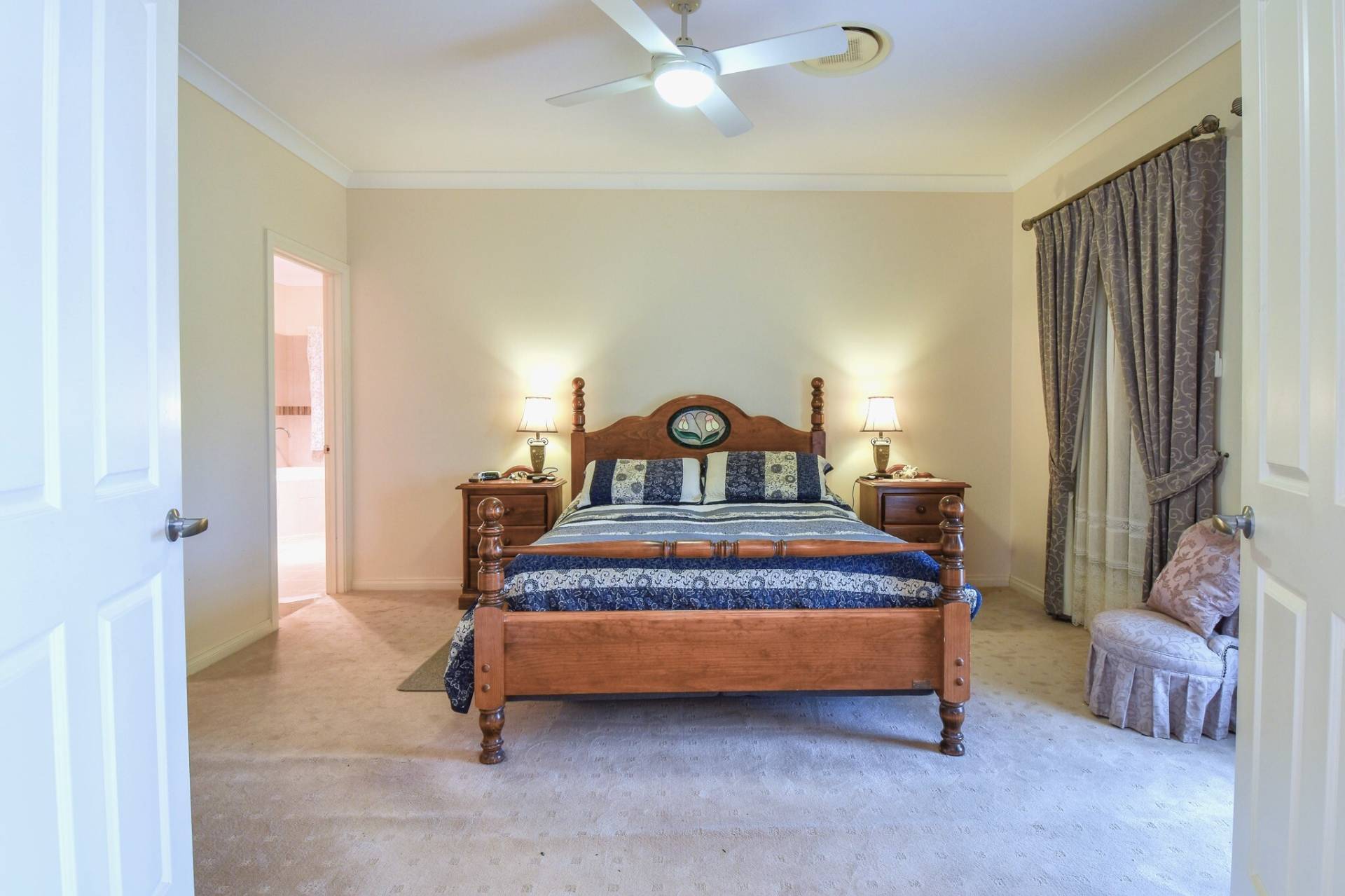 The spacious master bedroom includes a walk-in wardrobe and a private ensuite with corner spa, shower, vanity, and toilet. Additional 3 bedrooms are all well-sized and complete with built-in wardrobes and ceiling fans.