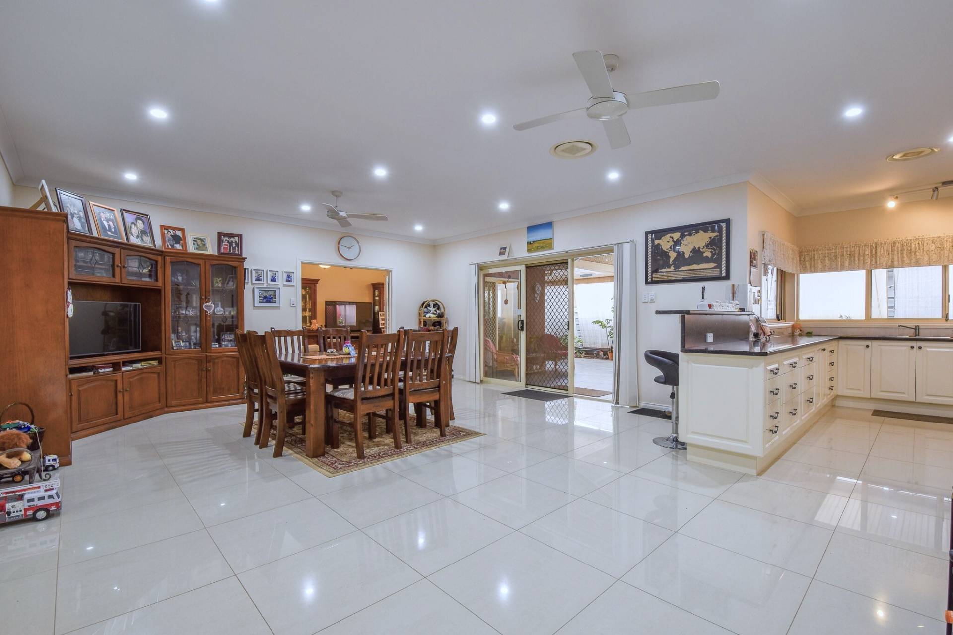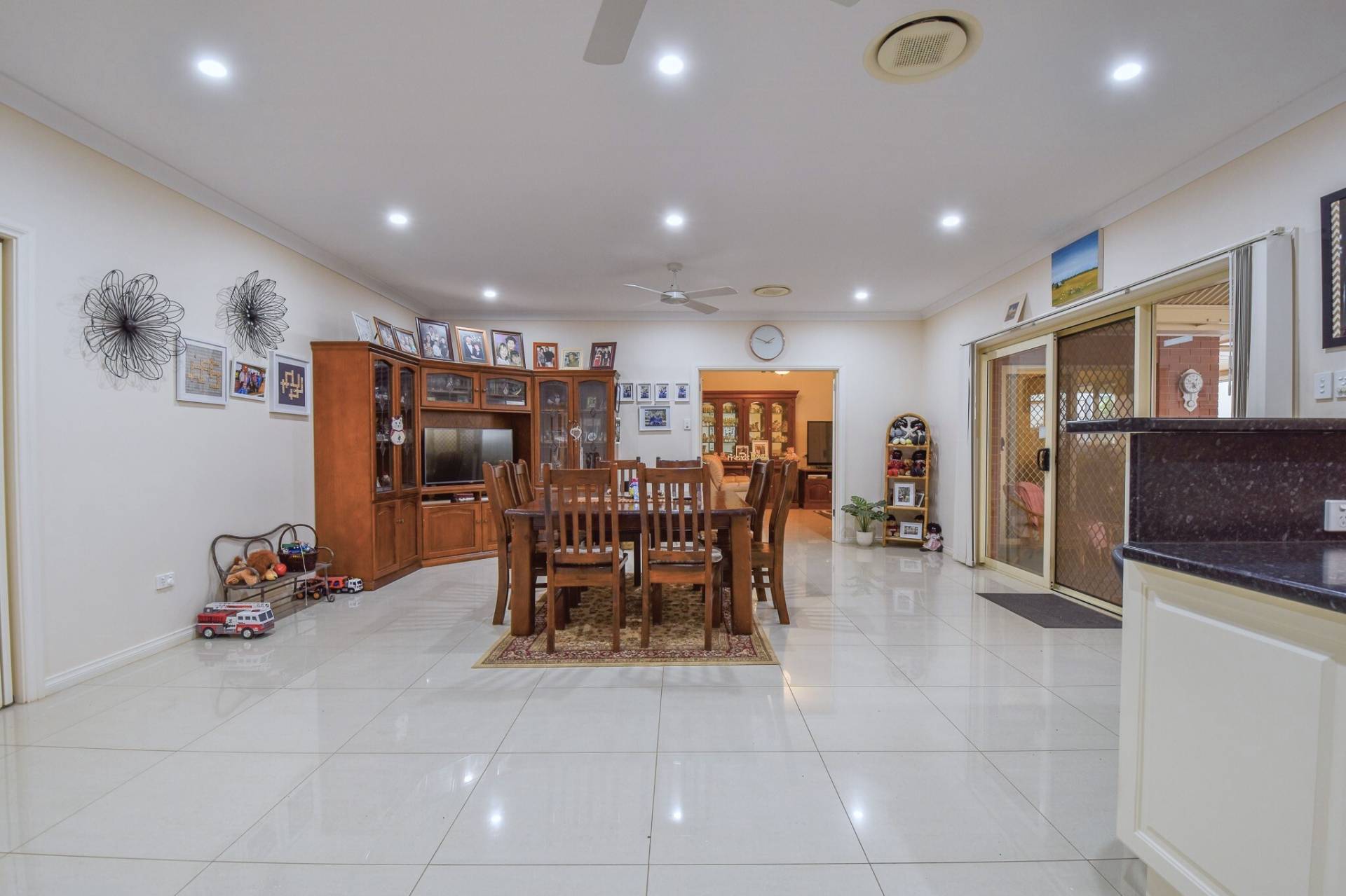 The thoughtfully designed floorplan features formal living and dining areas at the front of the home, flowing through to a generous open-plan living space. The kitchen is well-equipped with electric appliances, including an oven, cooktop, and dishwasher, and is complemented by a large walk-in pantry.