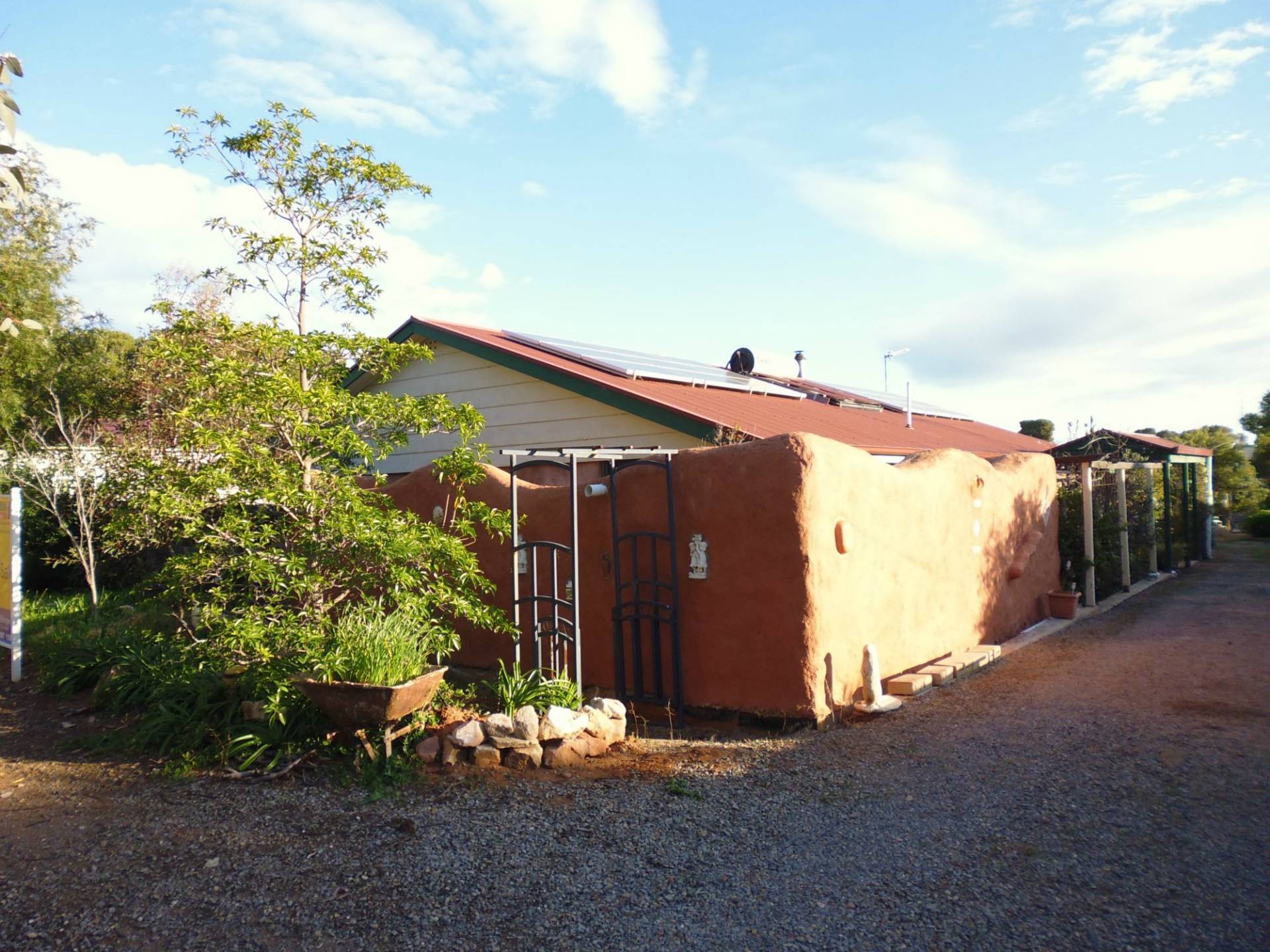 11 Year old Straw Bale Home built close to amenities of Crystal Brook with park lands across the road. Two bedrooms with ceiling fans, main with W/I Robe, spacious kitchen/dine, Living and family room, two way bathroom. French doors giving access to the garden/outdoor living area which leads to the detached retreat with shower/toilet/ laundry.