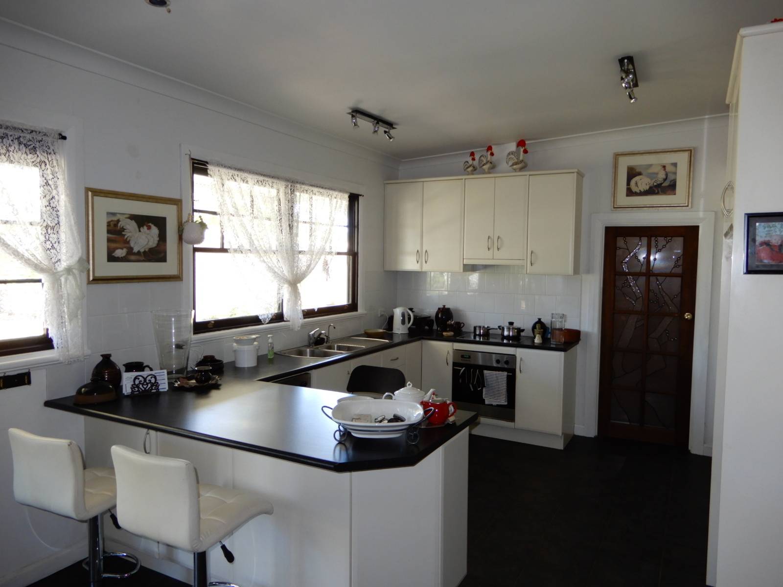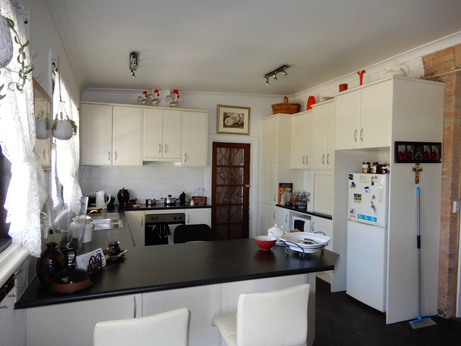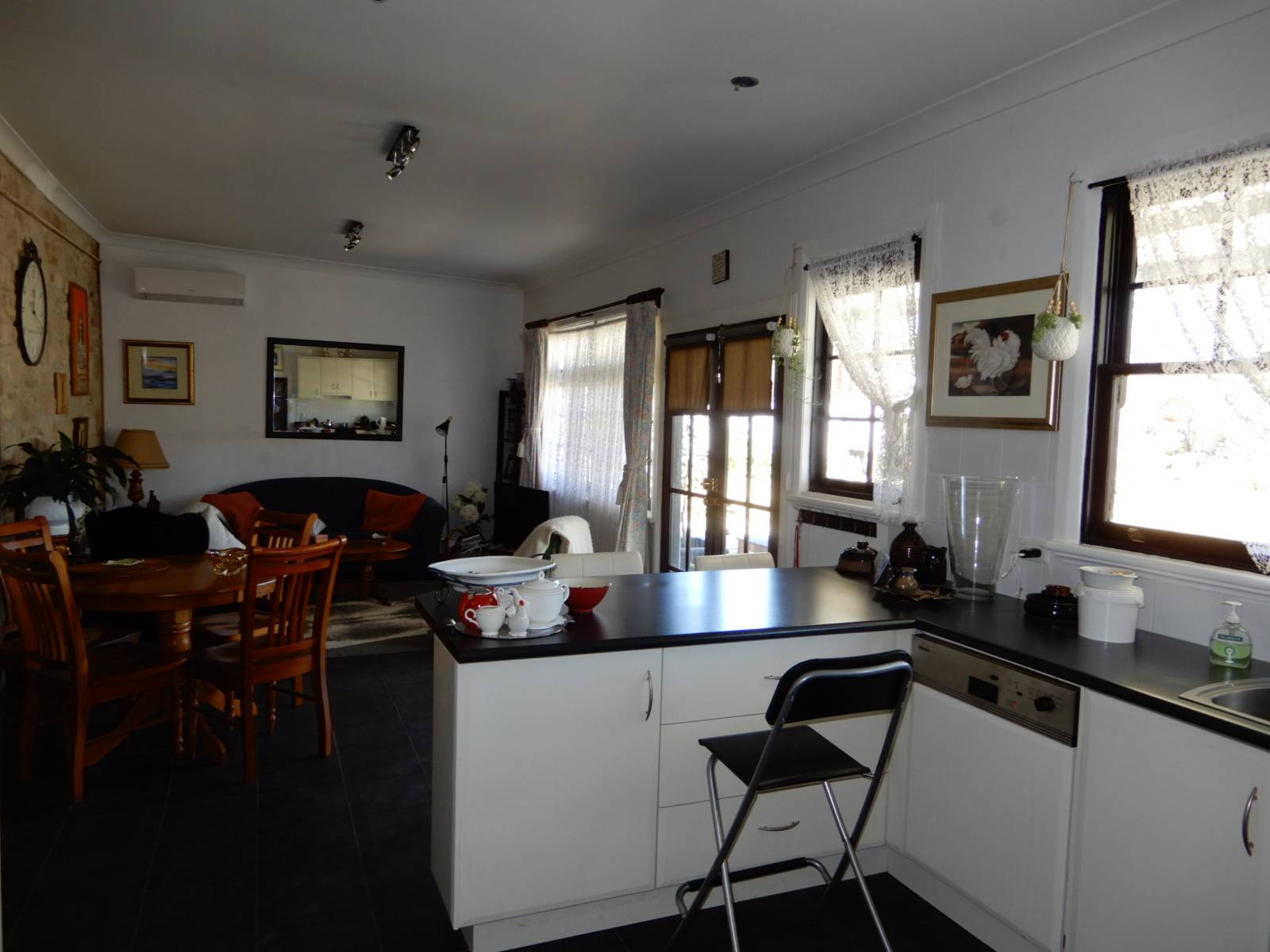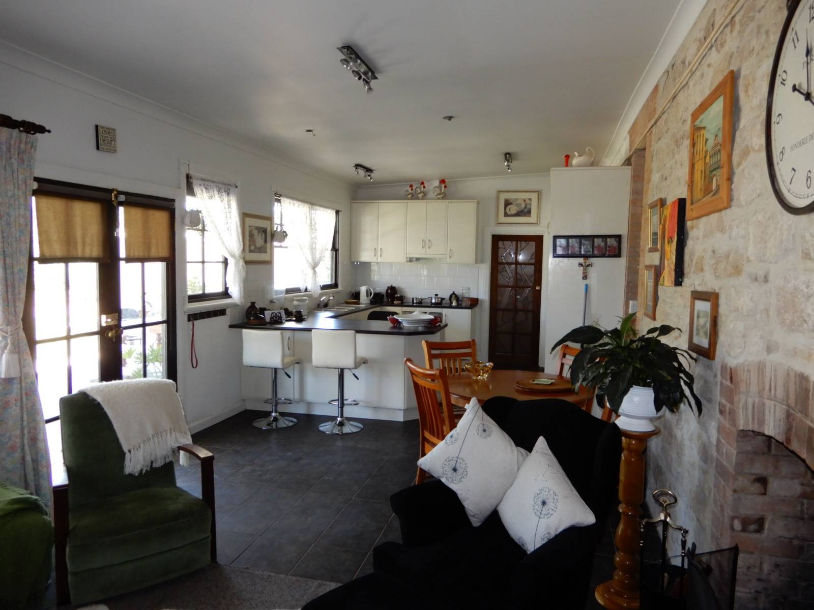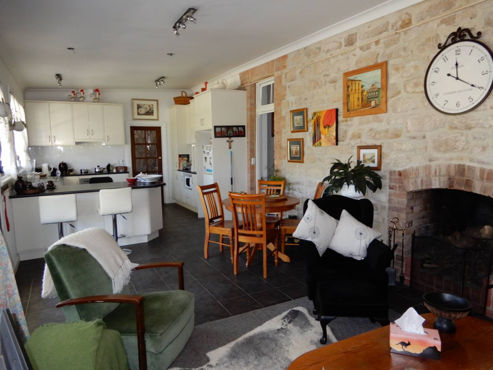 Spacious two bedrooms from the large passageway which leads  to the tiled open plan Kitchen/Dining area with an open fire place, r/c s/s a/c and stone feature wall. Rear verandah, single garage.