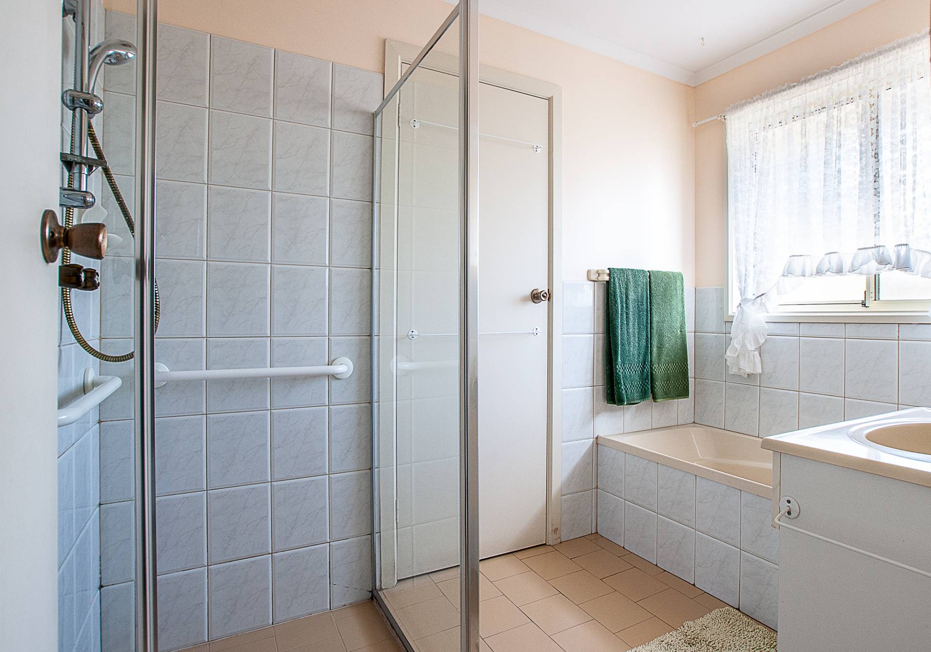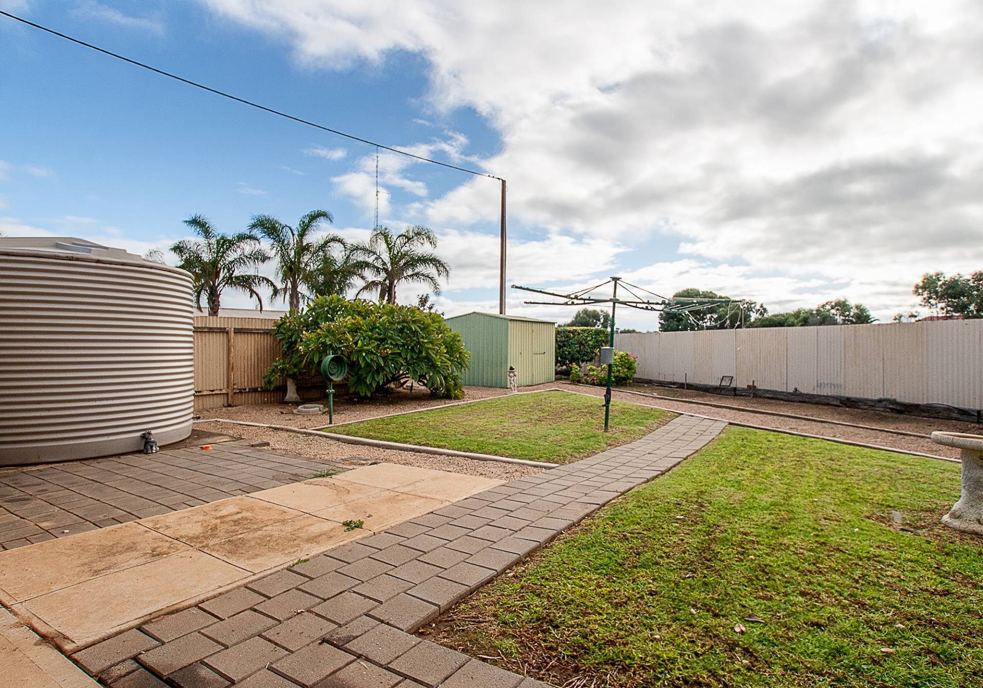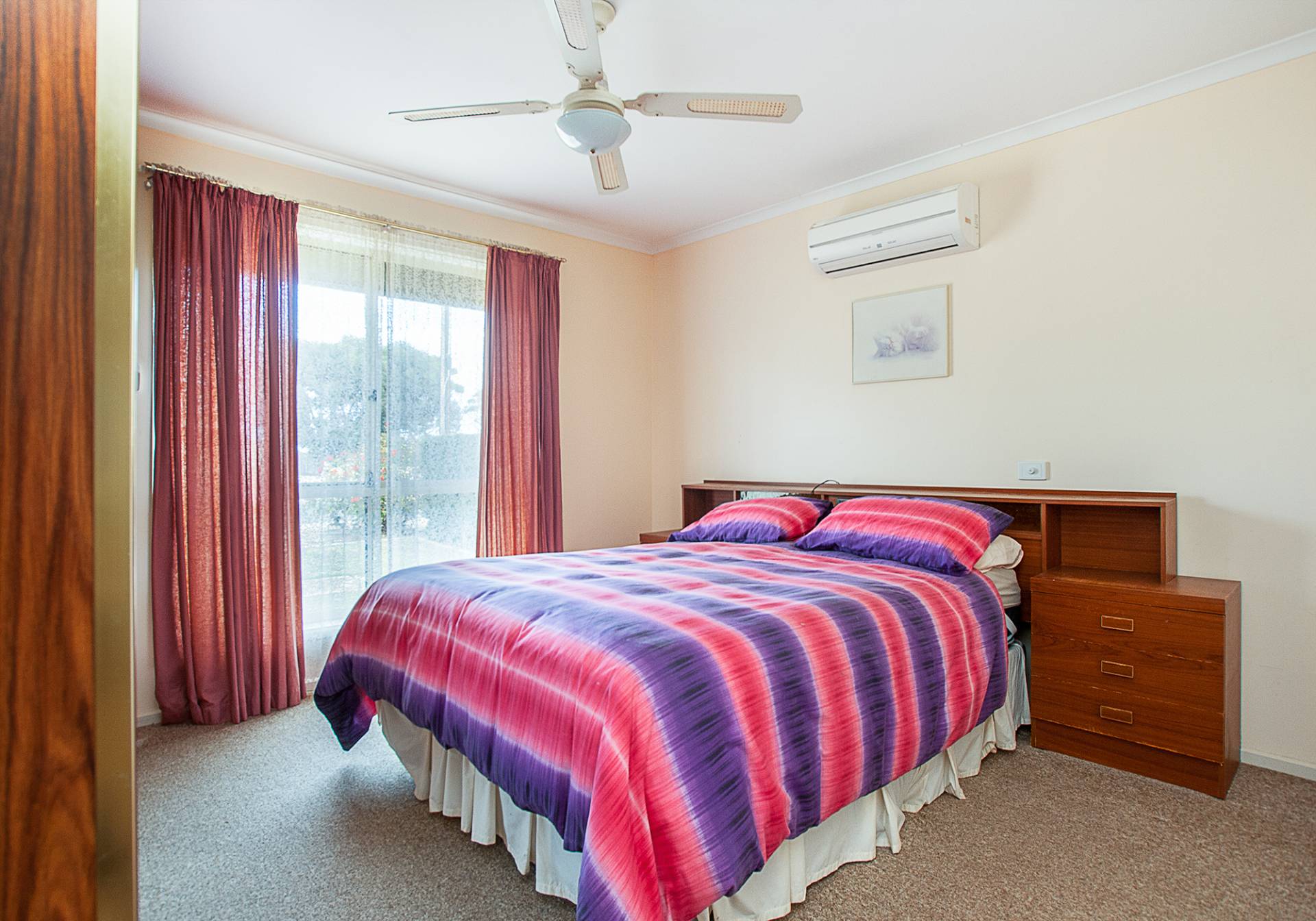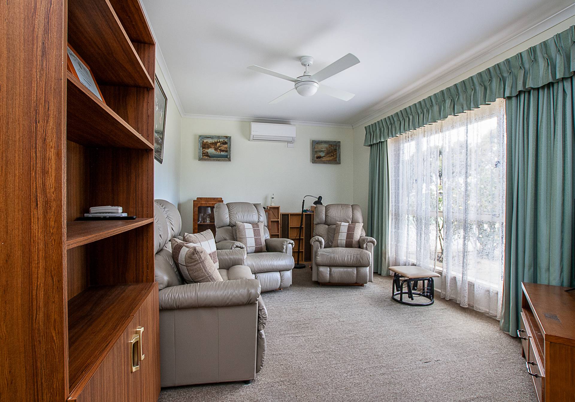 This 3 bedroom brick veneer home consists of master bedroom with built-in robe, ceiling fan, split system a/c and access to the bathroom, bedroom 2 with split system a/c, lounge room with c/f and split system a/c, kitchen, dining/family room with split system a/c, bathroom with shower, bath and vanity, separate w/c and laundry. Outside has back verandah, established gardens, 20 x 30 shed with front apron, lean-to, concrete floor and power, tool shed, rainwater tank and fenced yard on a large 1120 square corner allotment. This home has approx. 1KW solar system and front roller shutters.