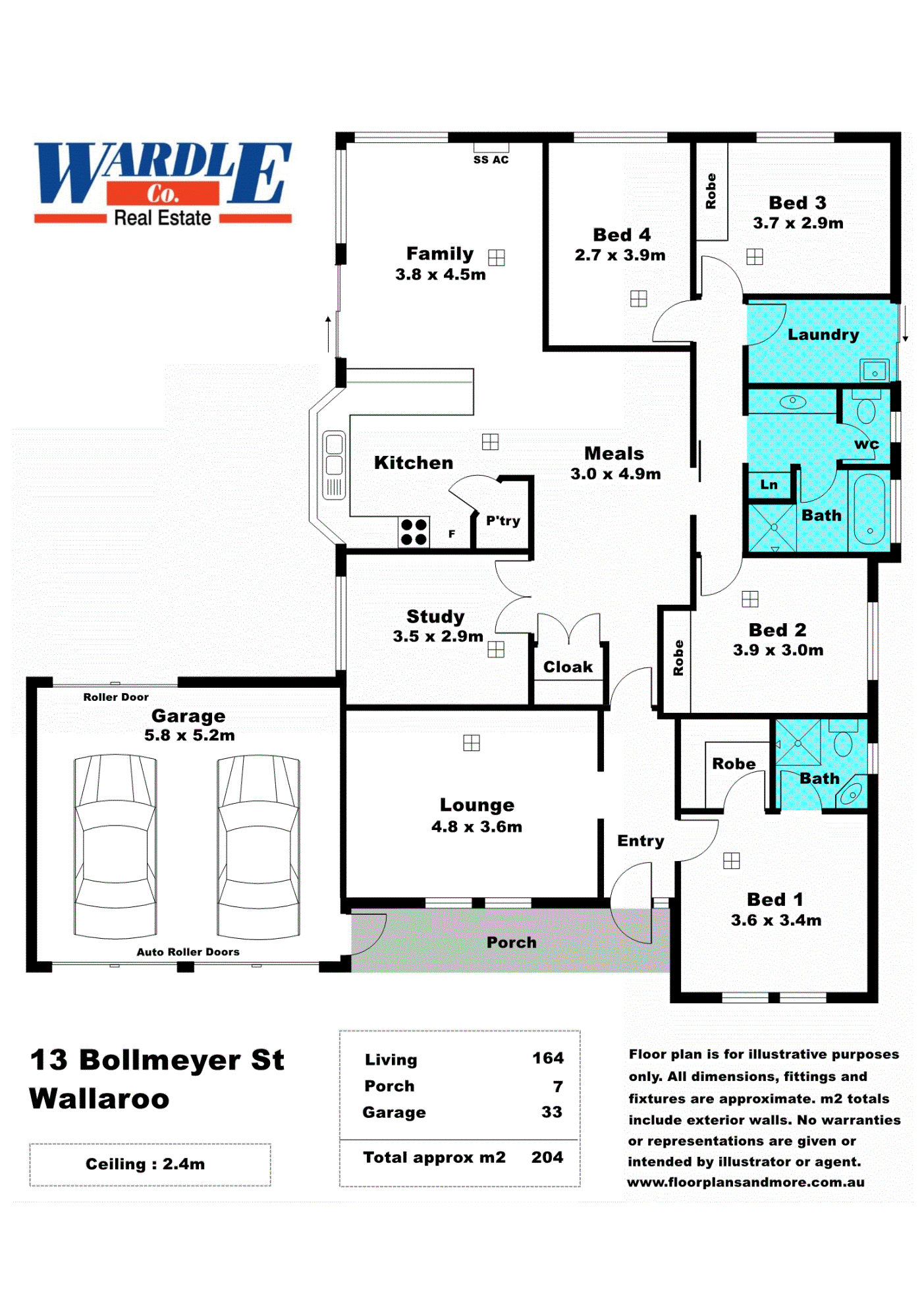 This home comprises 4 bedrooms with the main having a walk in robe and ensuite. There is a formal lounge, study/dining and a large open plan kitchen with bay window plus a pantry and ample cupboards. The kitchen leads to an open meals area and a large family room. The 3 way bathroom is great and you can enjoy a bath or separate shower. This home has ducted air conditioning, two split systems, solar electricity panels and roller shutters. Outside offers a picturesque garden, double garage under the main roof and a large shed with good clearance for your boat, caravan and workshop. All situated on a large corner allotment with two double drive ways.