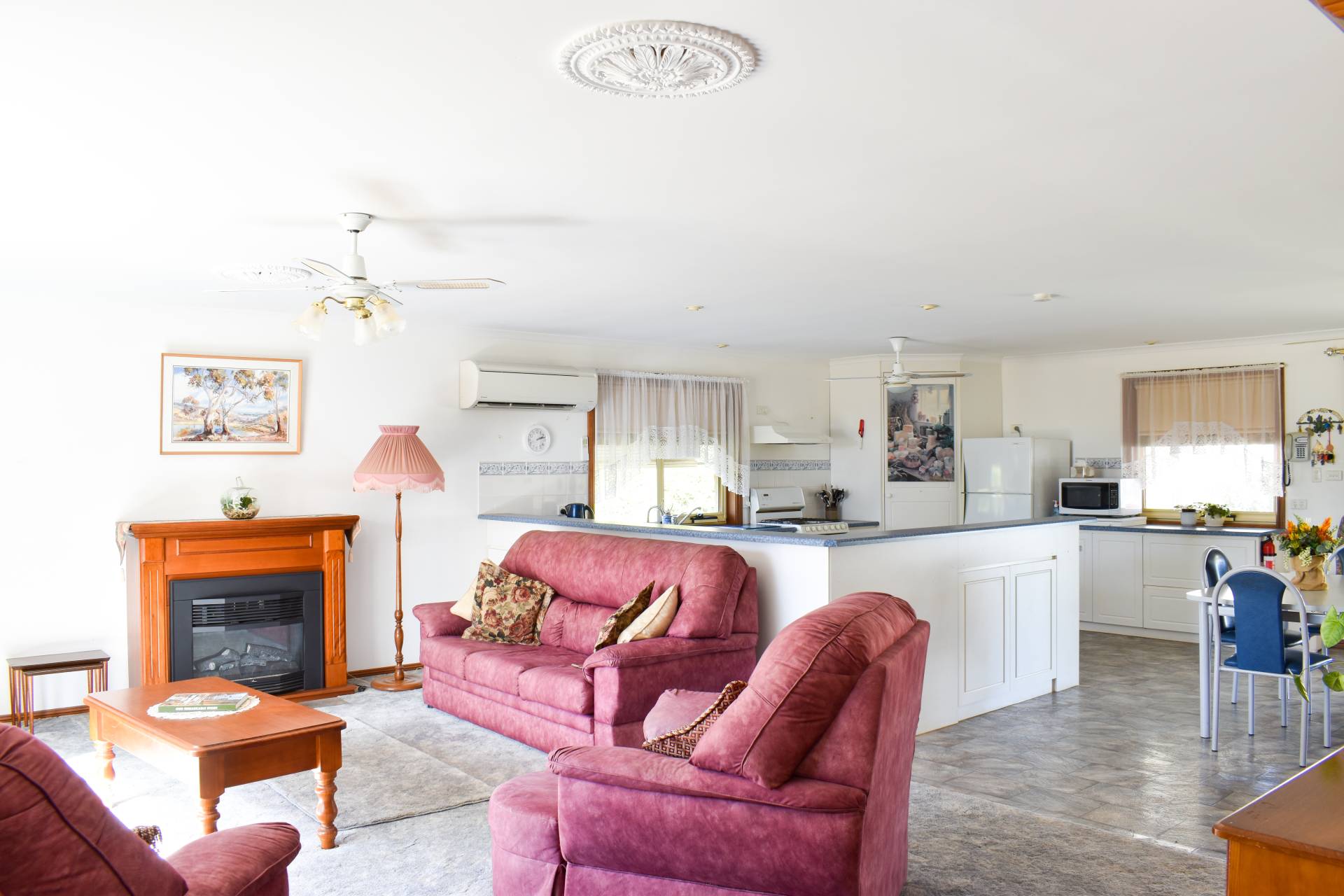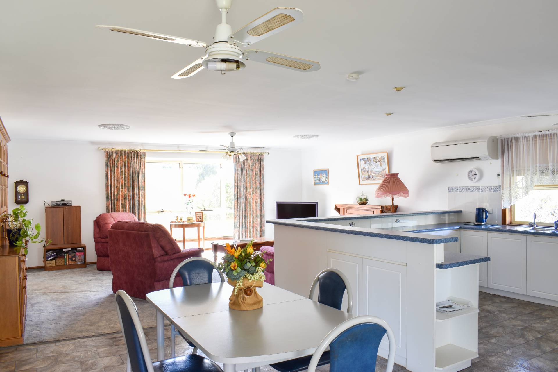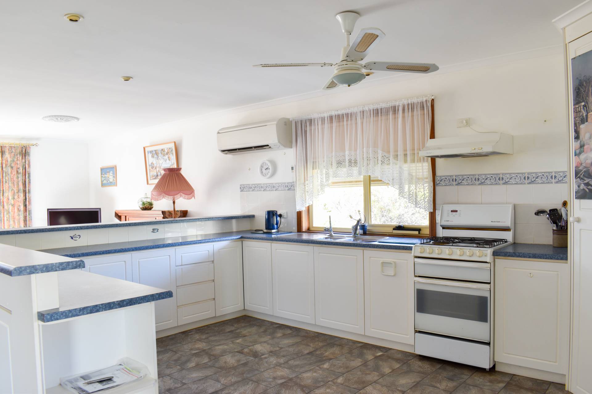 - Open plan Kitchen/Meals/Lounge with vinyl floor in Meals and kitchen, large U-shaped kitchen with ample cupboard space and laminate benchtops, freestanding gas cooktop and electric oven with rangehood, double sink, Walk-In Pantry and split system air con.