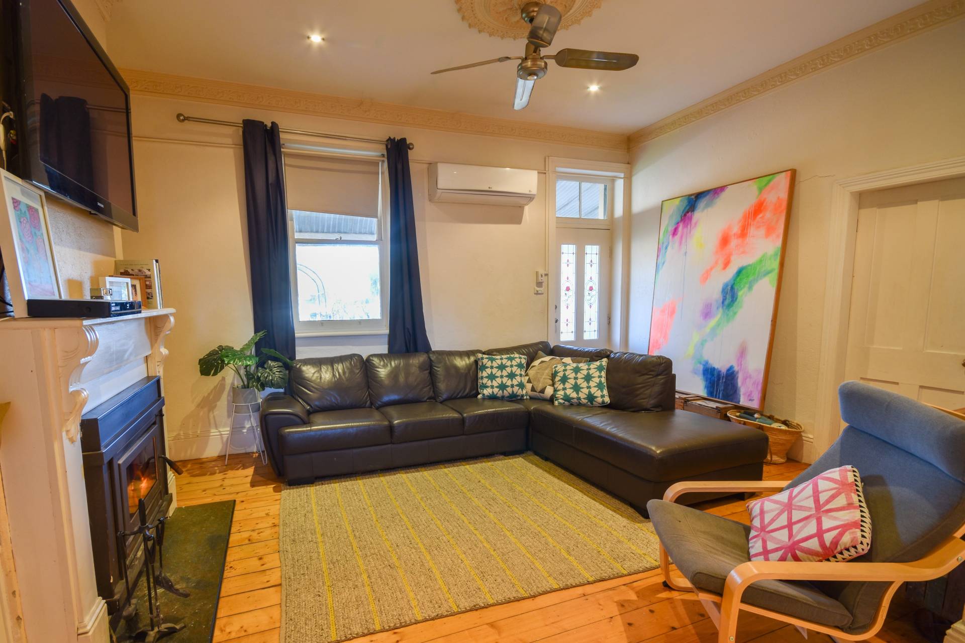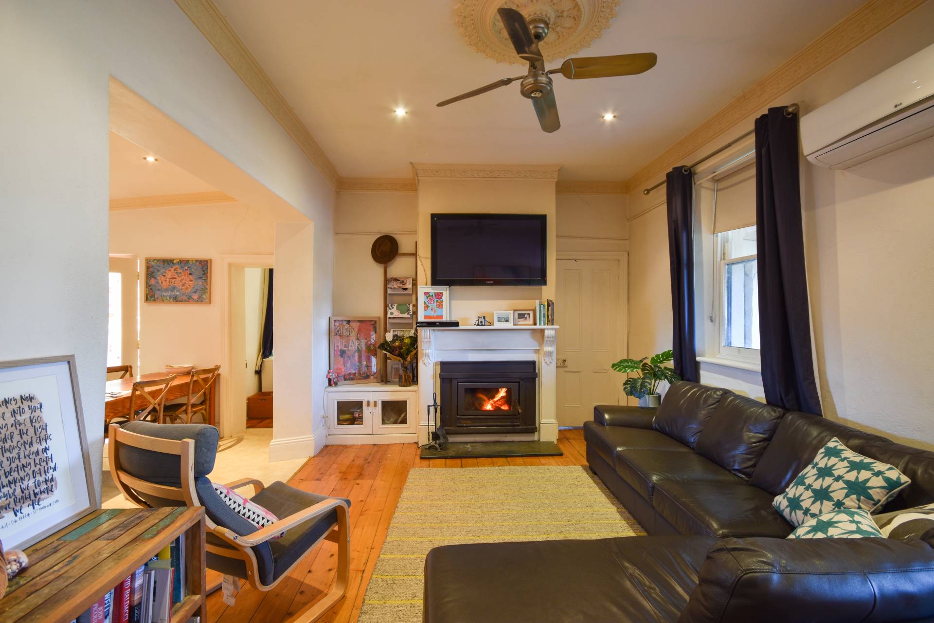 -  Lounge room with polished baltic pine floor boards, decorative ceiling rose, slow combustion heater, s/s a/c