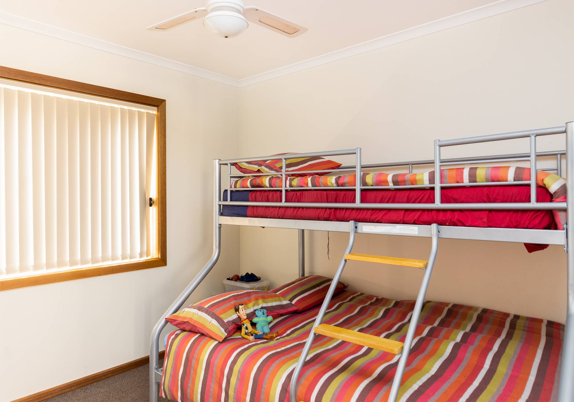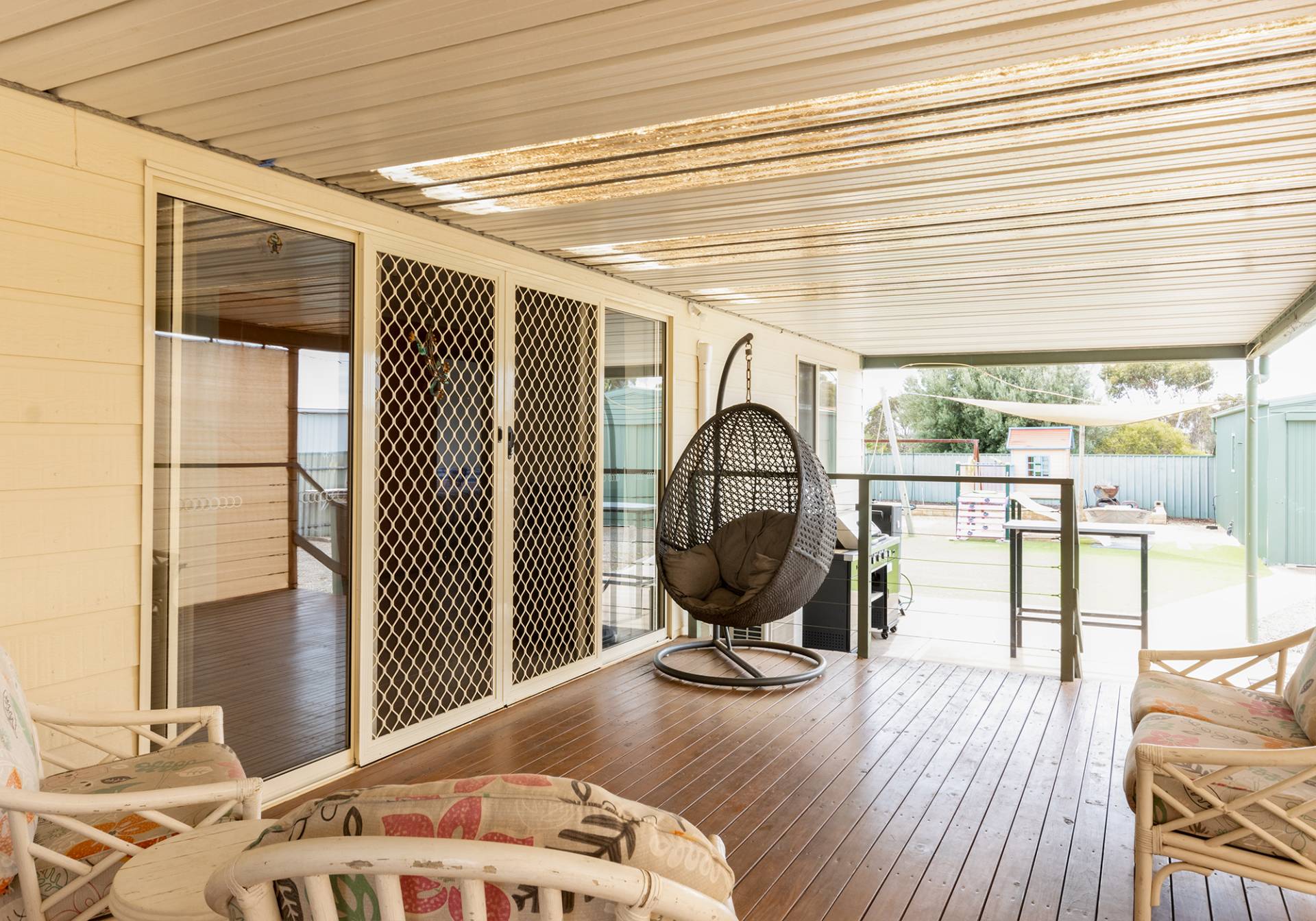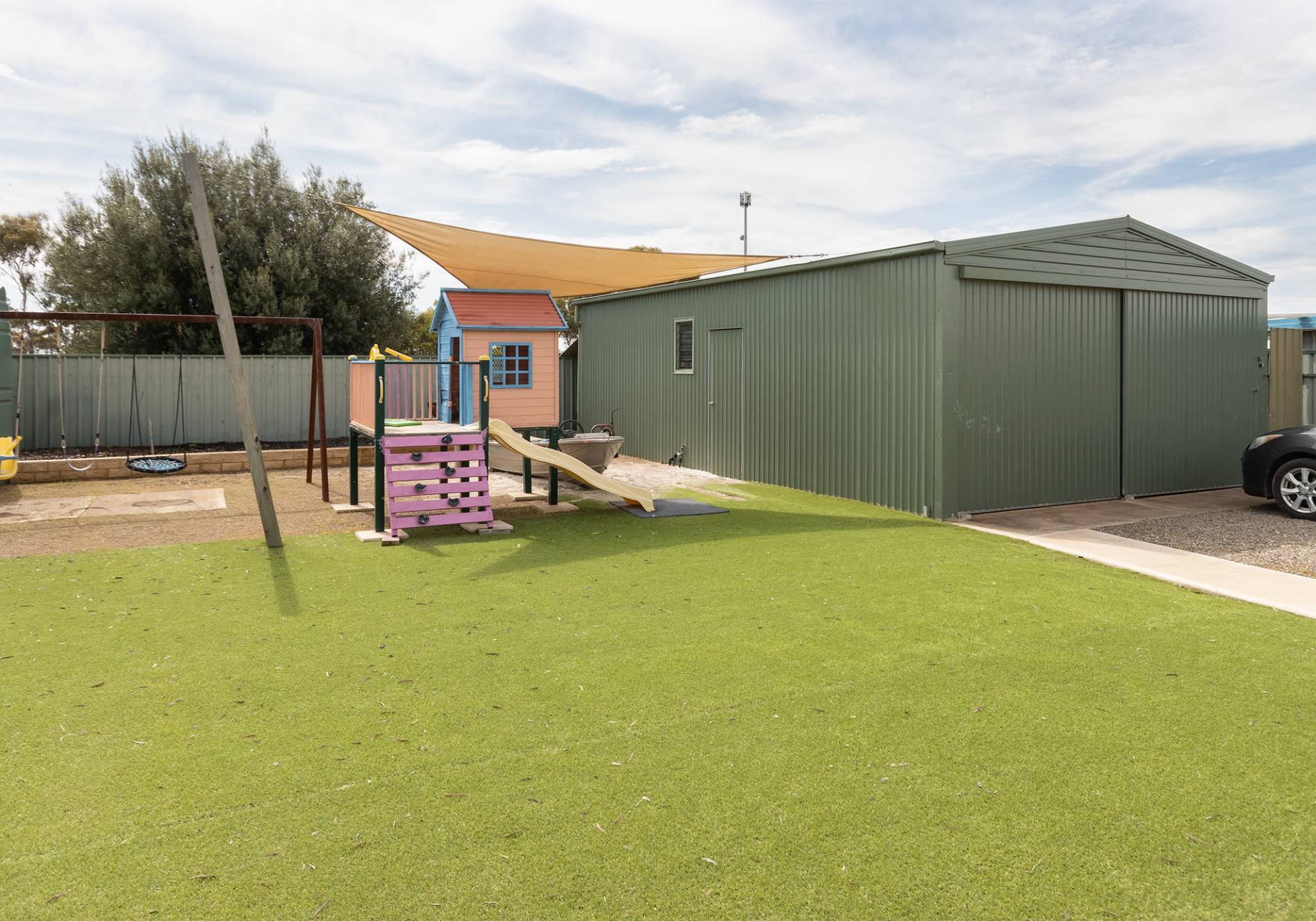 Features include 2 living areas, both with split system air conditioners, 4 bedrooms, all with ceiling fans, outdoor covered deck area, lawn that never needs mowing, play equipment for the kids/grandies, double garage & all on a 900m2 well fenced allotment.