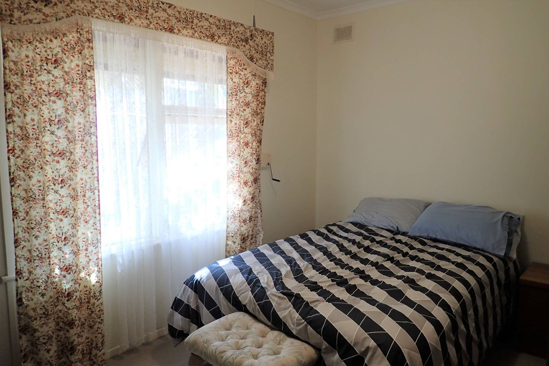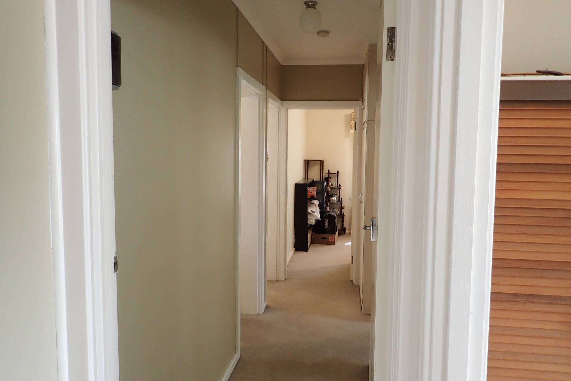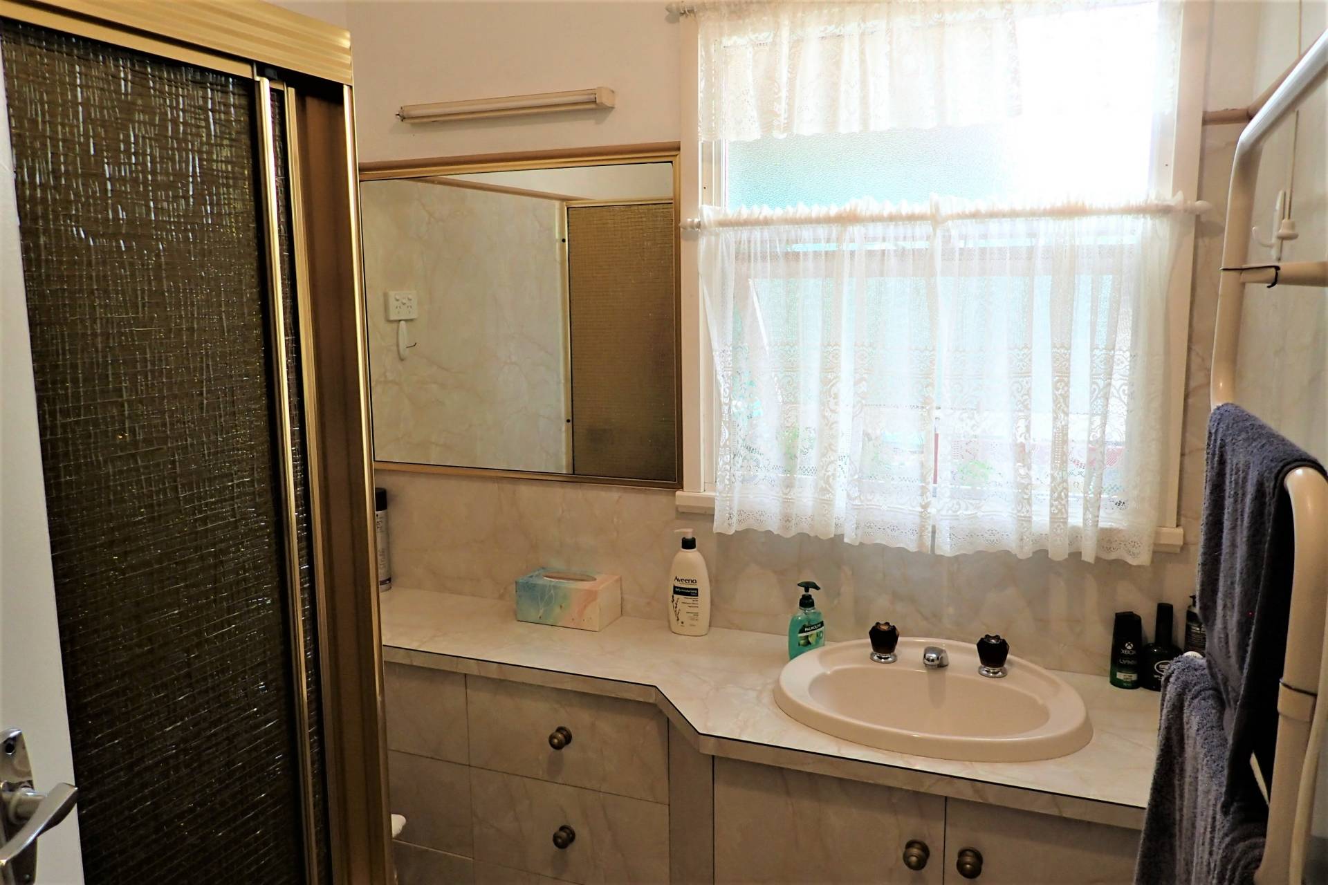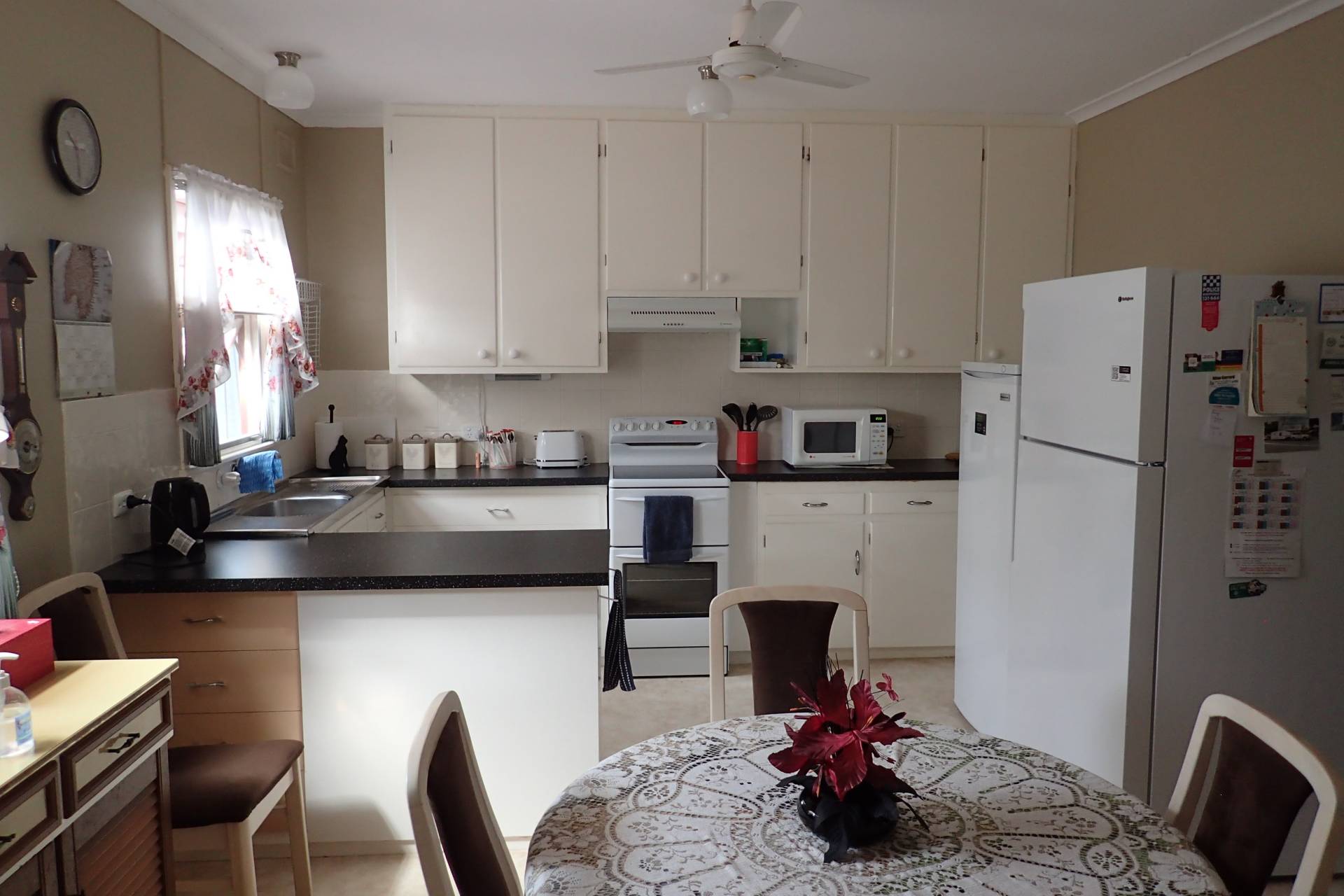 - Kitchen has lino floor and laminate cabinetry, with freestanding electric oven and rangehood, ceiling fan open to rear foyer