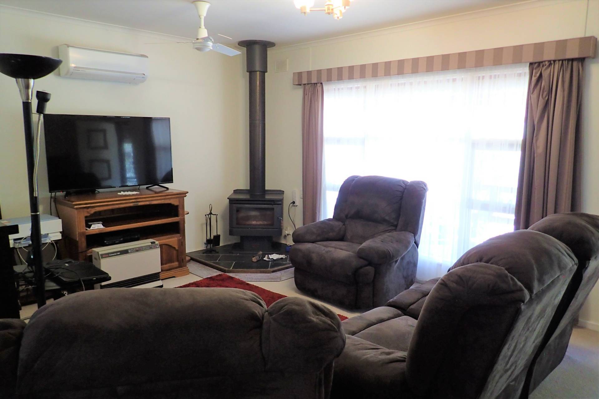 - Lounge room has carpet floor, split system air-con and slow combustion heater, open through to kitchen