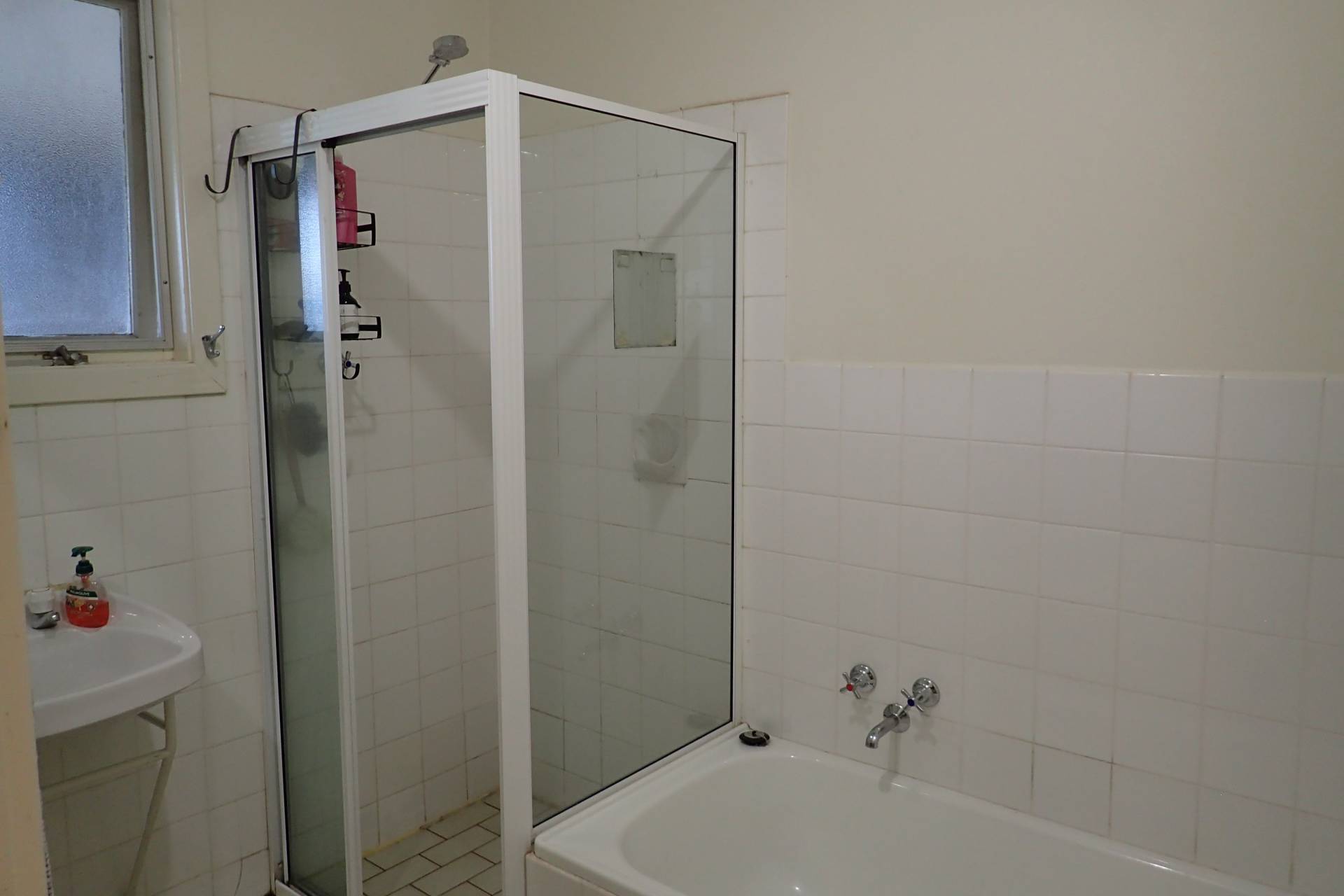 - 1 Bathroom with tiled floor, bath, shower and hand basin with a separate toilet
