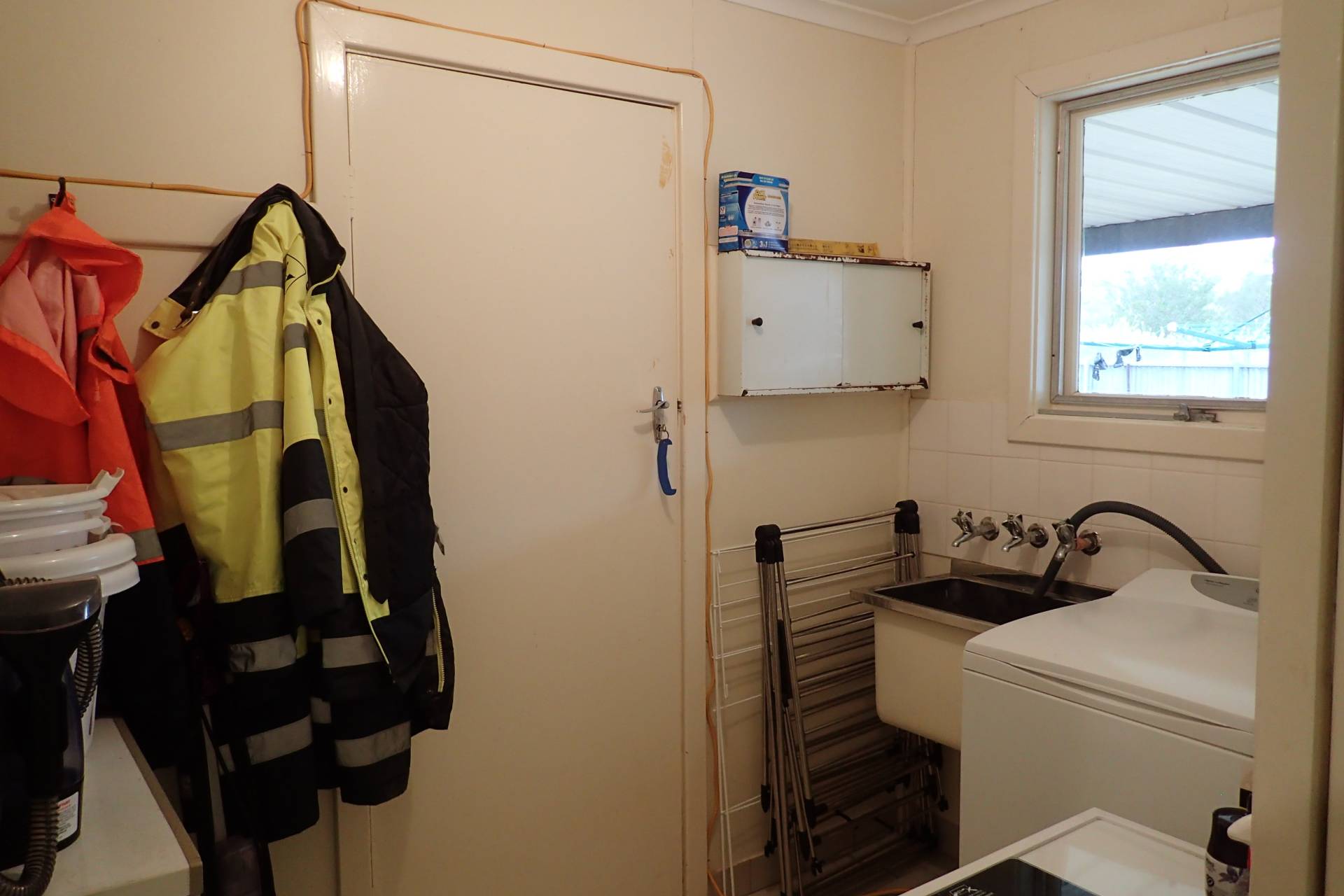 - Laundry with tiled floor, stainless steel wash trough and BIC