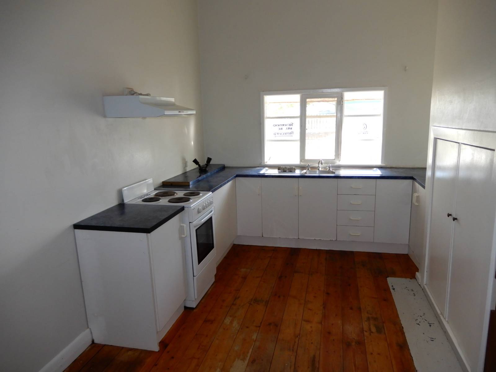 - Kitchen has pine floor board, laminate benchtops, freestanding electric oven with rangehood