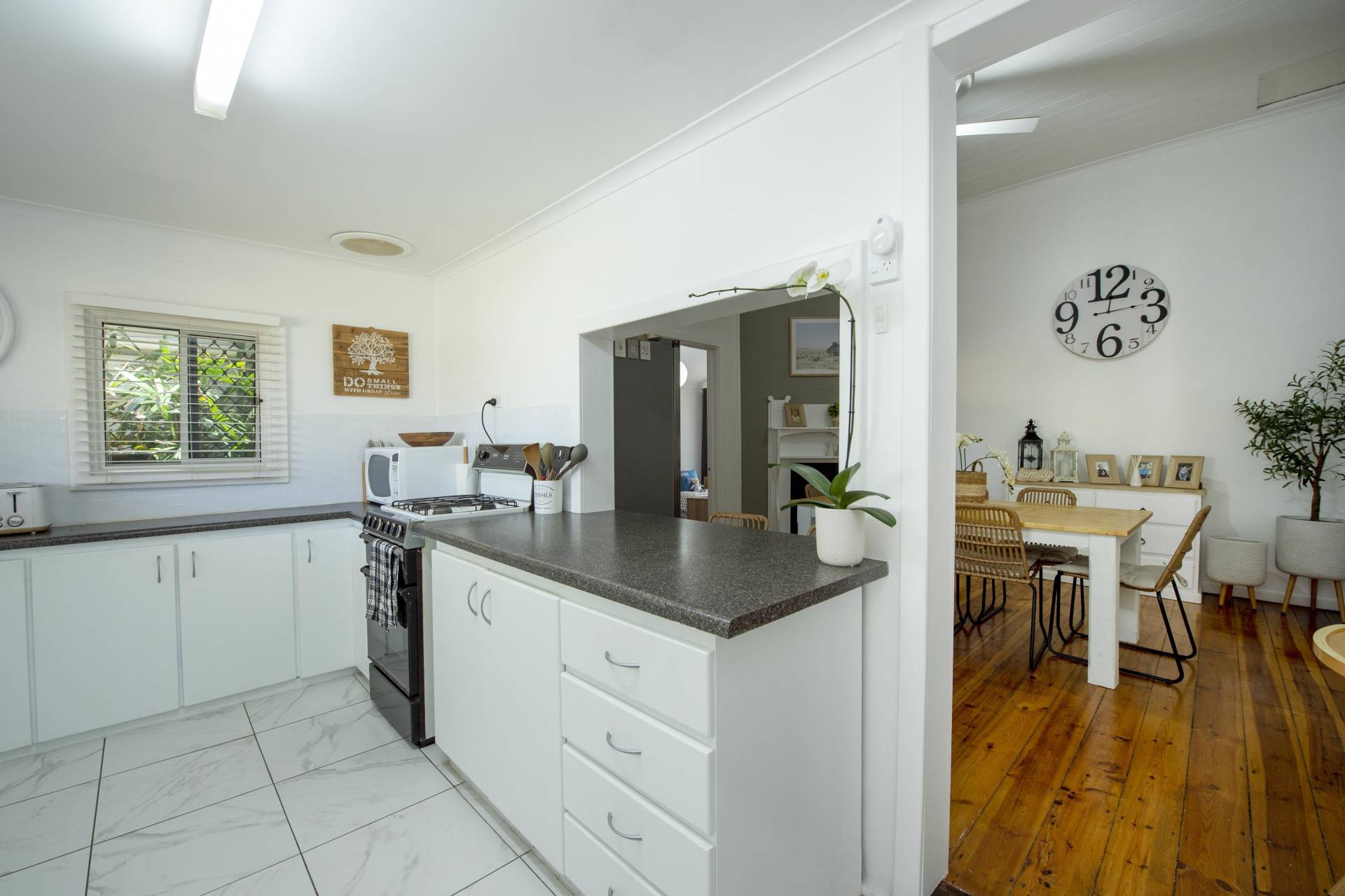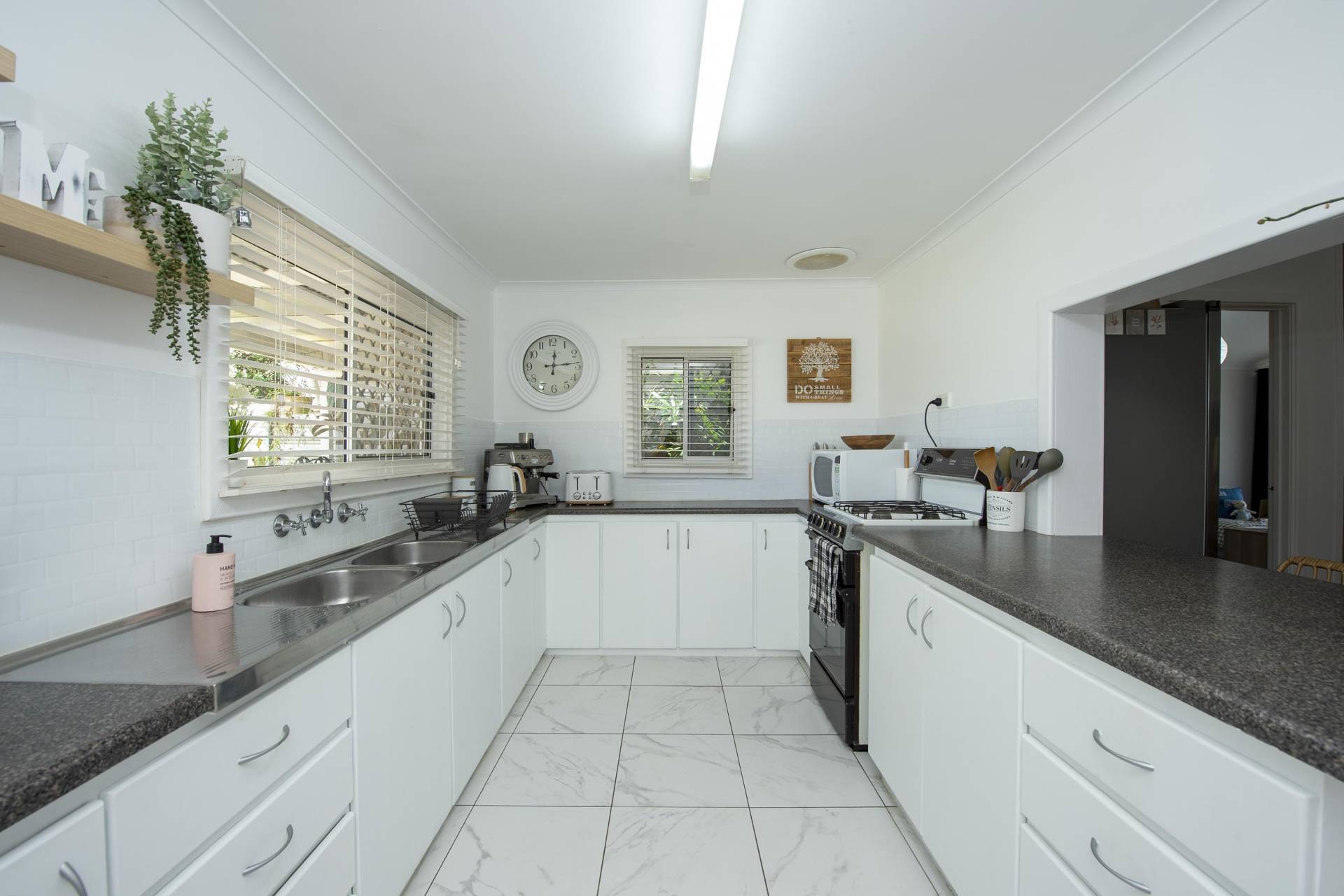 - Kitchen with upgraded benchtops, floor tiling and gas oven