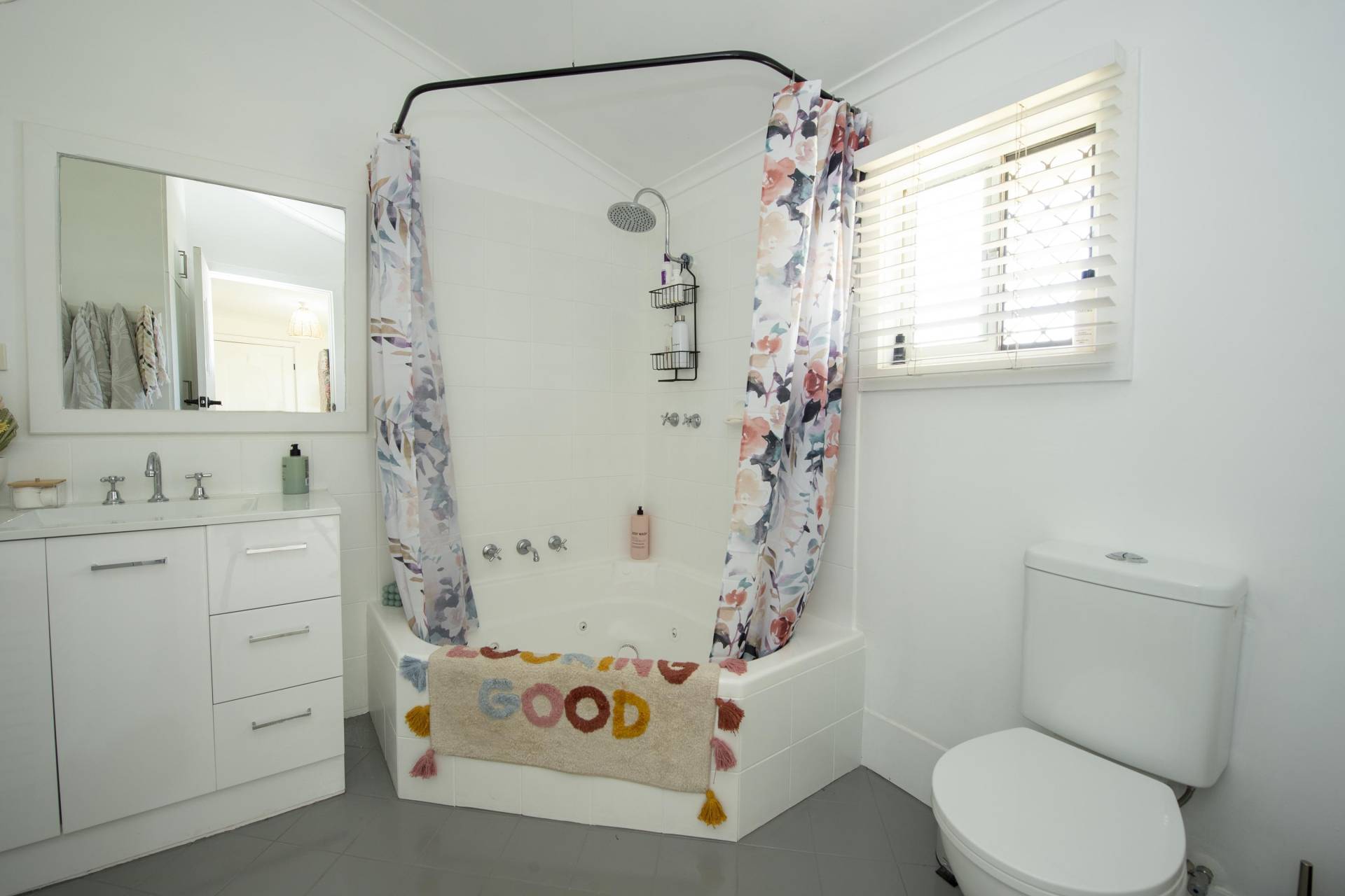 - Bathroom in crisp white decor with corner bath/toilet and upgraded vanity