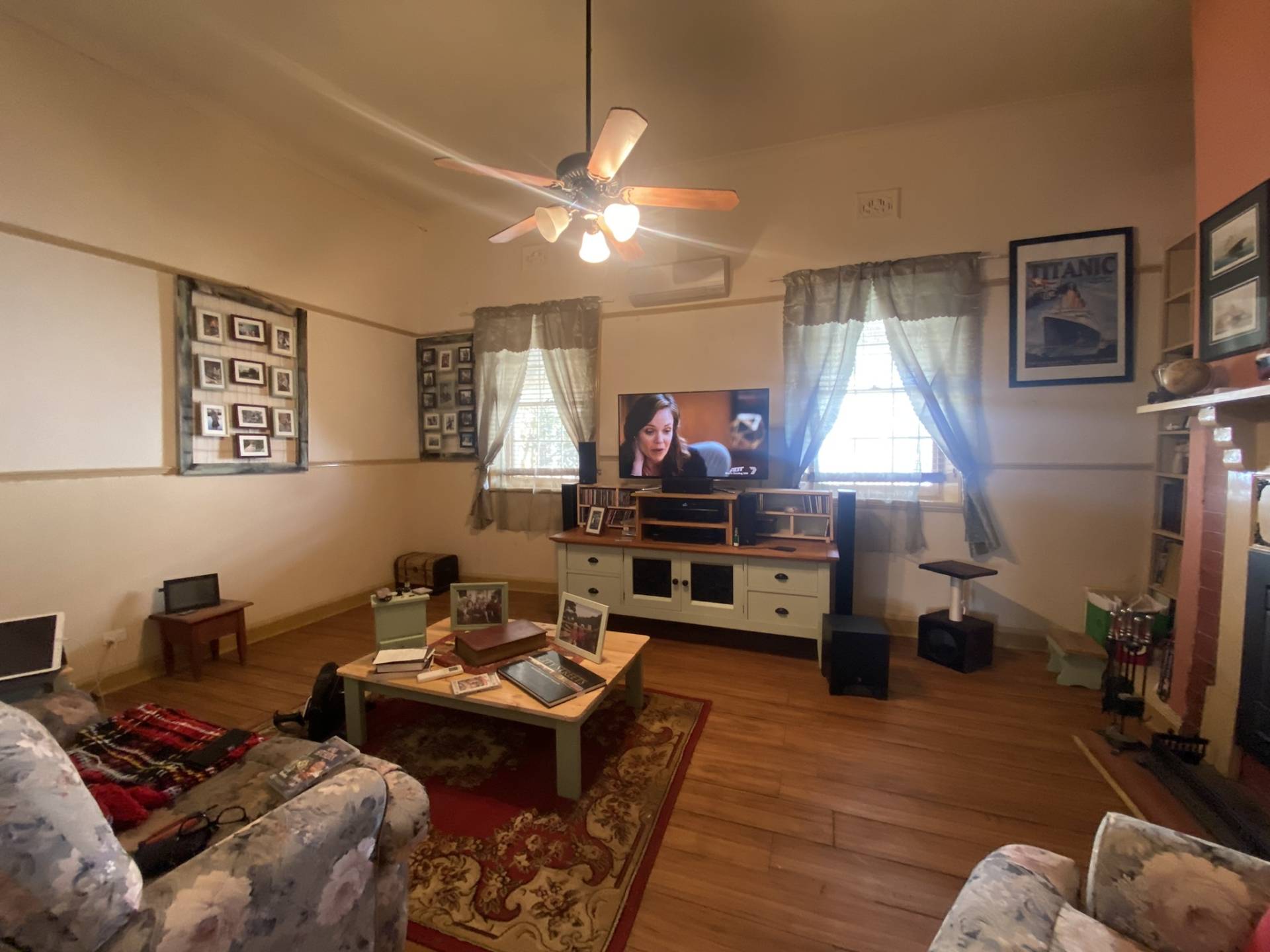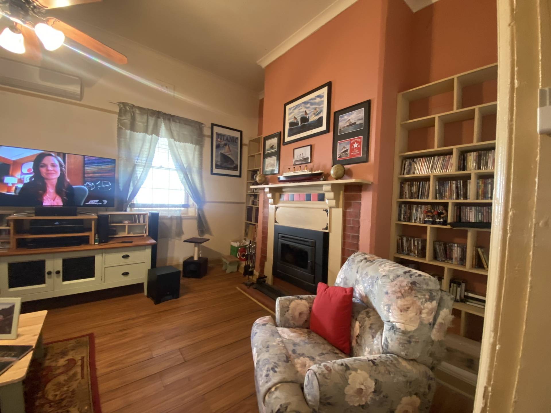 - Large lounge room with combustion heater, split system & ceiling fan.
