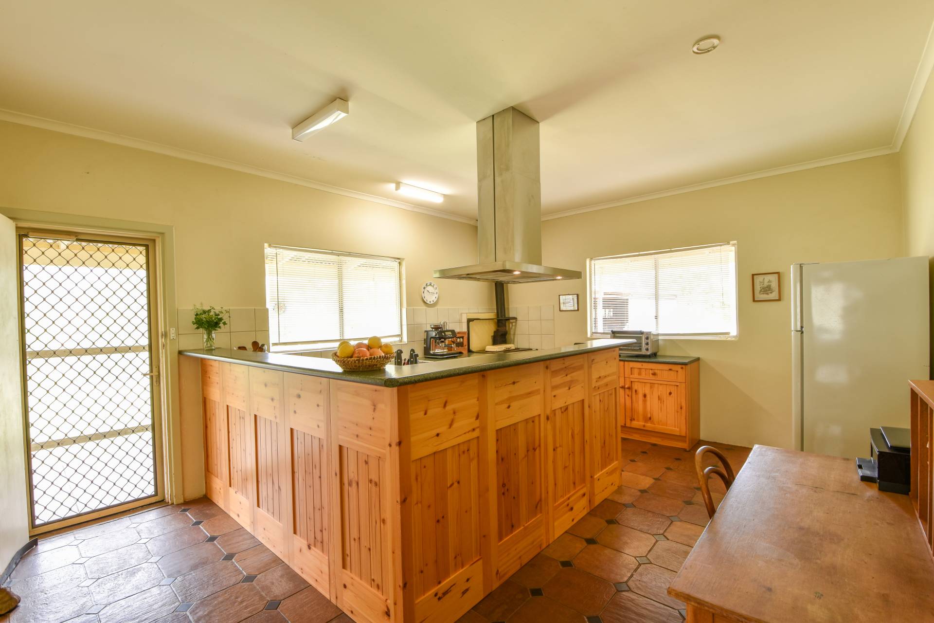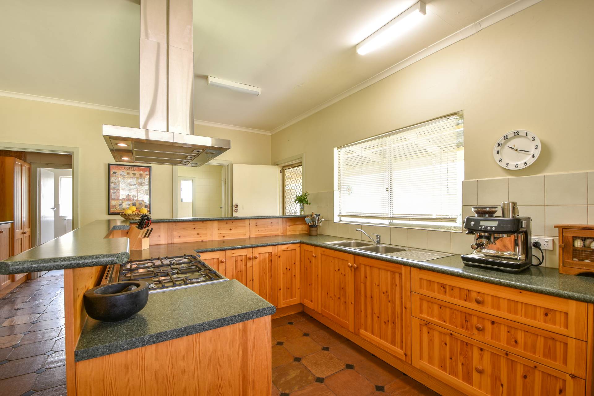 -          Updated timber kitchen with ample bench space featuring a walk-in pantry, stainless steel 900mm oven with gas cooktop, wood oven