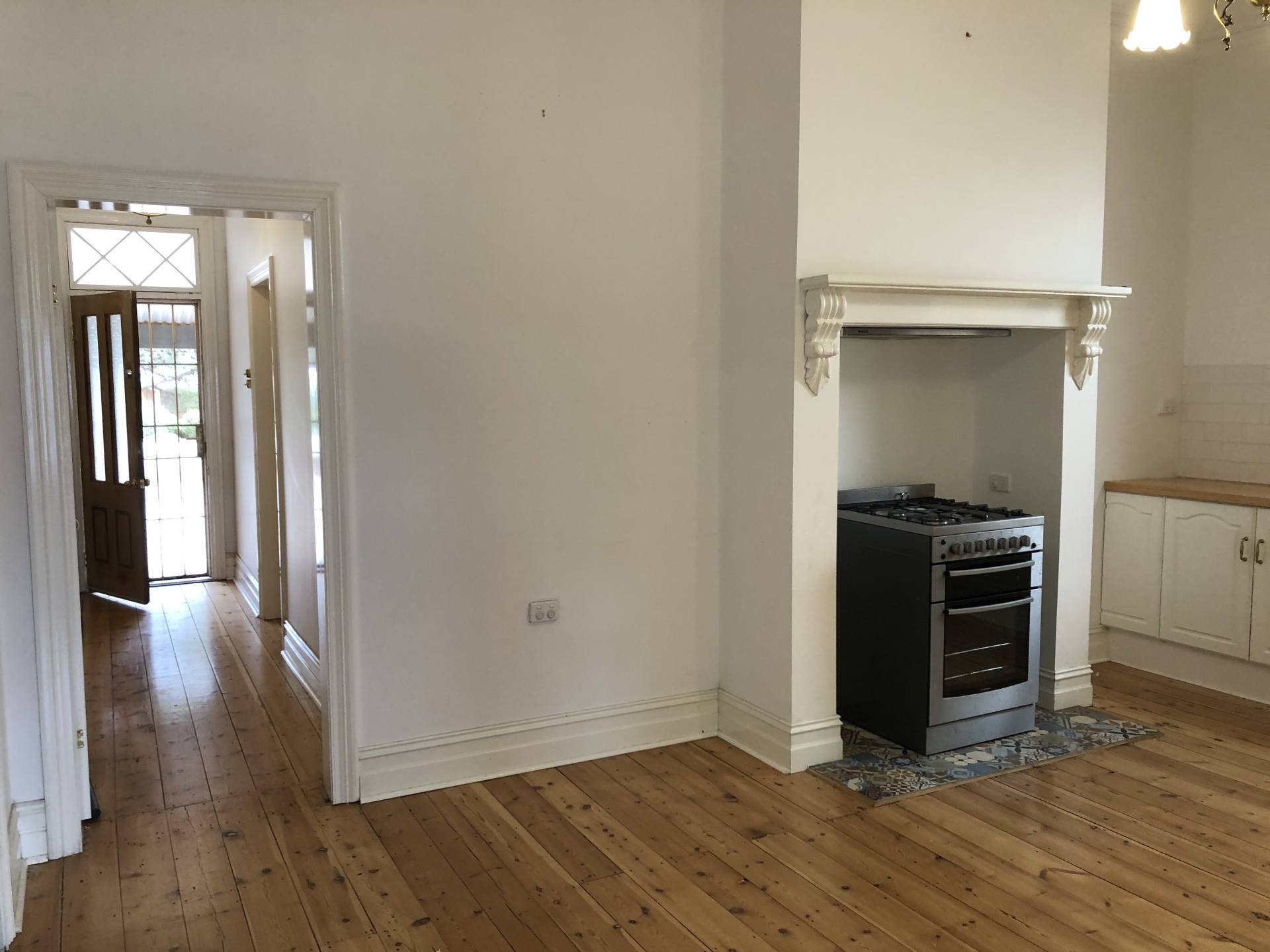 Central hallway to the kitchen also with polished timber flooring.