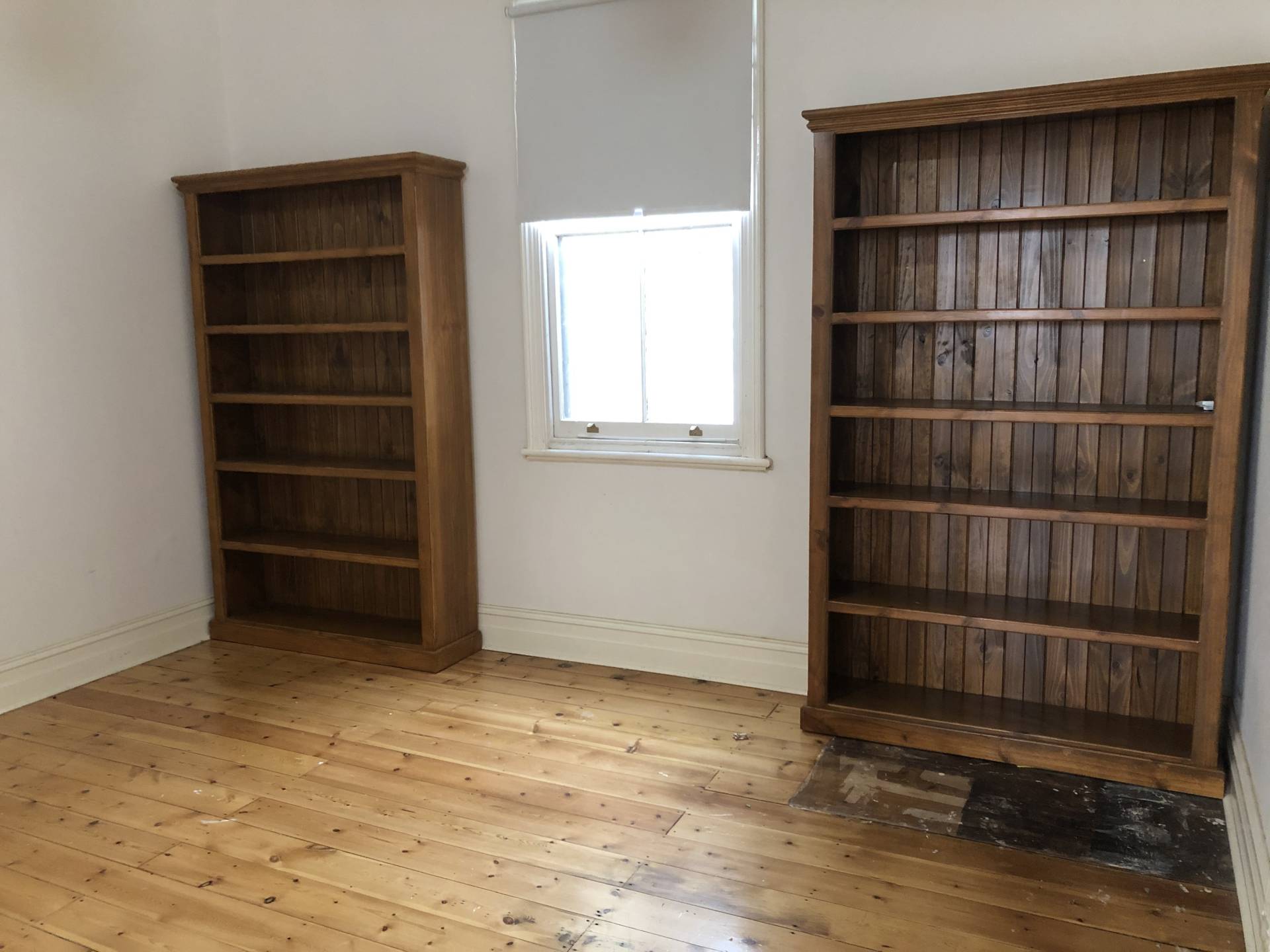 Lounge with polished timber flooring, 2 large built in timber book cases and a split system A/C for heating and cooling.