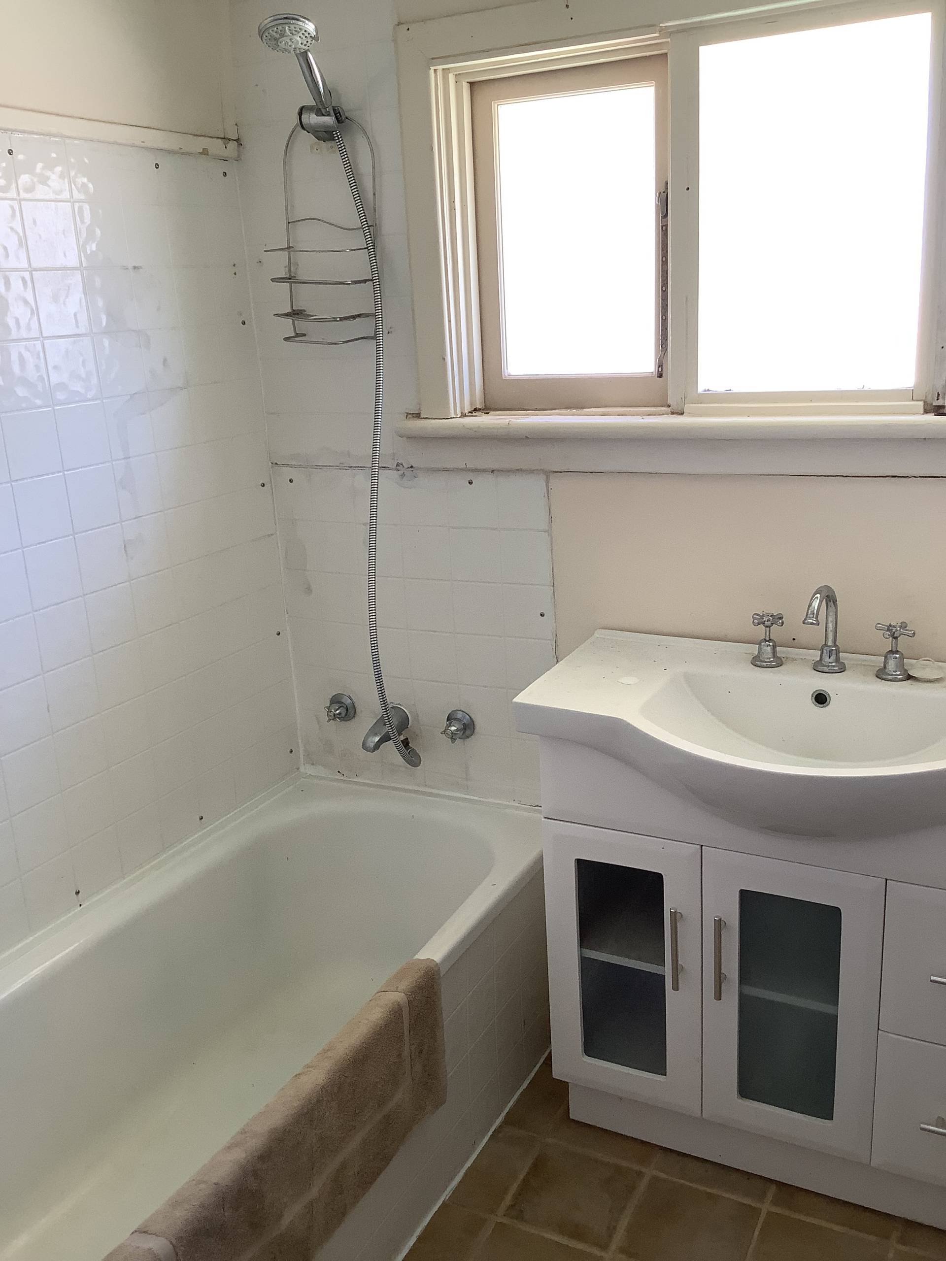 *Tidy bathroom with w/c, vanity and shower over bath