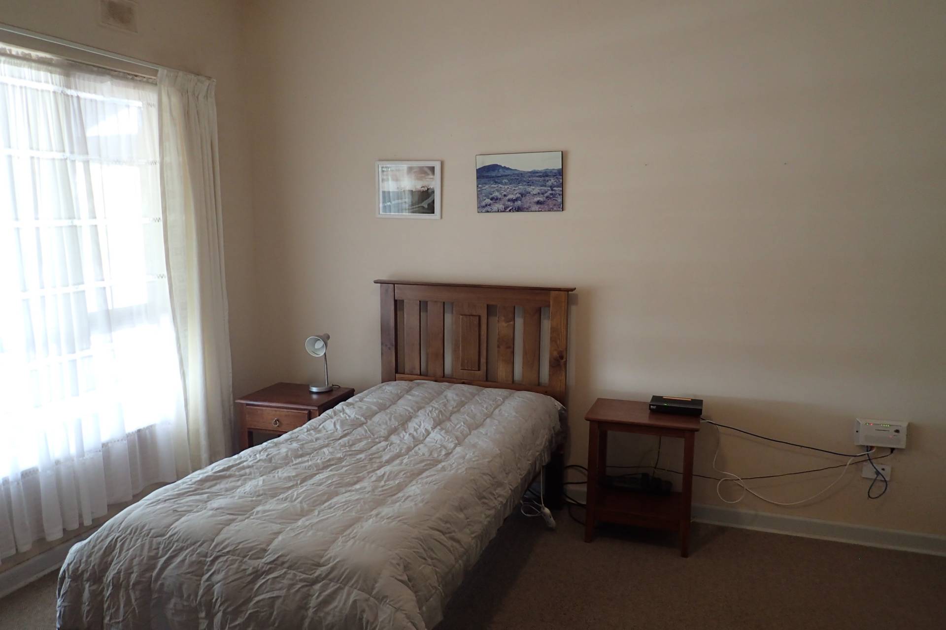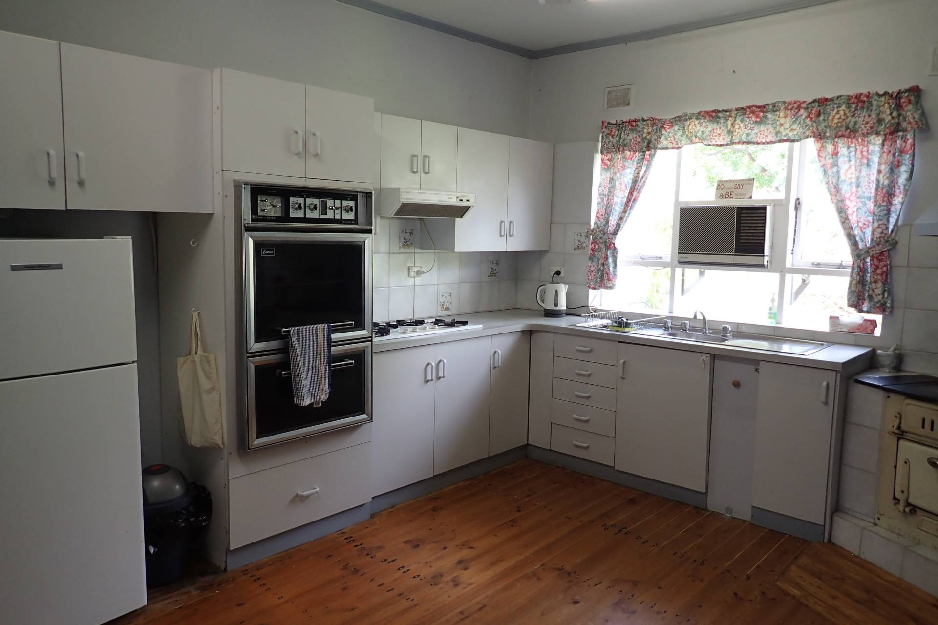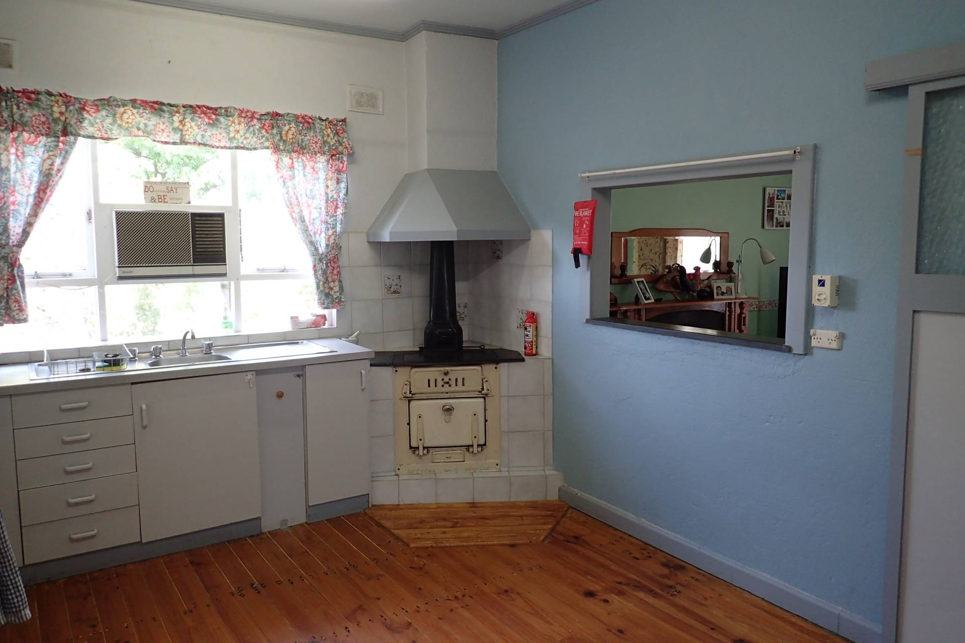 - Kitchen has wall oven, electric stovetop, rangehood and Metters wood fired oven, window air-con with pine floor boards