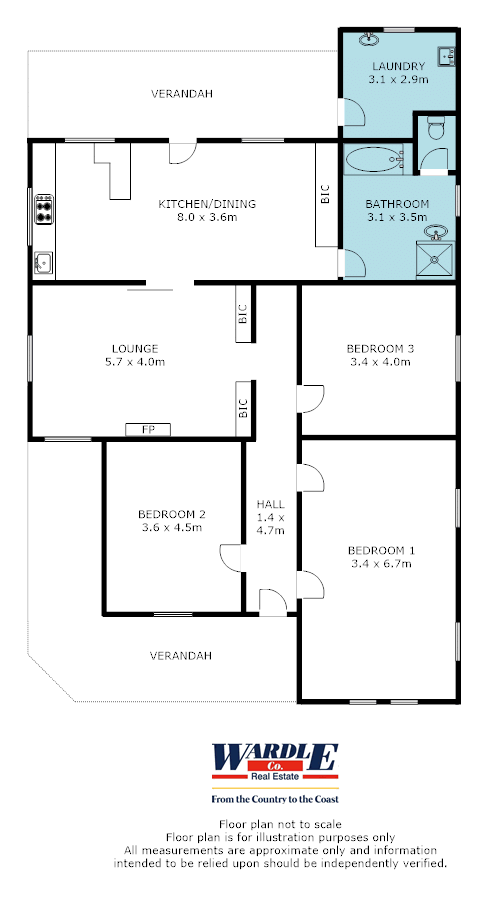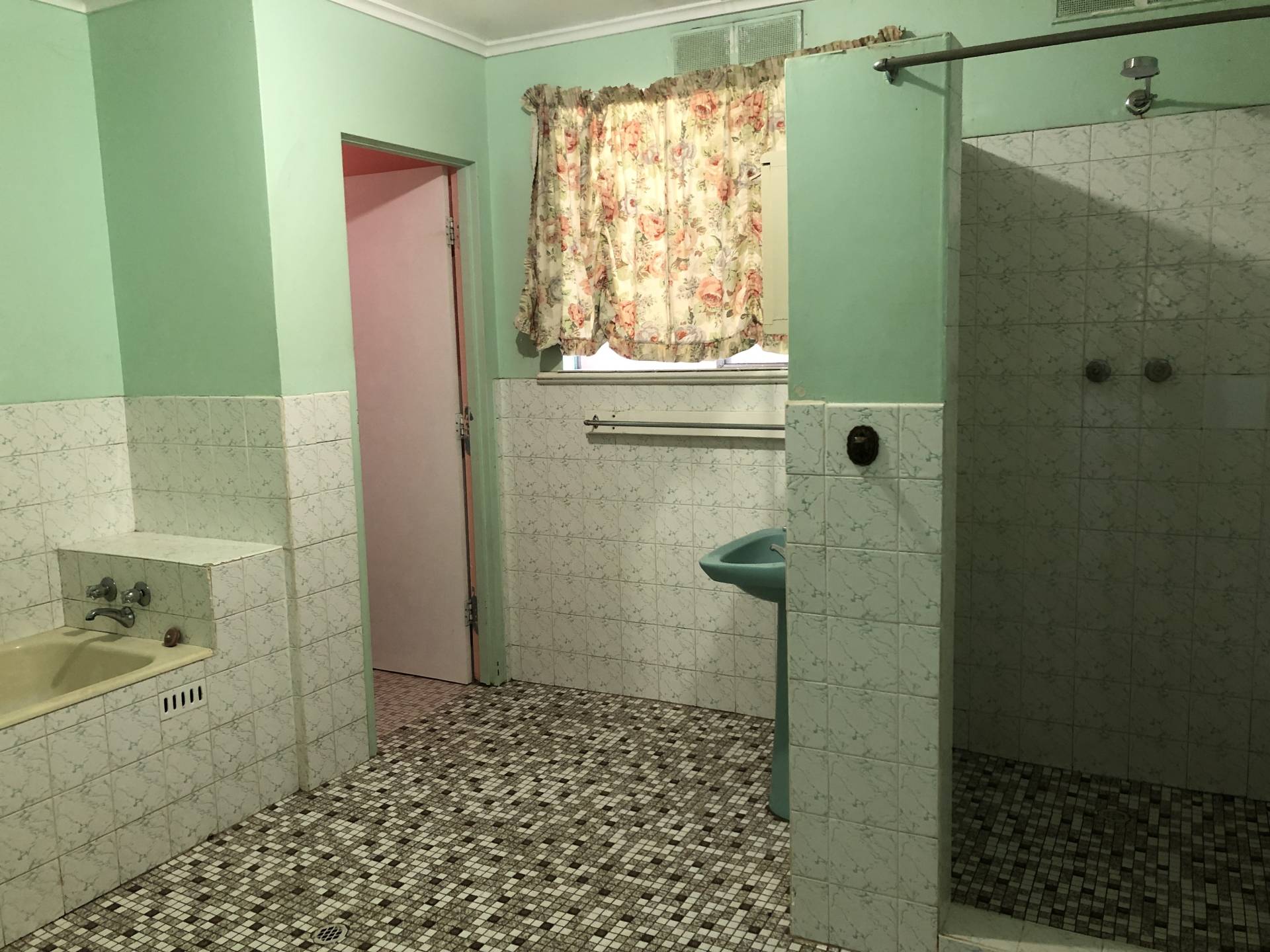 The large lounge showcases timber flooring and flows to a neat, updated kitchen with refurbished cabinetry and lino flooring. The bathroom is generous in size and includes a separate shower alcove, bathtub, and a toilet, while the laundry is located separately under the rear verandah.