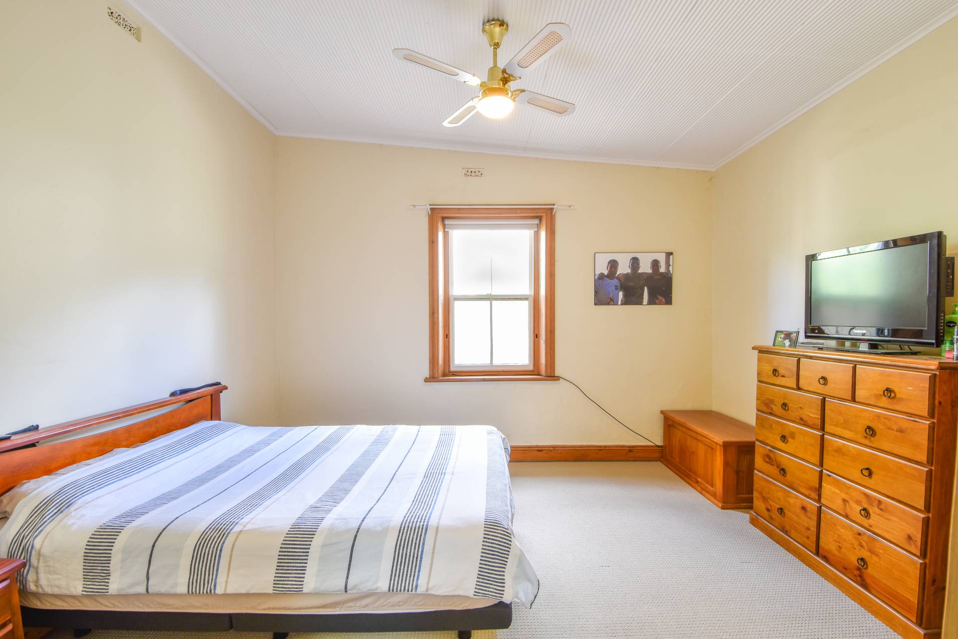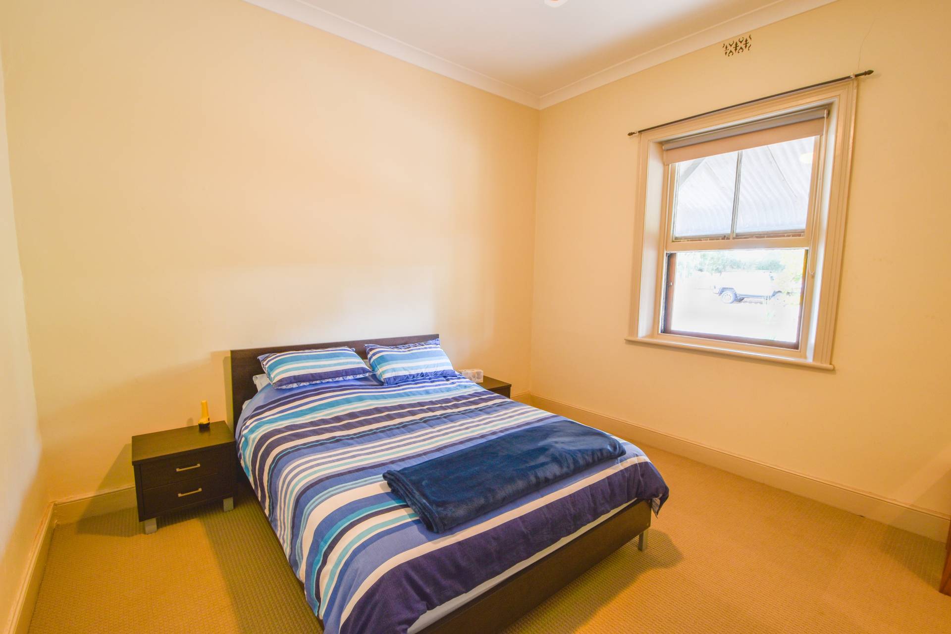 The 3 bedrooms with carpet floors and ceiling fans in bedrooms 1 & 3 are comfortable, and the ornate fireplace in Bed 2 and mini orb ceiling in Bed 3 add character to the rooms.