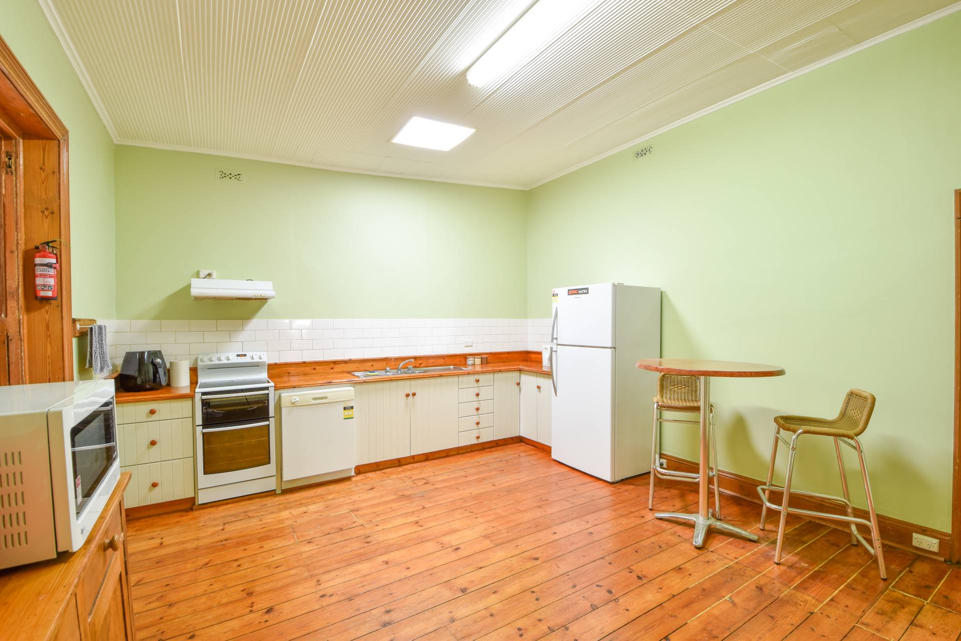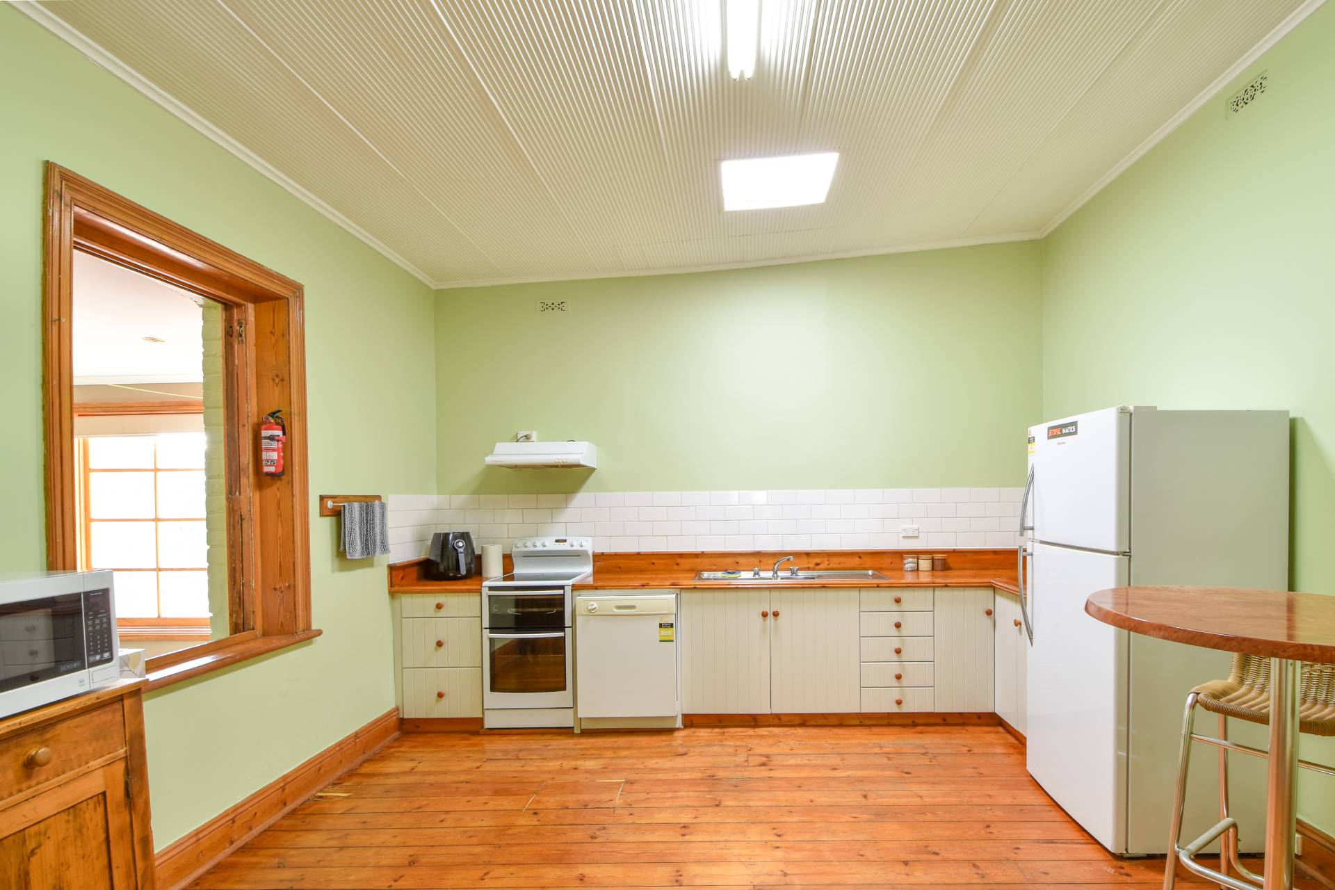 The updated bathroom with floor to ceiling tiles, new shower, single vanity, and toilet are modern and convenient. The spacious kitchen with pine benchtops, plenty of cabinetry, freestanding electric oven, cooktop with rangehood, and dishwasher ideal for cooking and entertaining guests.