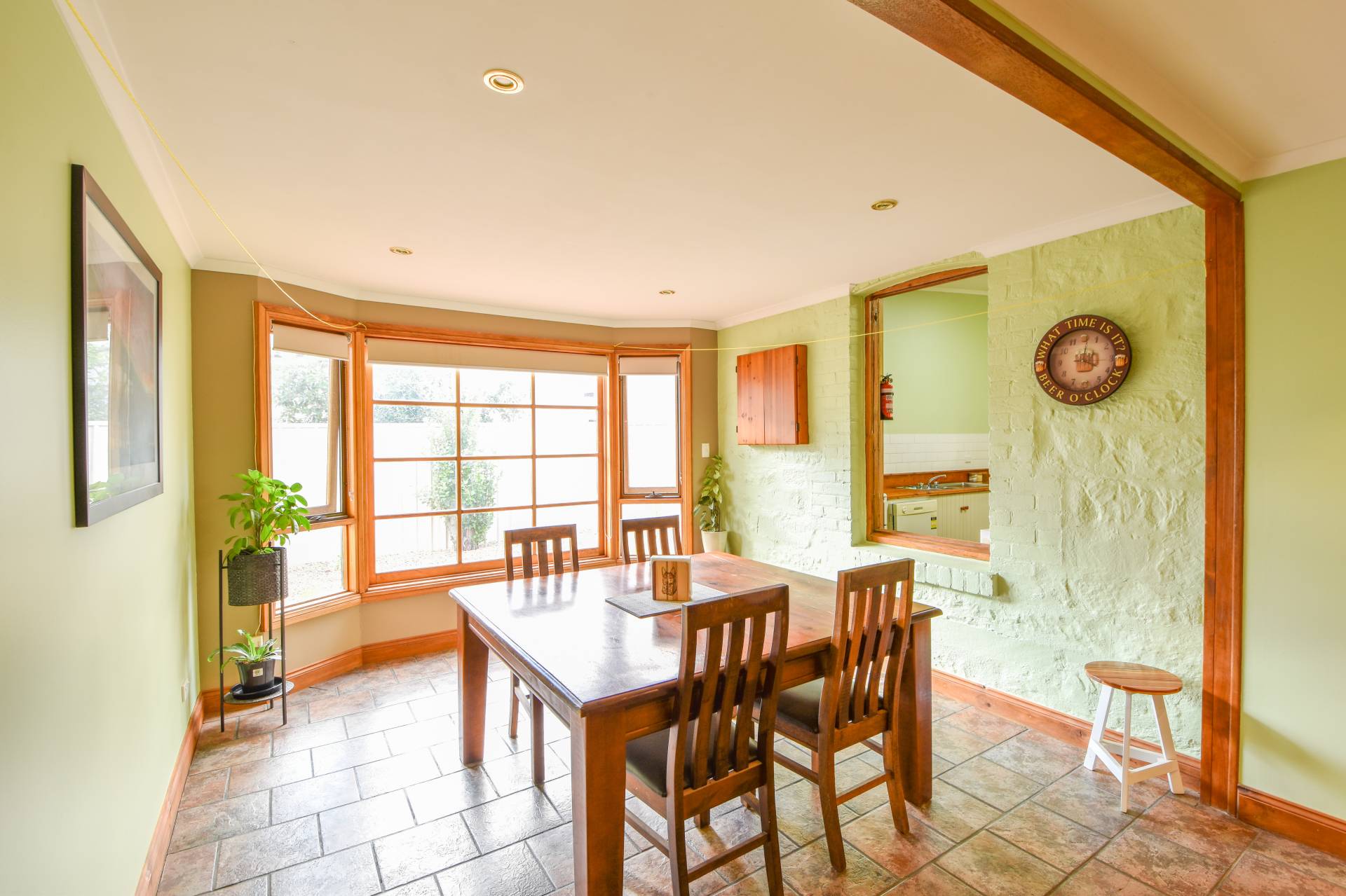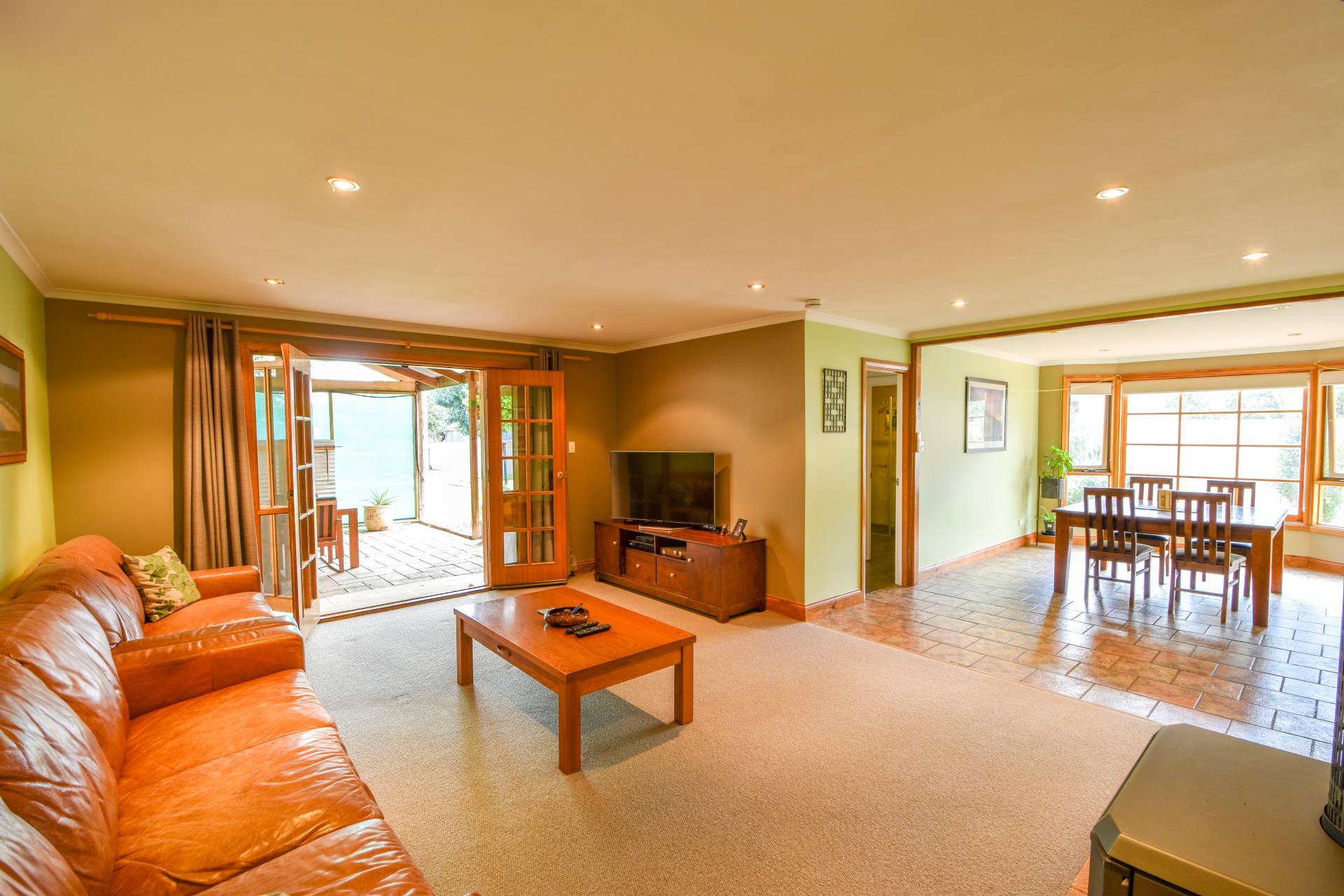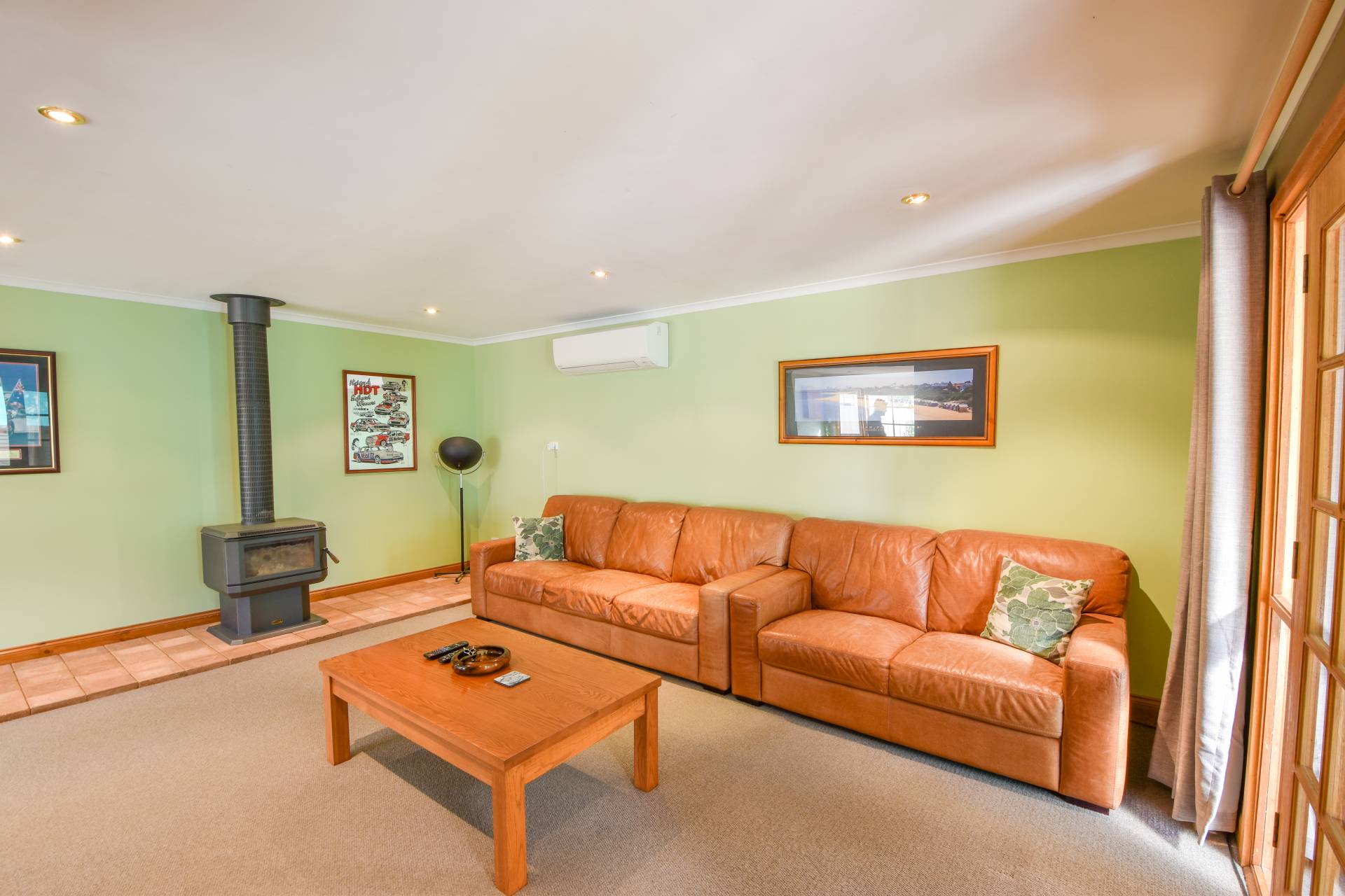 The lounge/dining room with a large bay window and double french doors opening to the outdoor patio, slow combustion heater, and split system air-con also make for comfortable and inviting spaces.