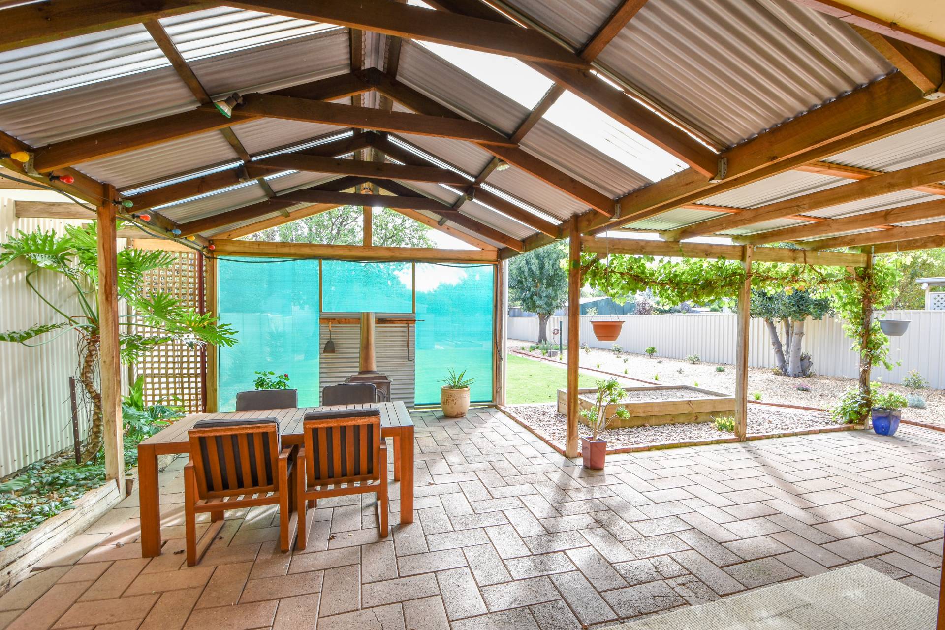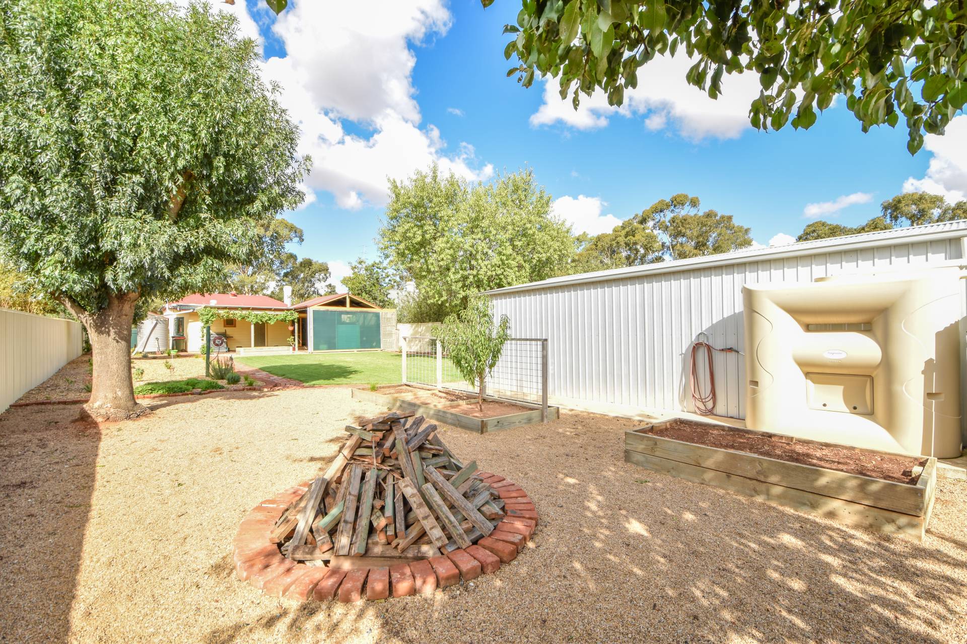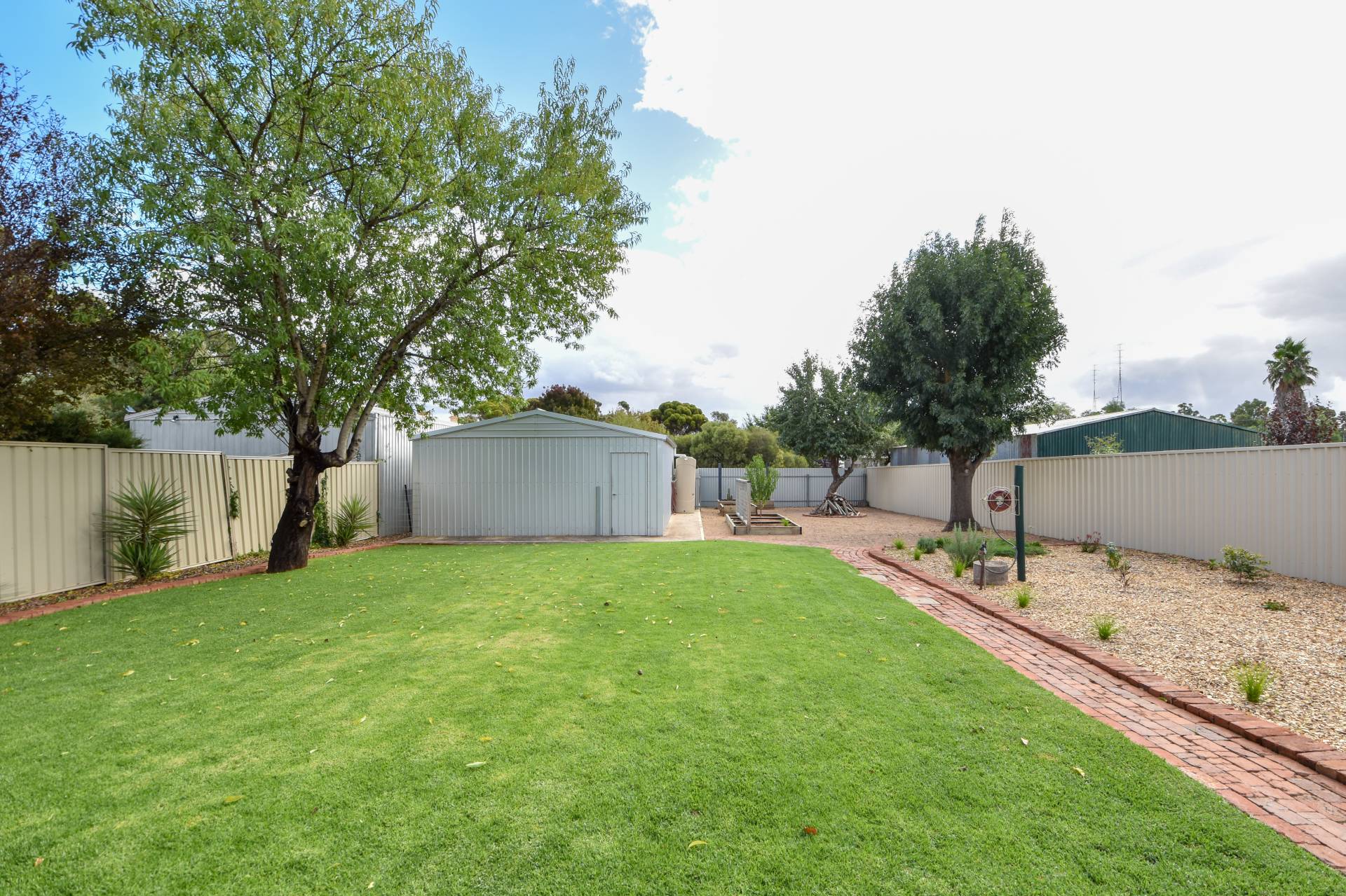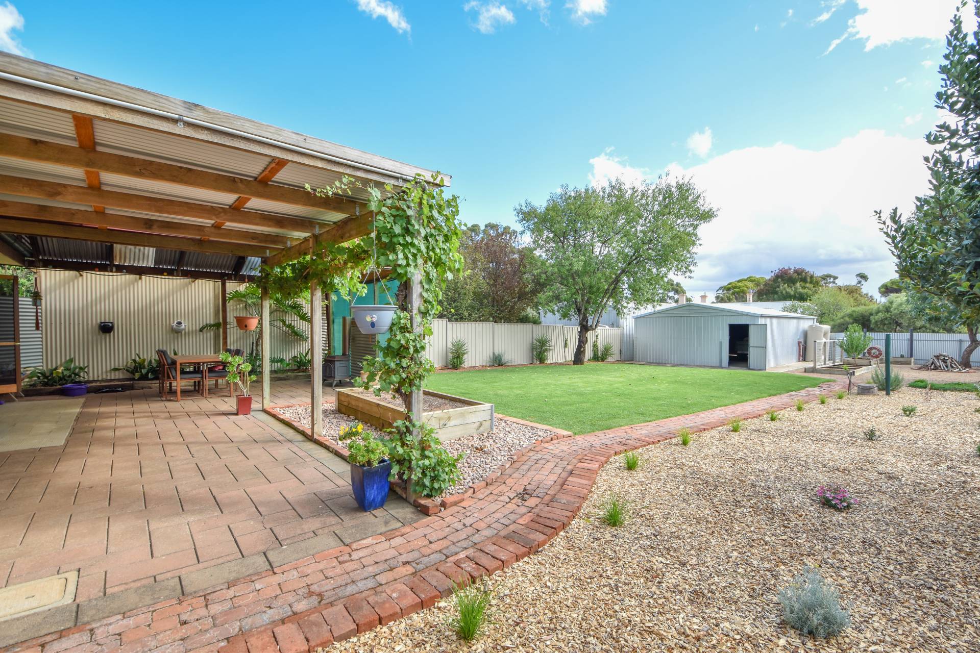 The single car carport with gravel driveway is convenient, and the fenced rear yard with a lush green lawn, small shrubs, and 3 veggie garden beds is perfect for families with kids or pets. The 6 x 9m shed with concrete floor, power, and double sliding doors are a great addition for tinkers, bike enthusiasts, or anyone in need of extra storage space.