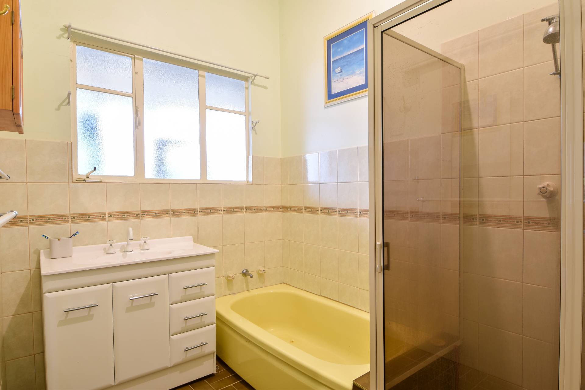 - Neat bathroom with shower, bath, vanity and built in cupboard