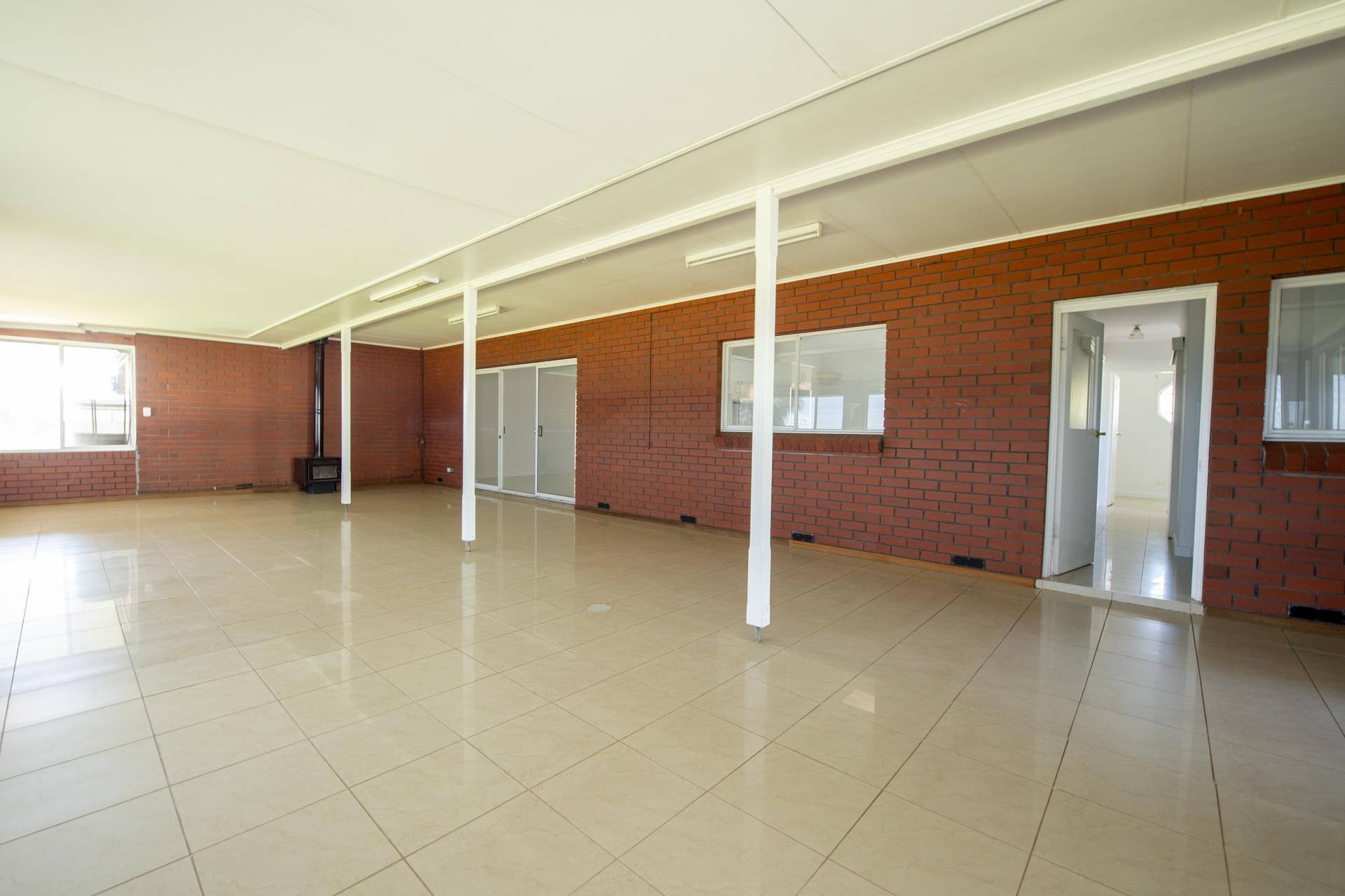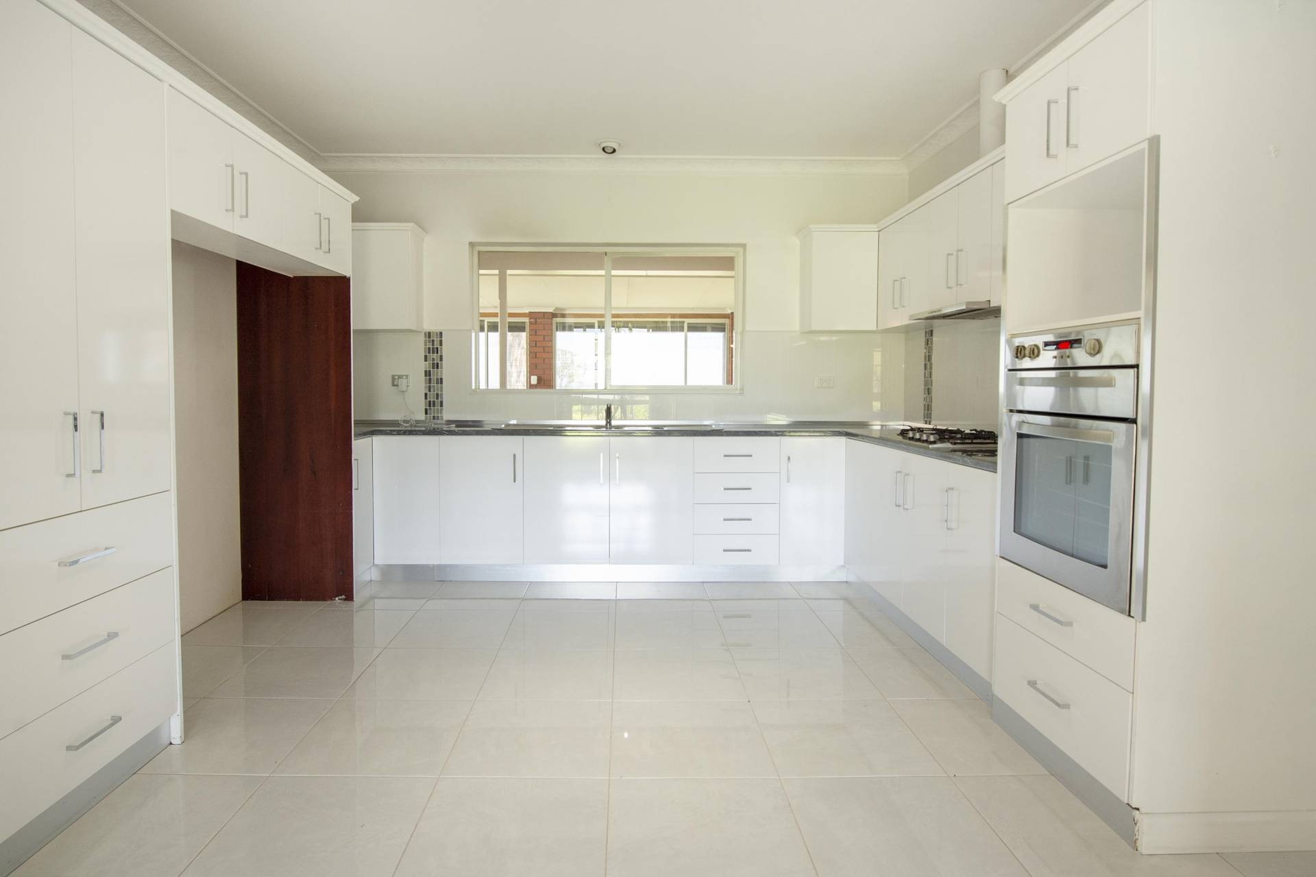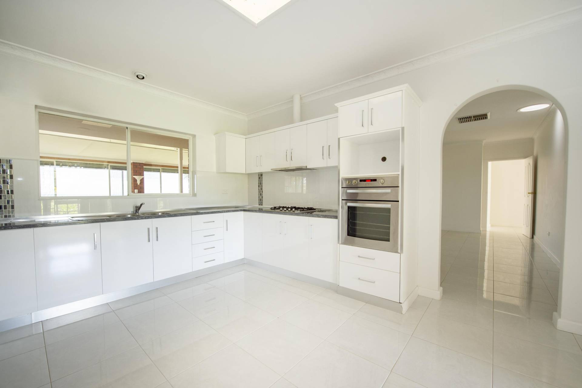 • Expansive country-style eat-in kitchen with ample quality cupboards, generous bench space, ceiling fan, and skylight.