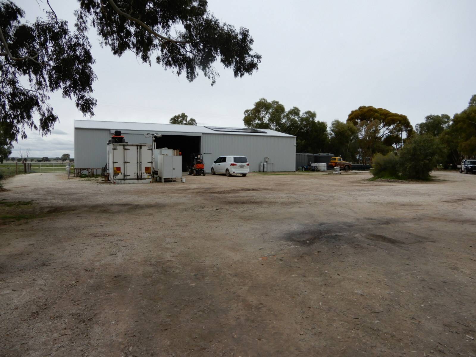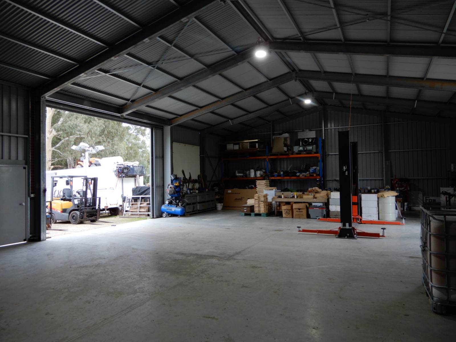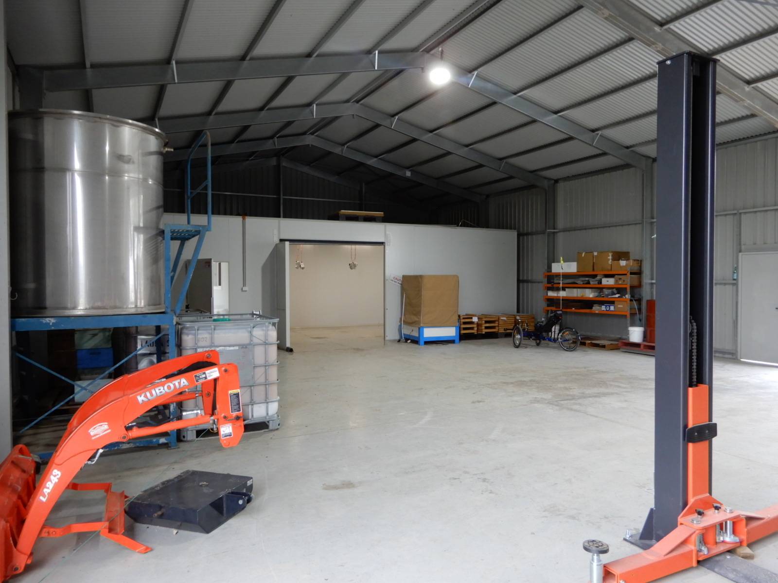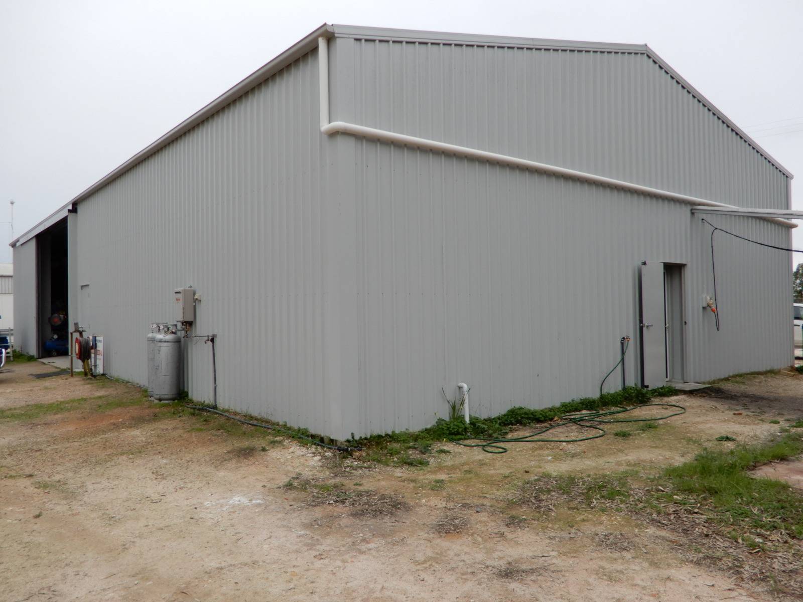 Olympic colourbond shed 80' x 40' with double sliding doors front and back 16' high for drive through vehicle access, two access doors and sliding door to the front office (4.6m x 3.6m) lined with cool room panels and PA access. North and South gates.