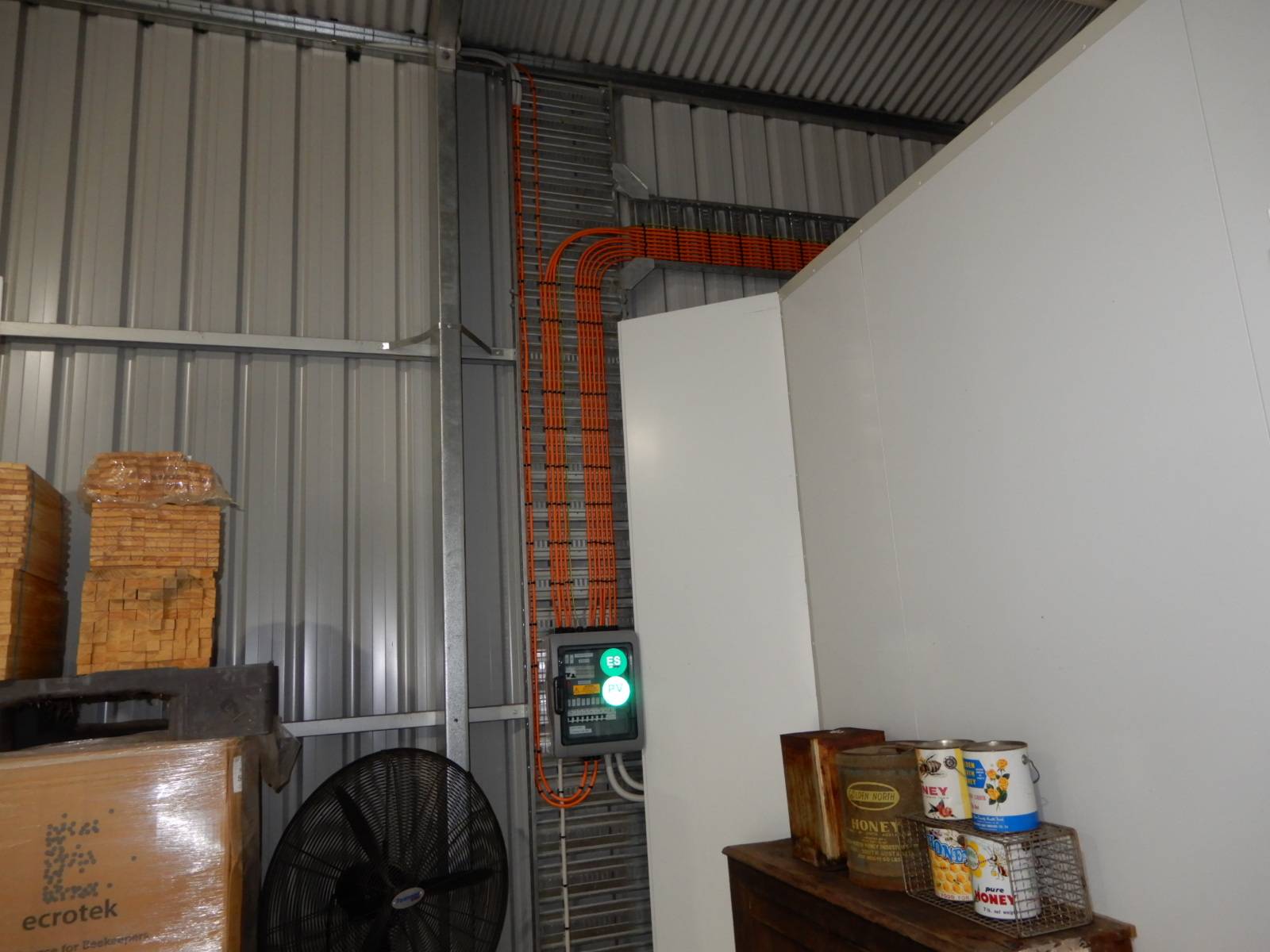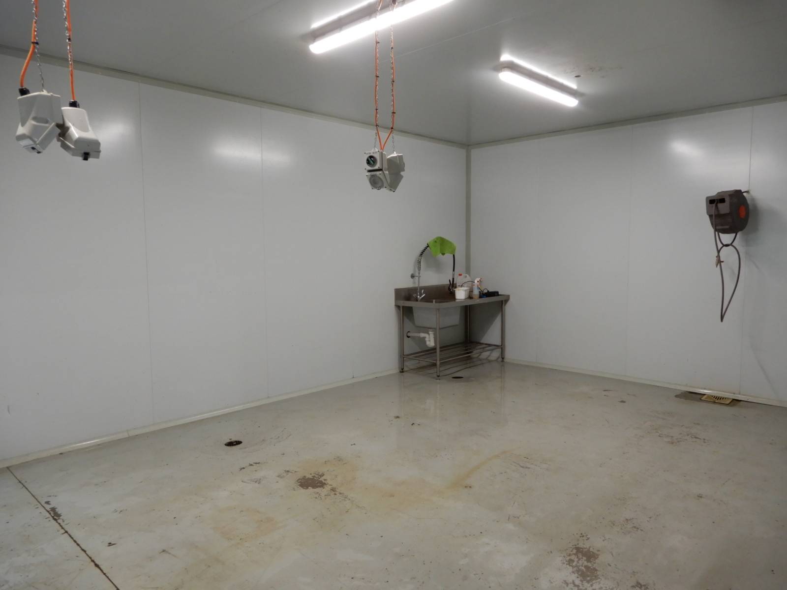 8m x 4.6m area sectioned off lined with cool room panels, roller door, floor drain, screened PA door plus industrial sink and hot water wash down line.