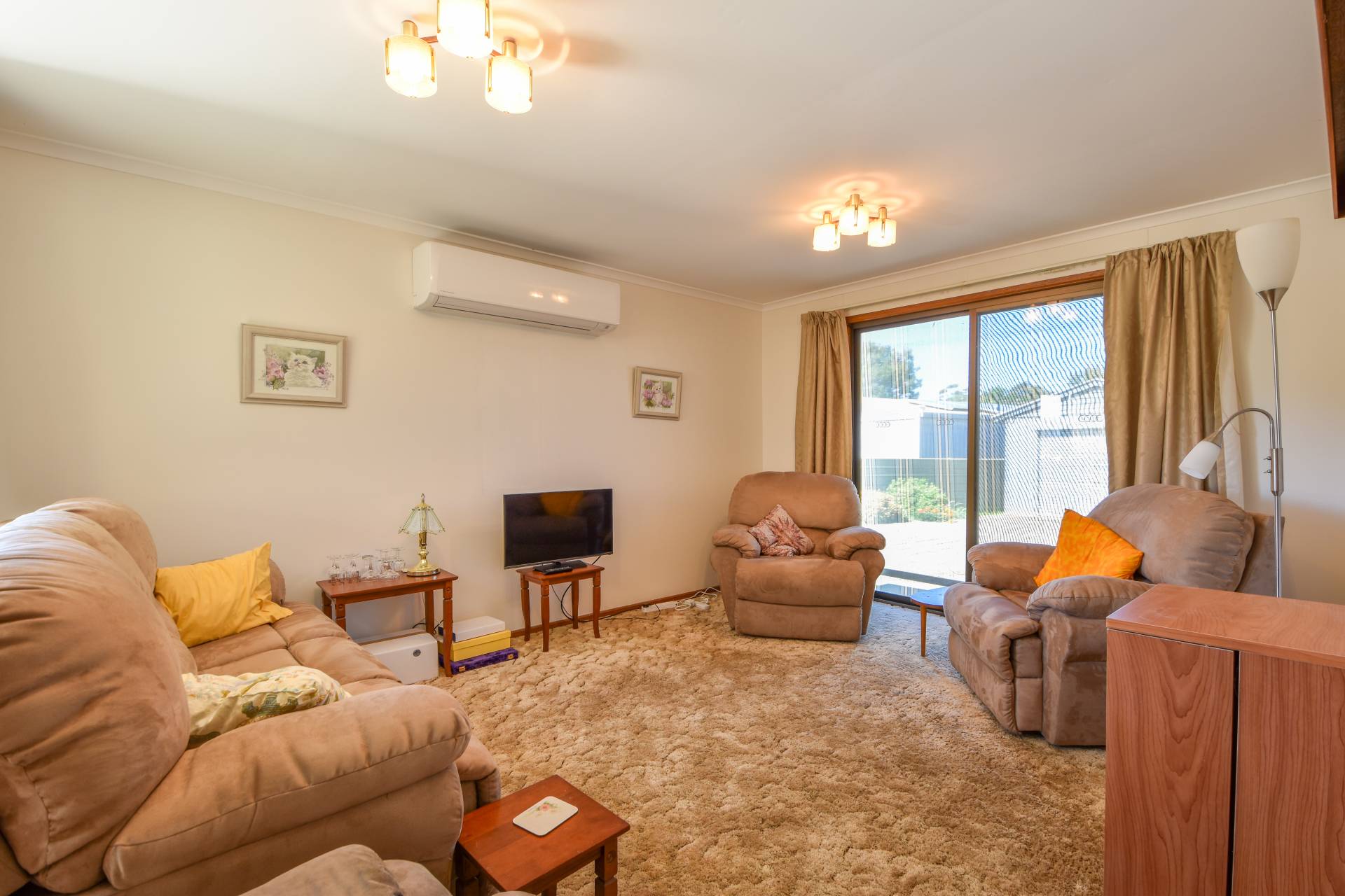 - Lounge room has carpet floor and split system air conditioner with sliding doors leading to front porch