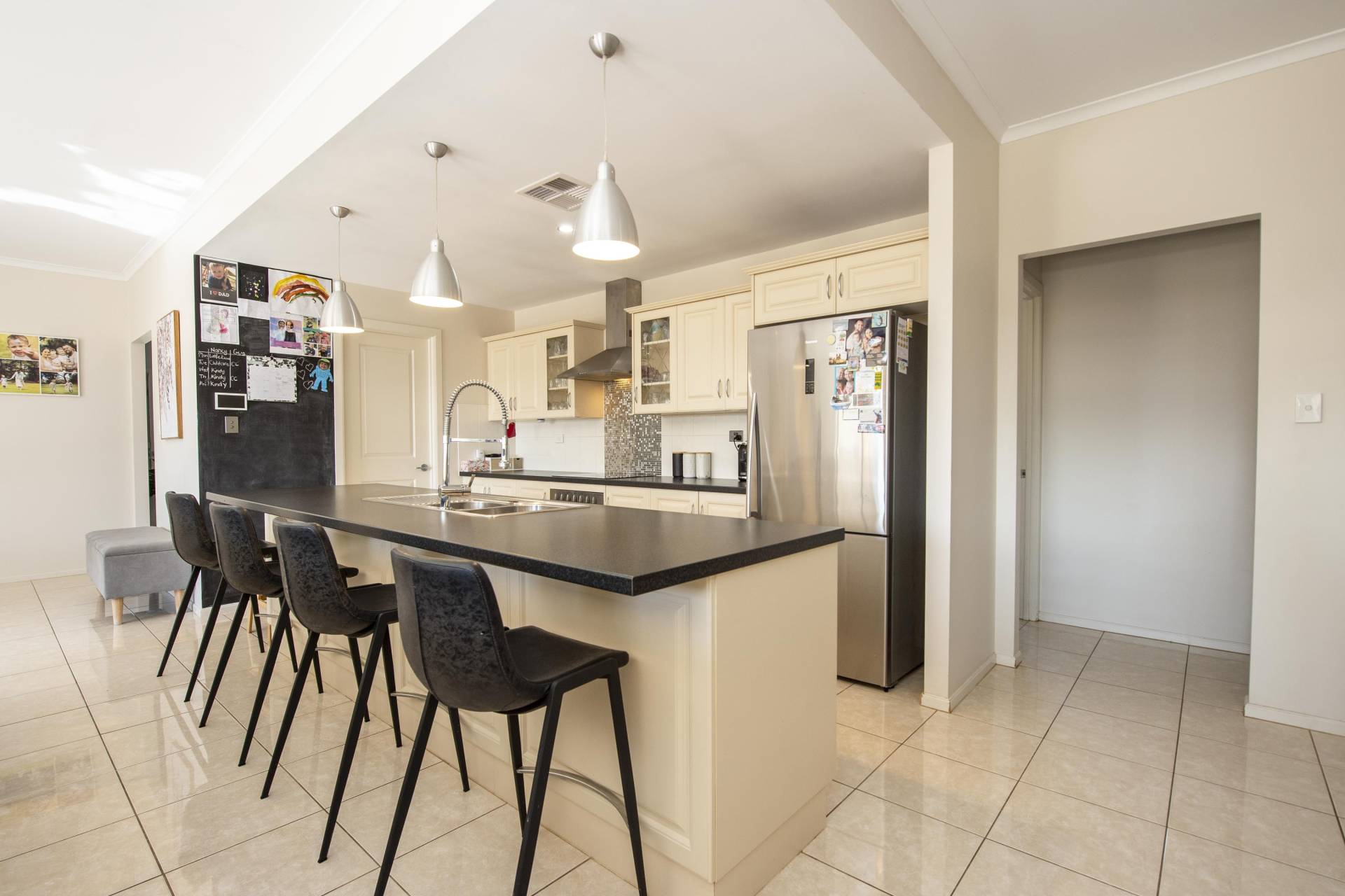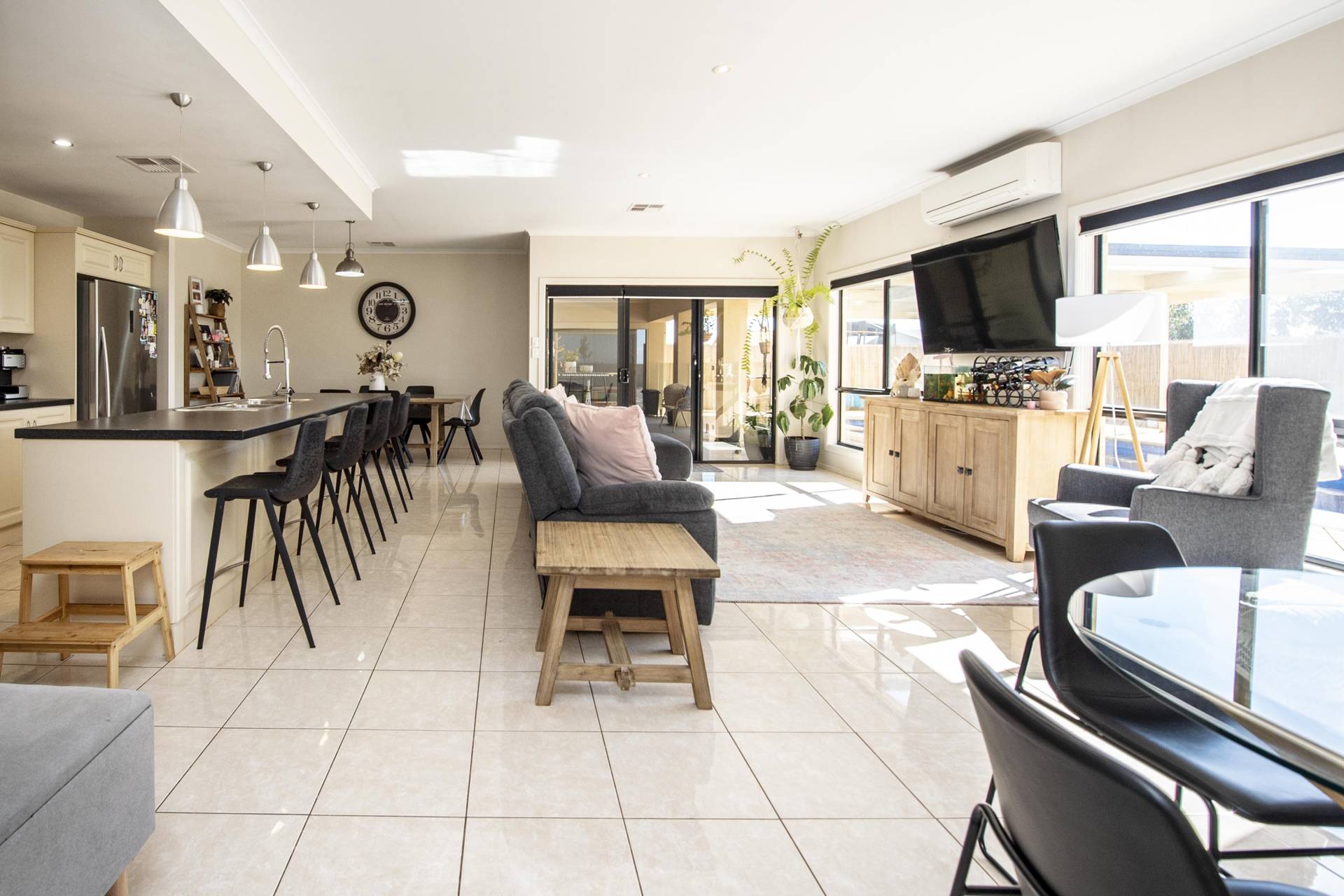 • Open-plan living spaces including a tiled kitchen, family area, and dining space.