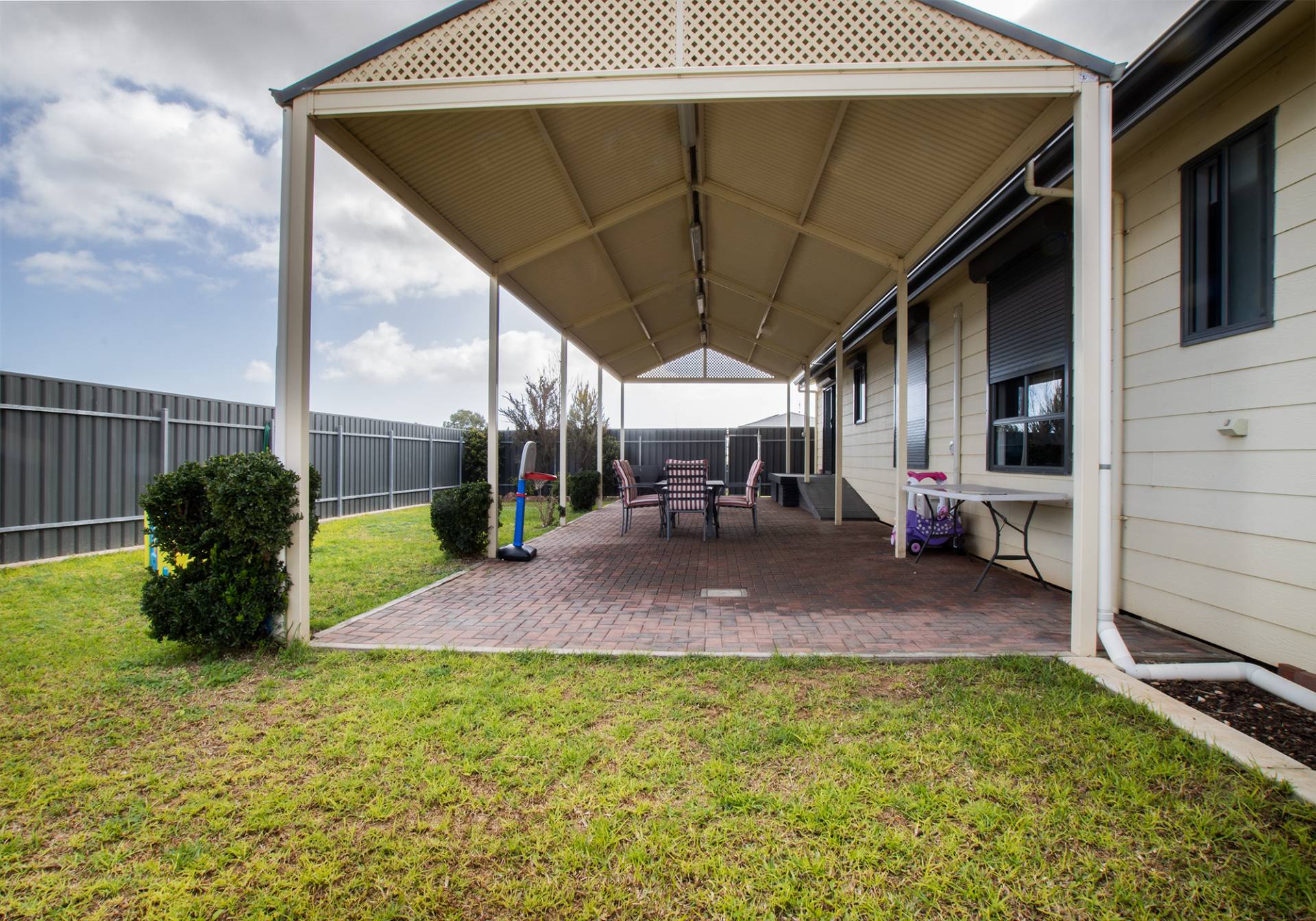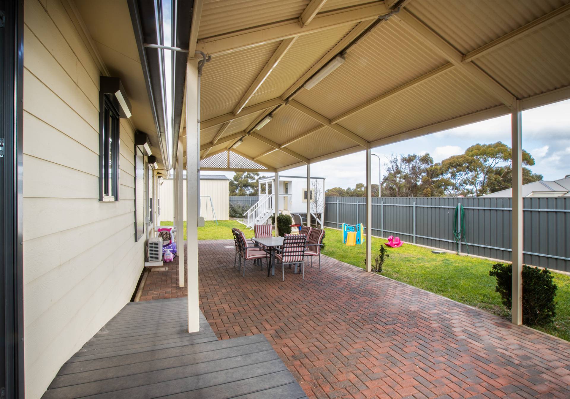 This home has 4 bedrooms, master bedroom having walk-in robe, ensuite and split system a/c, bedrooms 2 and 3 with built-in robes, one with split system a/c and all bedrooms have ceiling fans. Family room with split system a/c and ceiling fan, modern open plan kitchen with corner pantry and dishwasher, dining/family room with built in storage and split system a/c. Main bathroom with shower and bath, separate vanity, w/c and laundry. This home has roller shutters and rainwater plumbed to the house. Outside is a 40' x 10' shed with concrete floor and power, double length carport, paved outdoor entertainment area, cubby house and fenced low maintenance grounds. This property is on a corner allotment of 745m2 and has side access from Thomas Street.