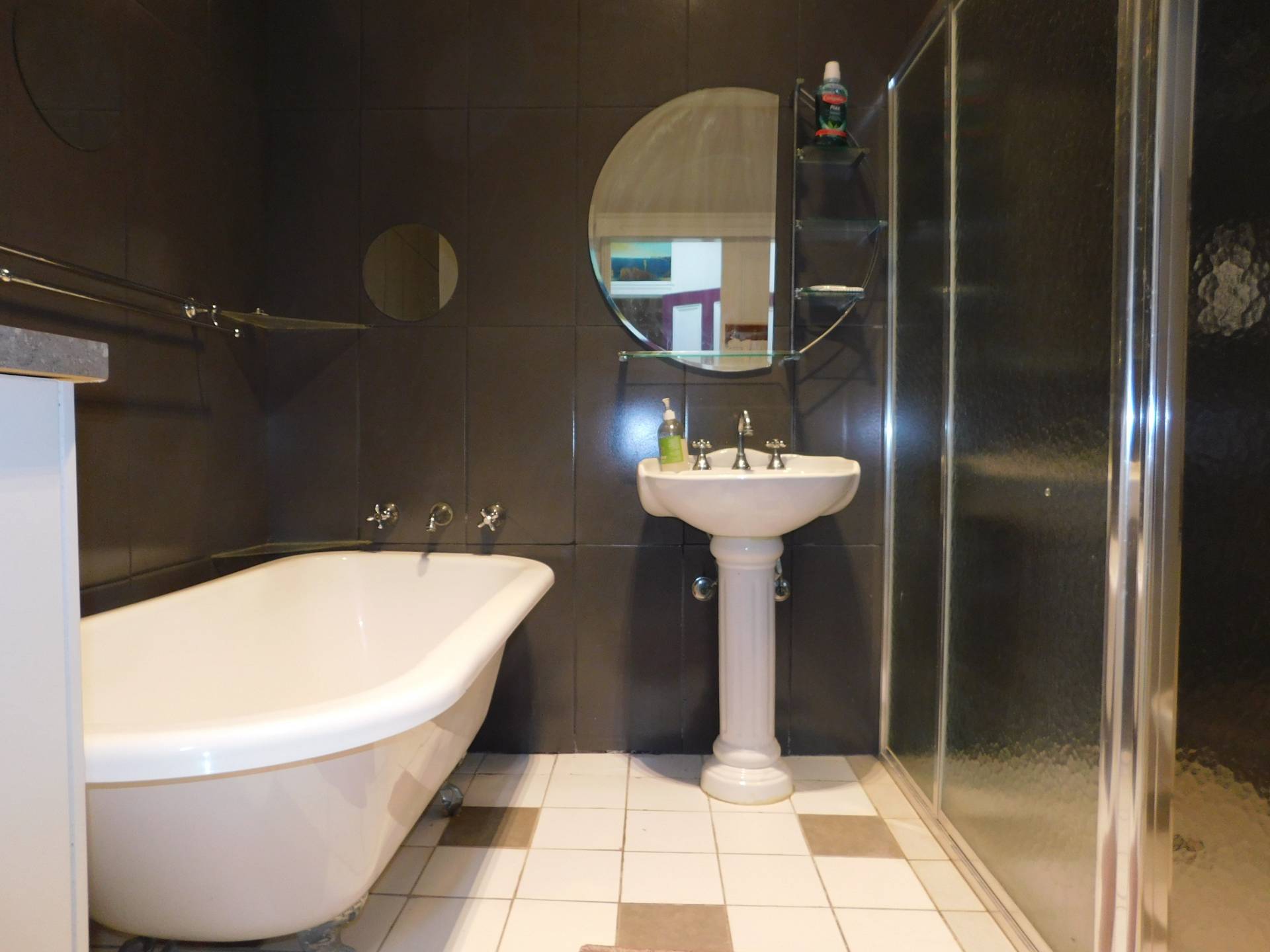 - Bathroom features claw foot bath, pedestal basin and separate shower.