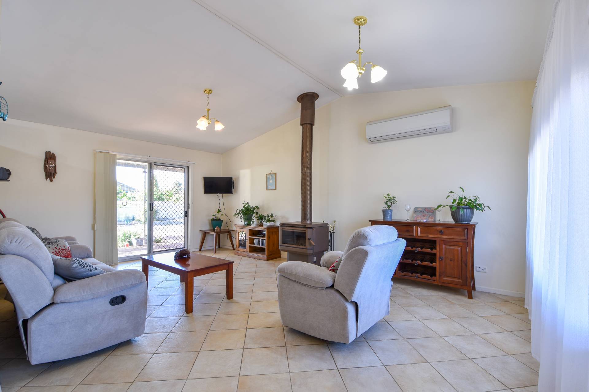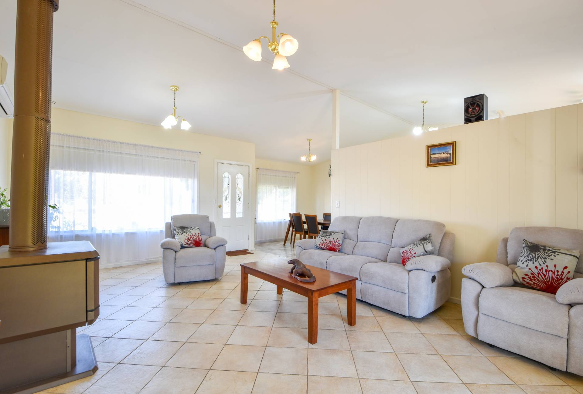 Entering through the front door you will be greeted with the spacious tiled living area, complete with a reverse cycle split system air conditioner, a cozy slow combustion heater, roller shutters for added security, and an abundance of natural light streaming in through the large windows and sliding door.