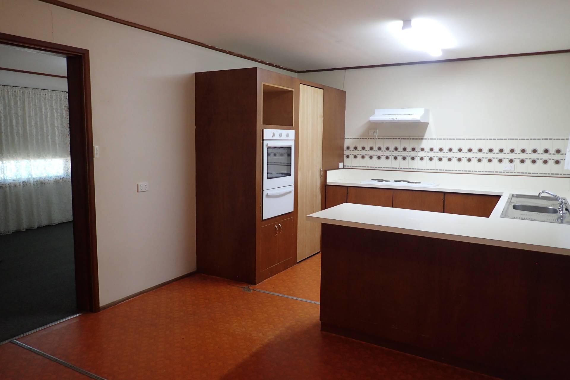 • Kitchen has linoleum floor and timber laminate cupboards and benchtop with electric cooktop, wall oven and rangehood