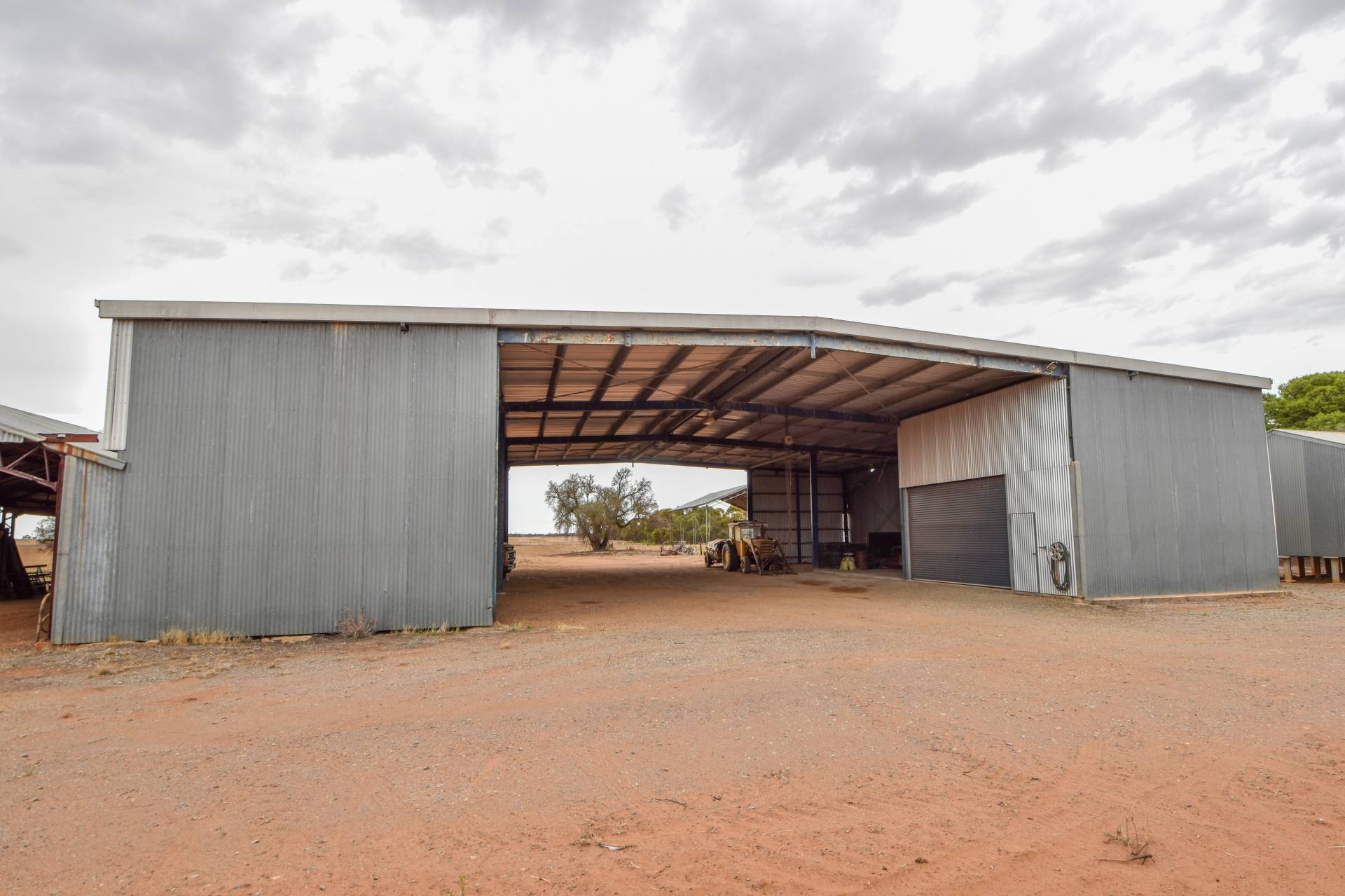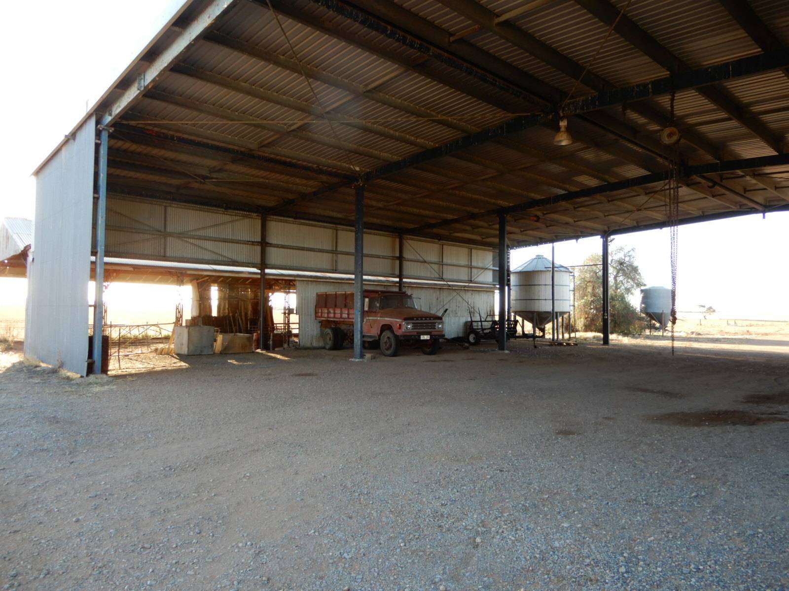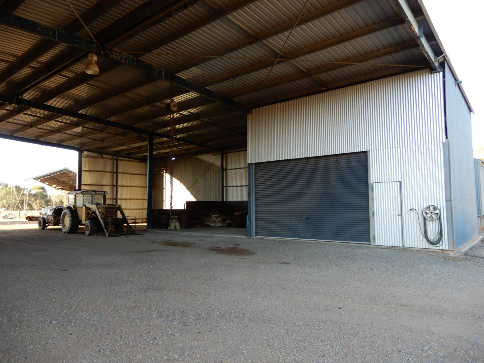 • 26m x 23m x 6m implement shed including 7.5m x 6.2m workshop with power and concrete floor, super storage and an attached 28m x 10m open implement shed