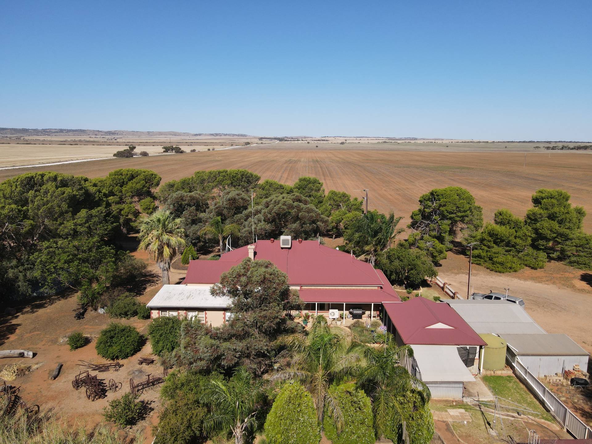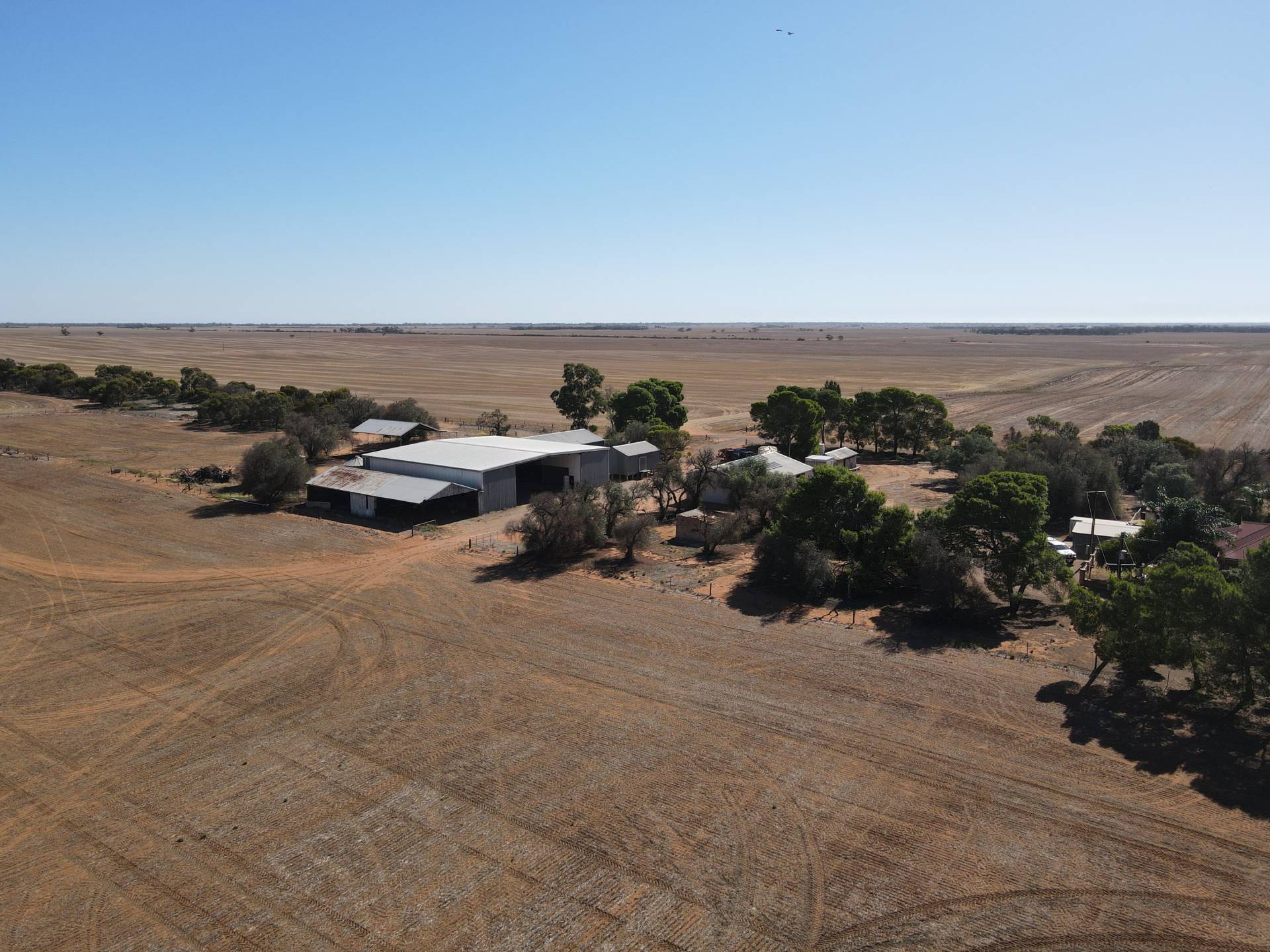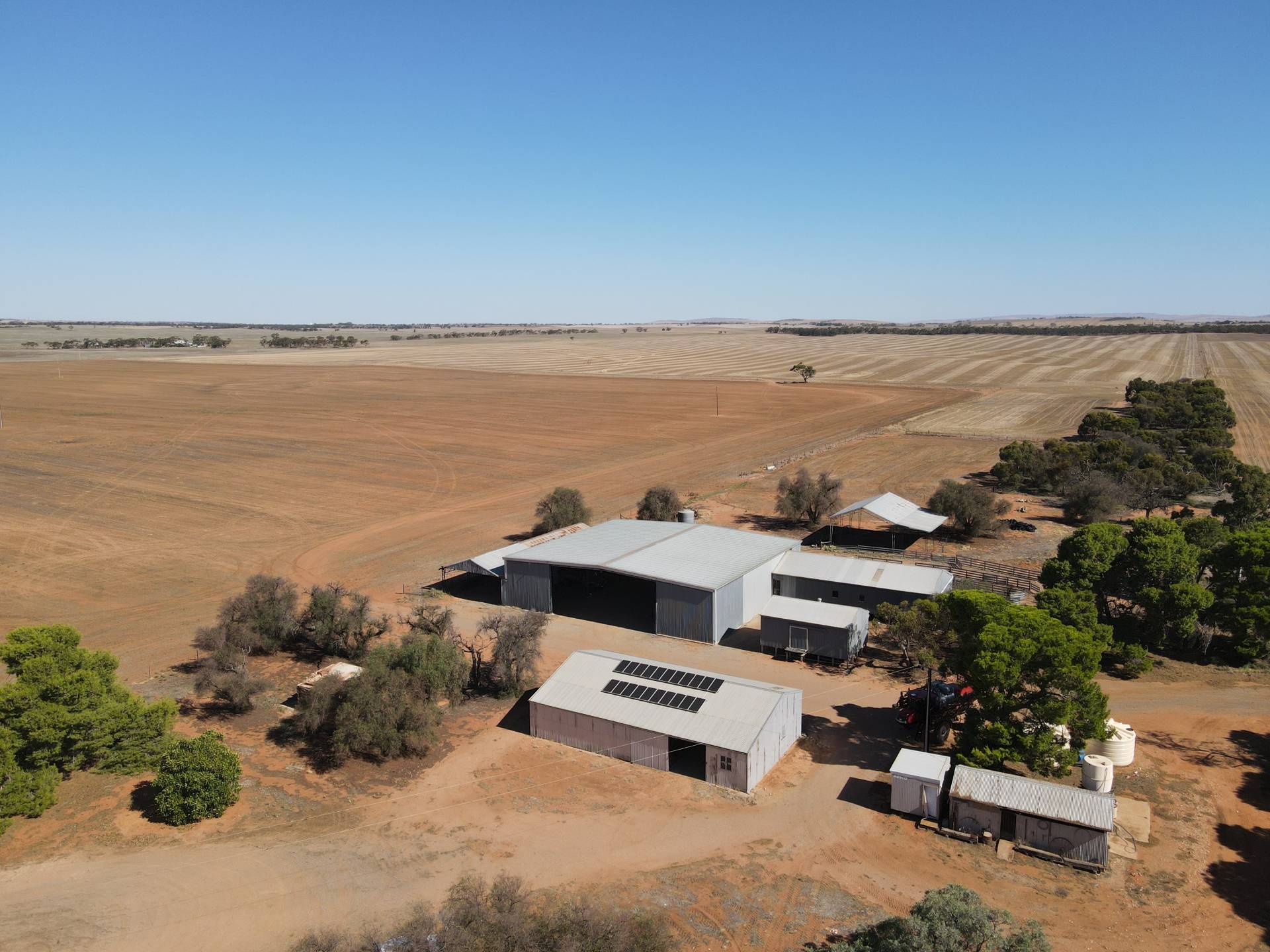 • 26m x 23m x 6m implement shed including 7.5m x 6.2m workshop with power and concrete floor, super storage and an attached 28m x 10m open implement shed