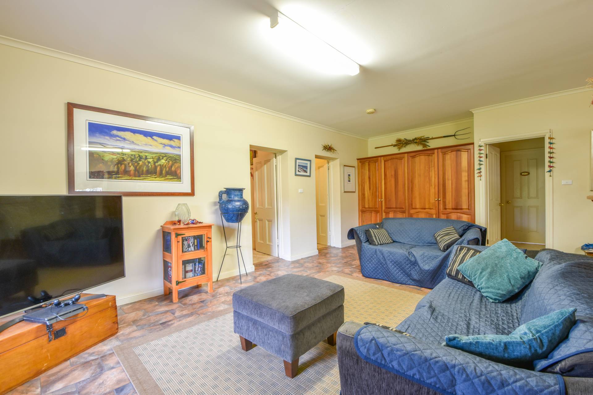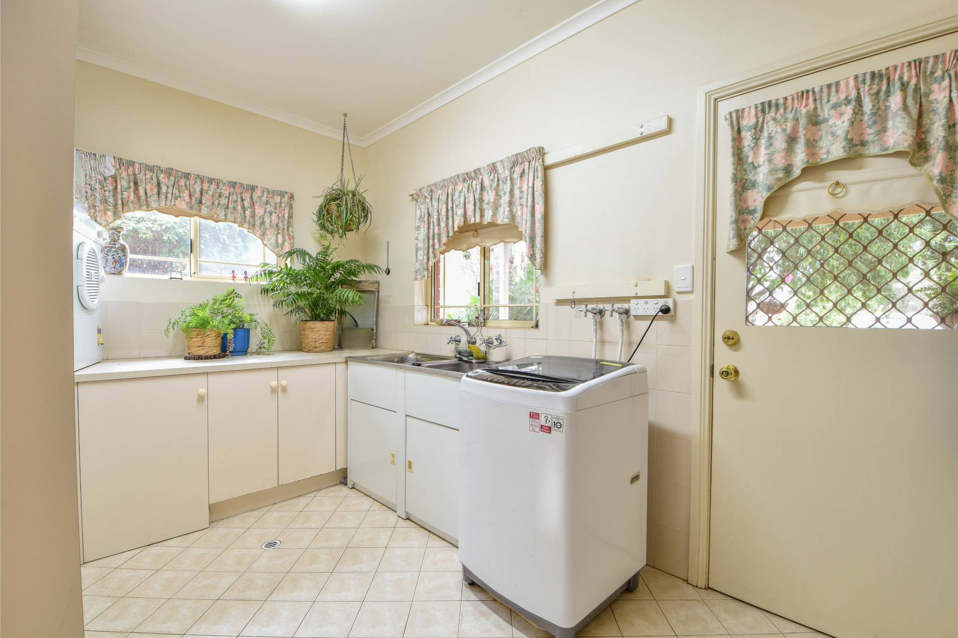 The laundry is fitted with ample storage, including under bench cupboards, a tall linen cupboard, a double stainless steel wash trough, vanity and provisions for hanging a tumble dryer.
