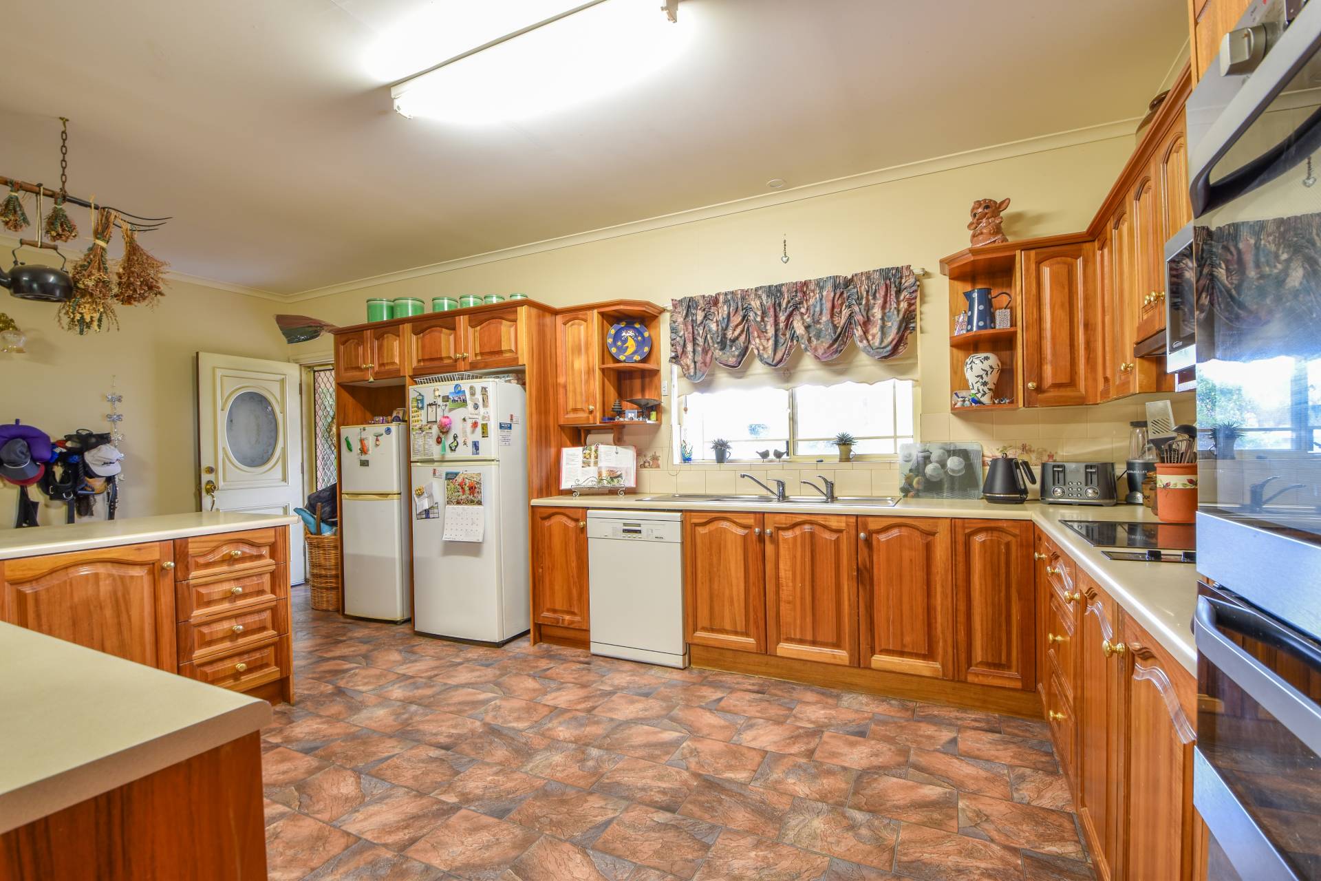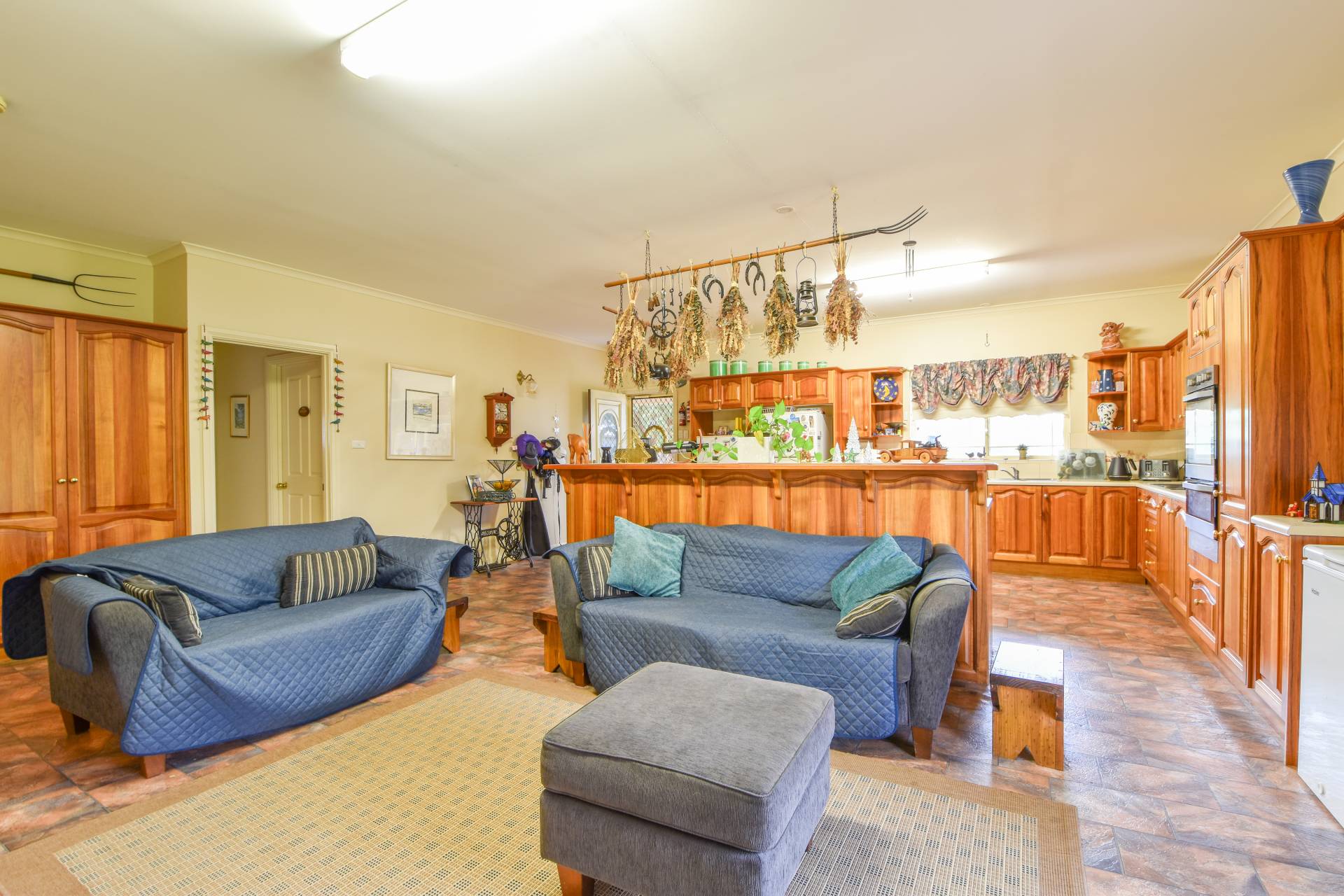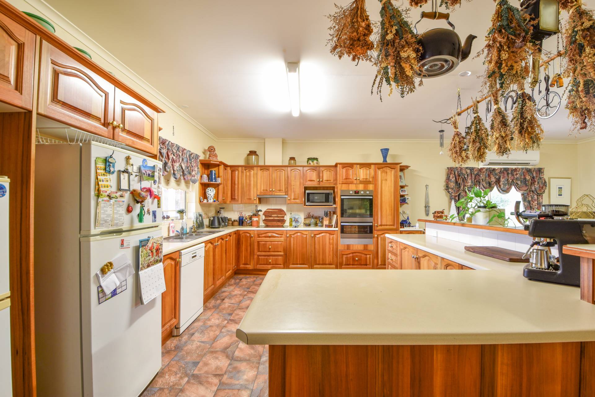 The heart of the home is the open plan kitchen and living area, featuring quality timber cabinetry, stainless steel oven and grill, electric cooktop, double sink, and dishwasher. The split system air conditioning ensures comfort all year round, while additional timber cupboards add both functional storage and style to the space.