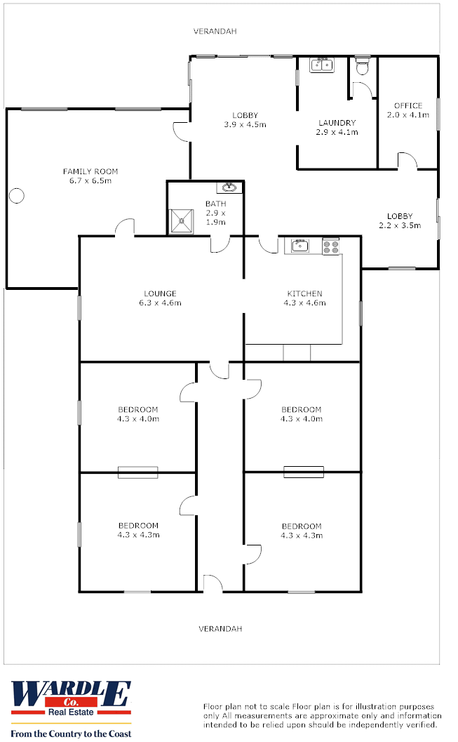 The bathroom includes a shower, bath, and vanity, while the rear lobby offers access to the laundry, separate toilet, and office/storeroom. Glass sliding doors lead to the back and side yards, providing easy access to outdoor living spaces.