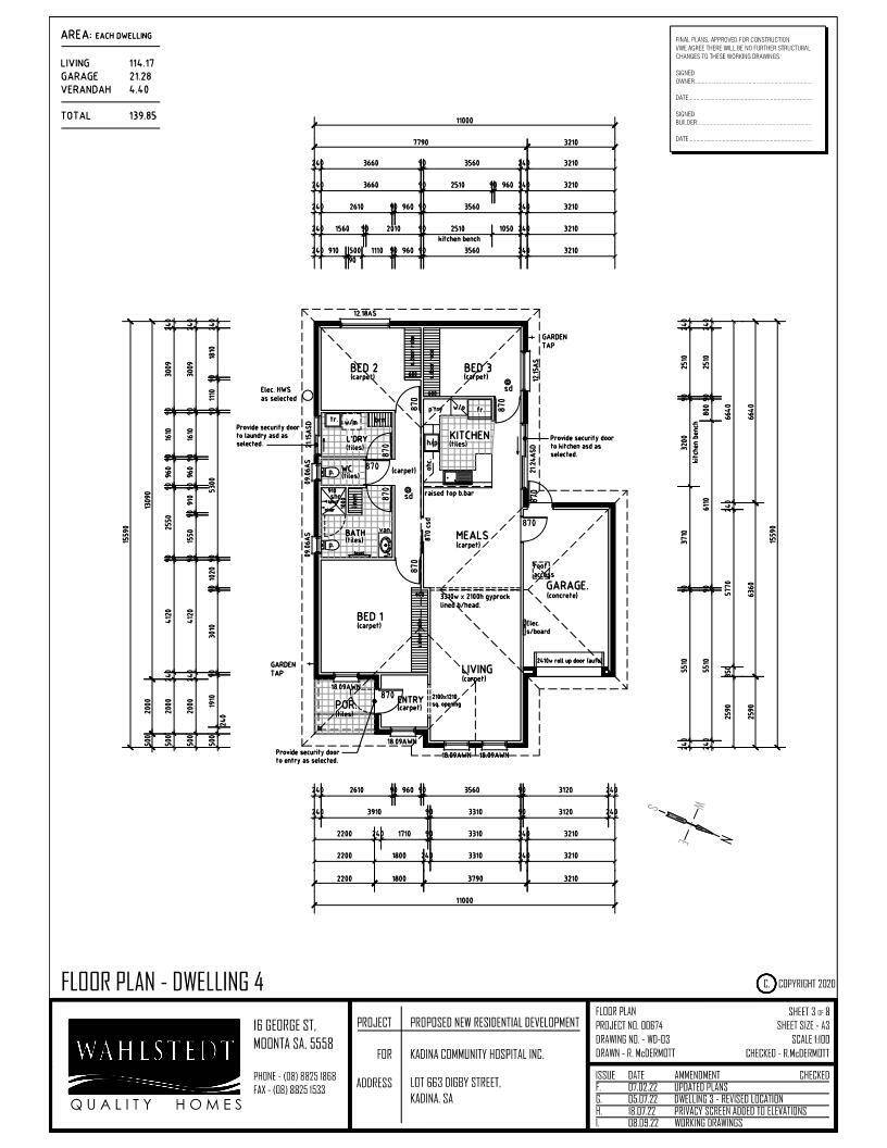 Dwellings 1 and 2 are both 2-bedroom homes, with kitchen, meals and family room, bathroom, laundry and secure garage under main roof.