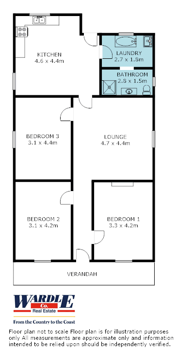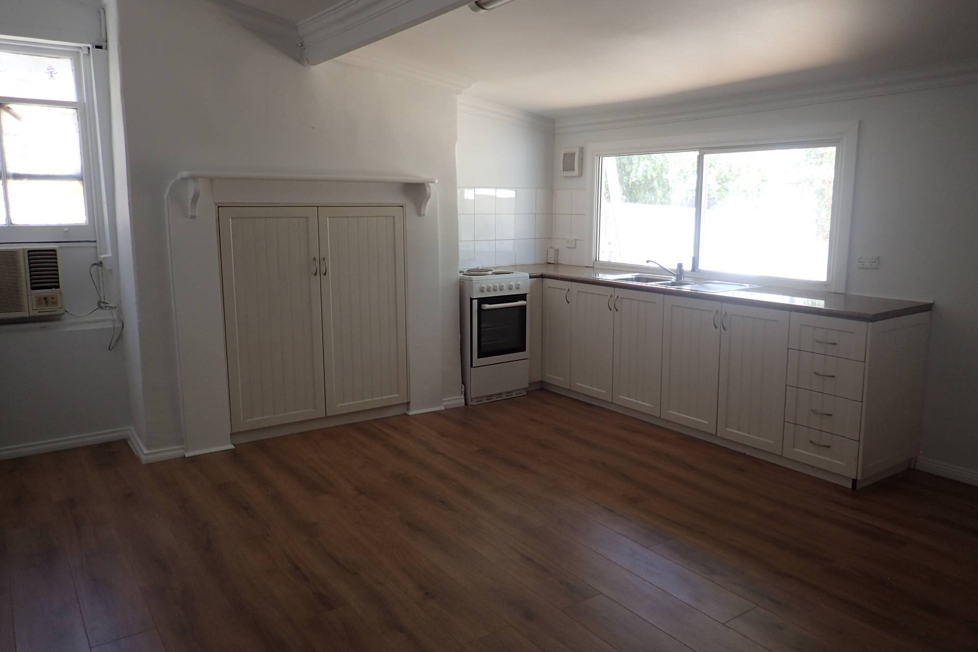 - Kitchen has laminate benchtops, freestanding electric oven and window air conditioner.