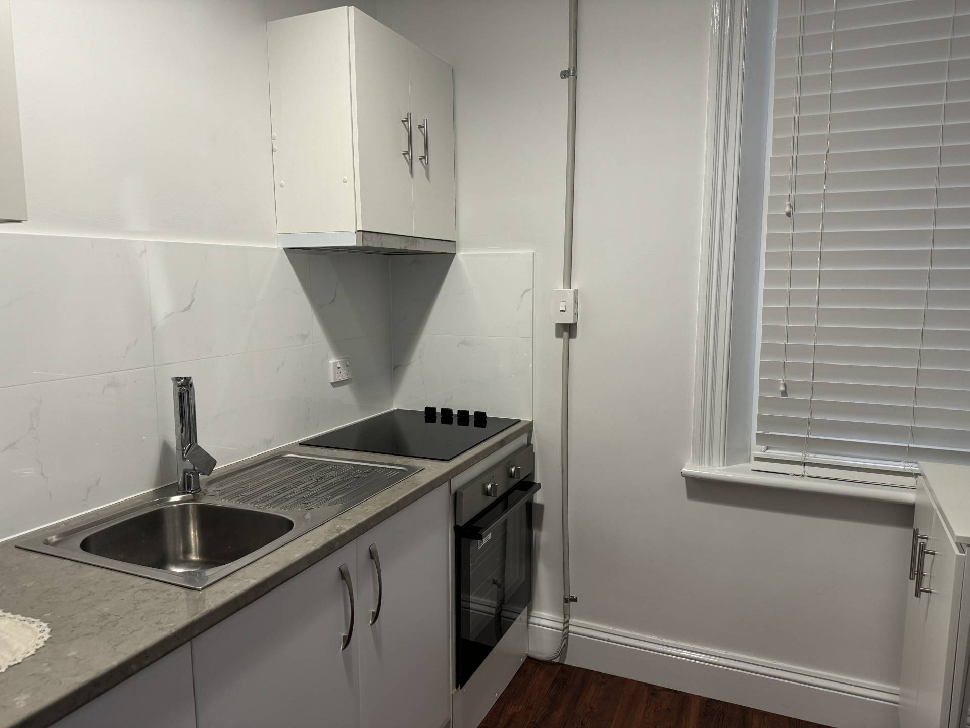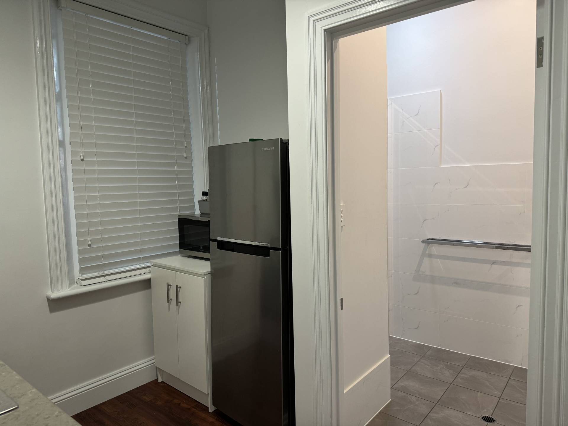 * Kitchen with electric cook top & oven, fridge, microwave & pantry cupbd.