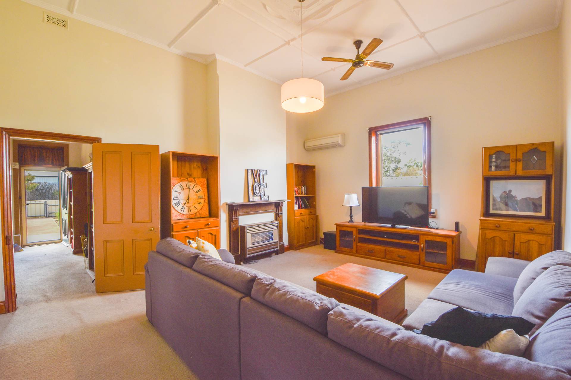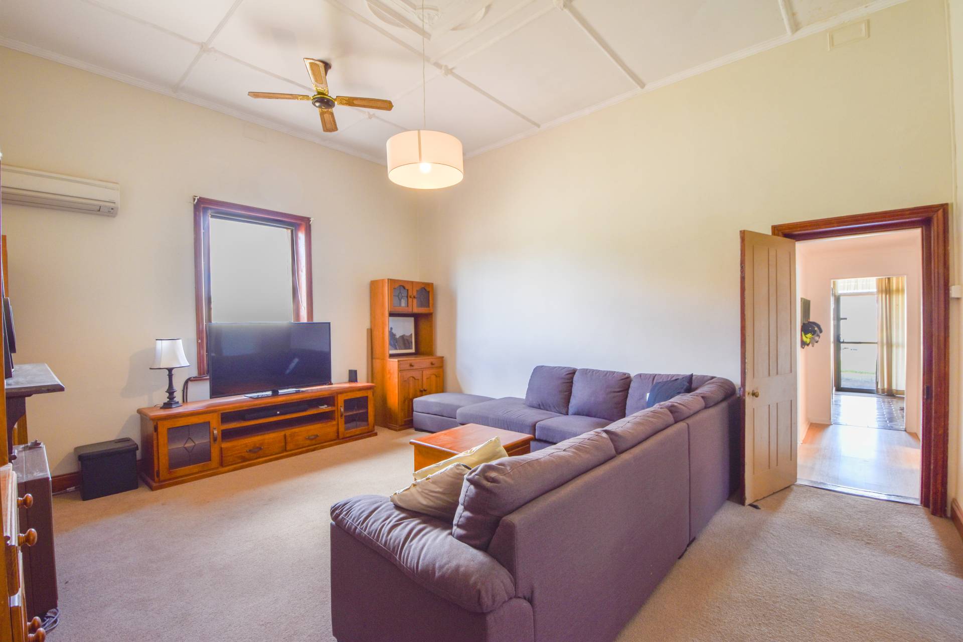 Large living room in the centre of the home, with the comforts of a reverse cycle split system air conditioner and carpet floors.