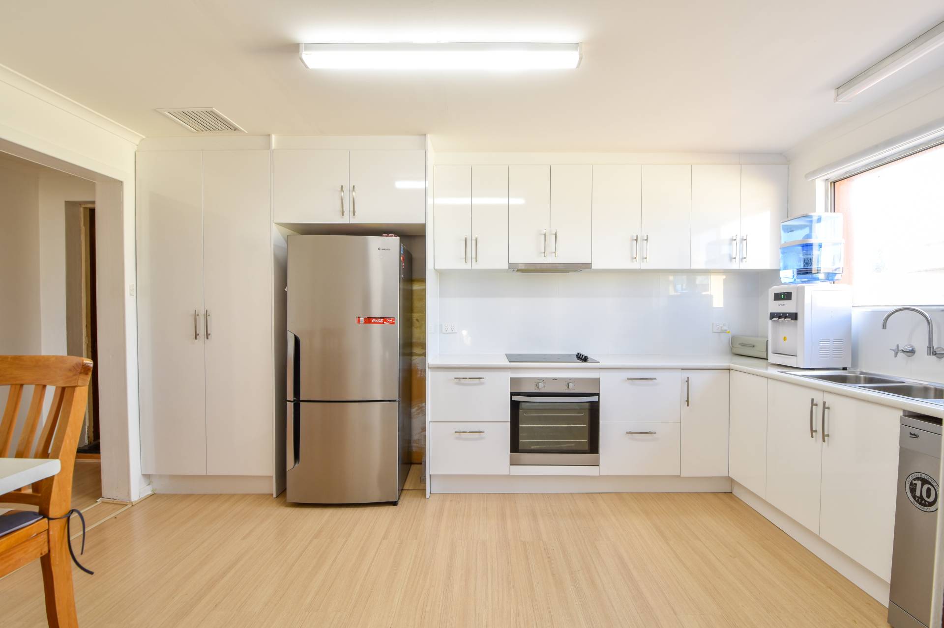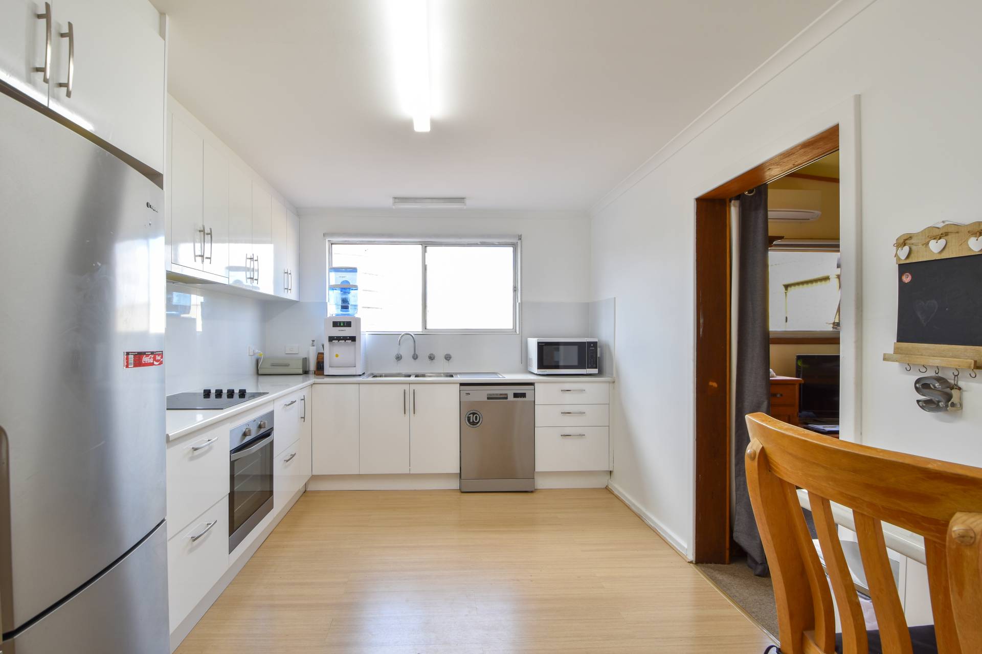 The updated kitchen with white cabinetry features an electric cooktop, stainless steel under bench oven, double sink and stainless steel dishwasher. The kitchen opens to the dining room at the rear of the home and is equipped with a split system air conditioner.