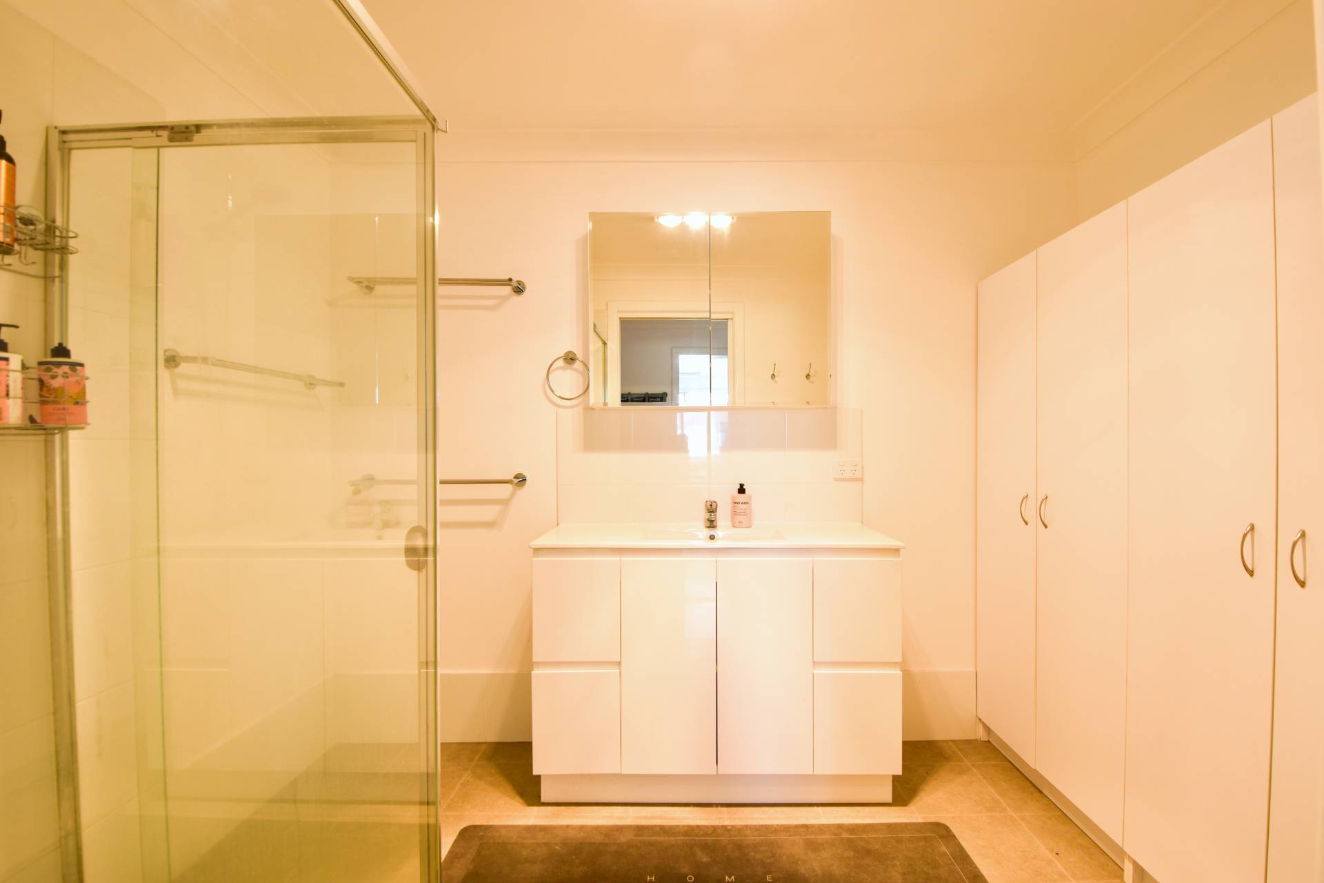 Modern bathroom with neutral finishes consisting of a large vanity, linen cupboard and shower with dual shower head. Separate toilet provides convenience alongside the laundry with a stainless steel wash trough.